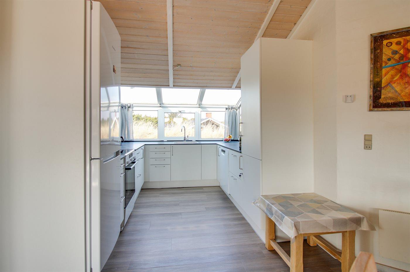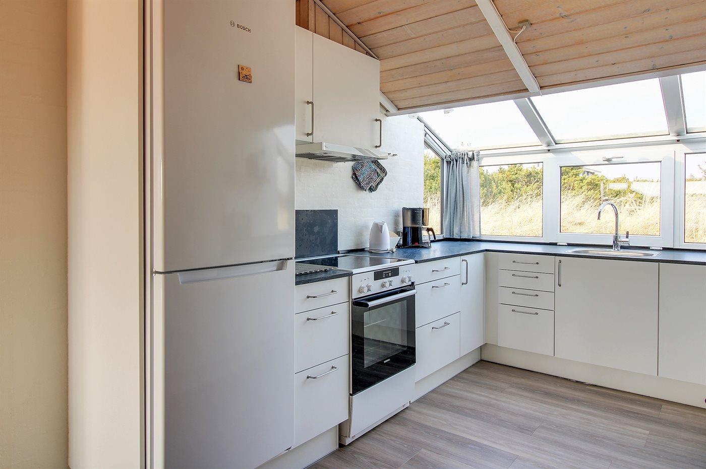 Køkkenet er udstyret med 1 køleskab. Der er 4 keramiske kogeplader, varmluftovn, mikrobølgeovn samt opvaskemaskine Der er gulvvarme i køkkenet.