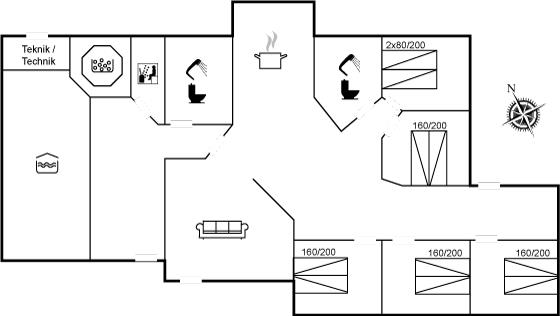Der er 2 badeværelser med bruseniche og 2 toiletter. Der er gulvvarme på 2 badeværelser. I saunaen er der mulighed for afslapning.