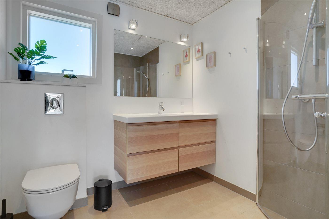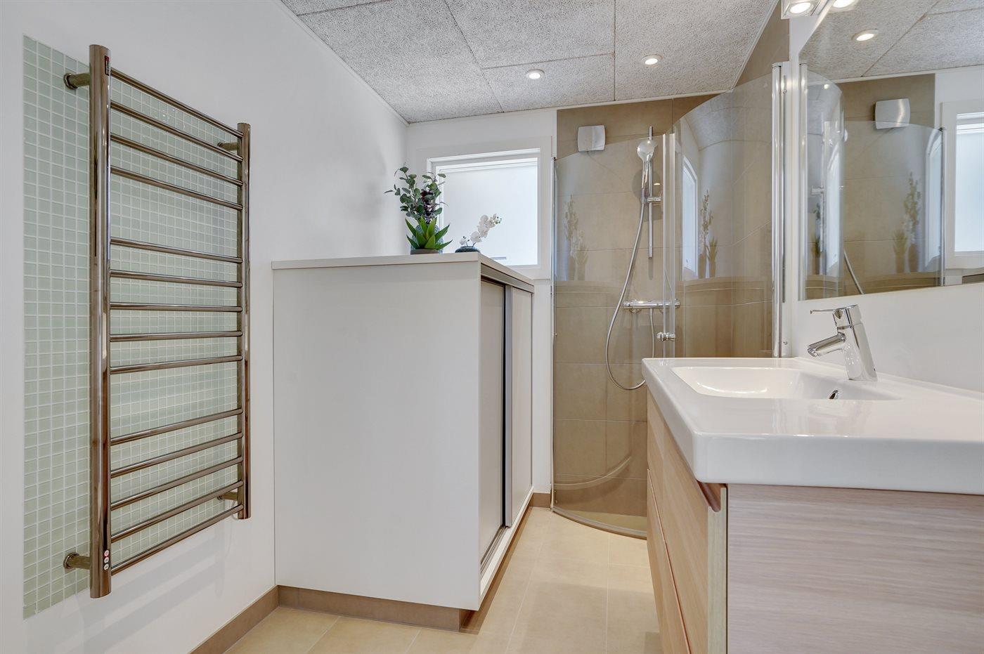 Der er 2 badeværelser med bruseniche og 2 toiletter. Der er gulvvarme på 2 badeværelser.