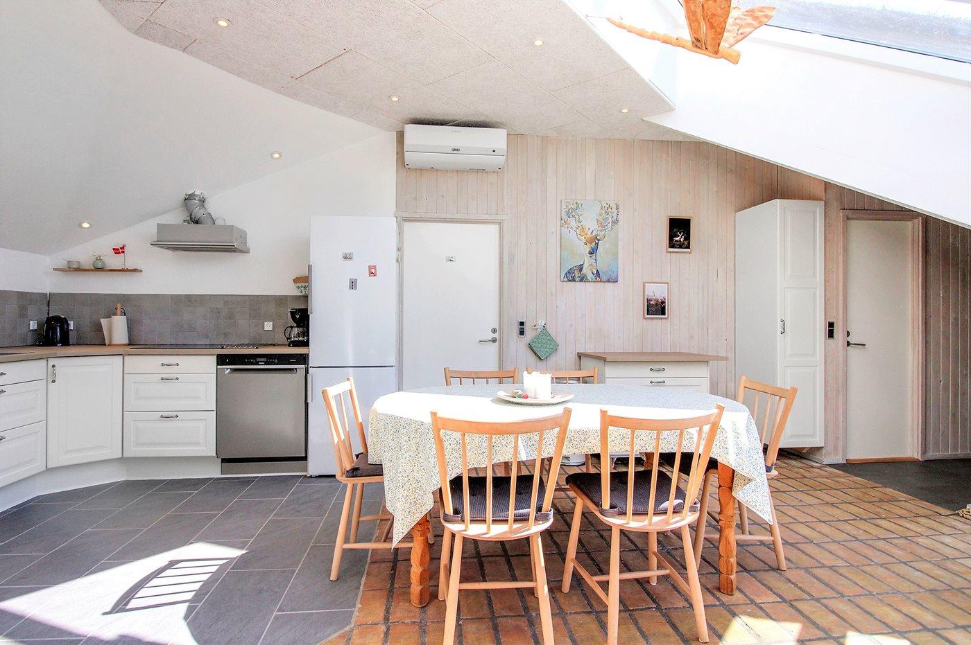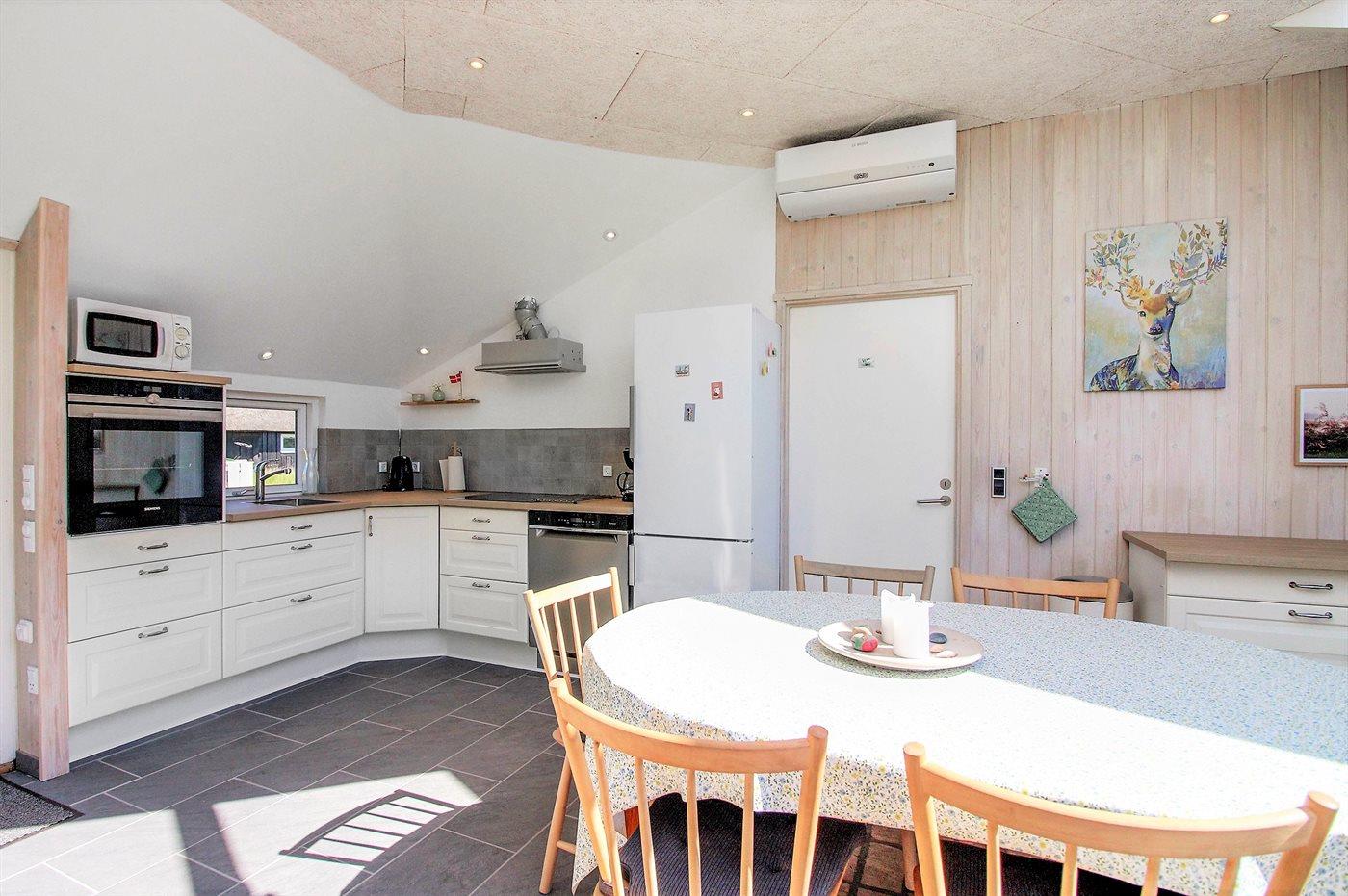Køkkenet er udstyret med 1 køleskab. Der er 4 induktionskogeplader, varmluftovn, mikrobølgeovn samt opvaskemaskine Der er gulvvarme i køkkenet.