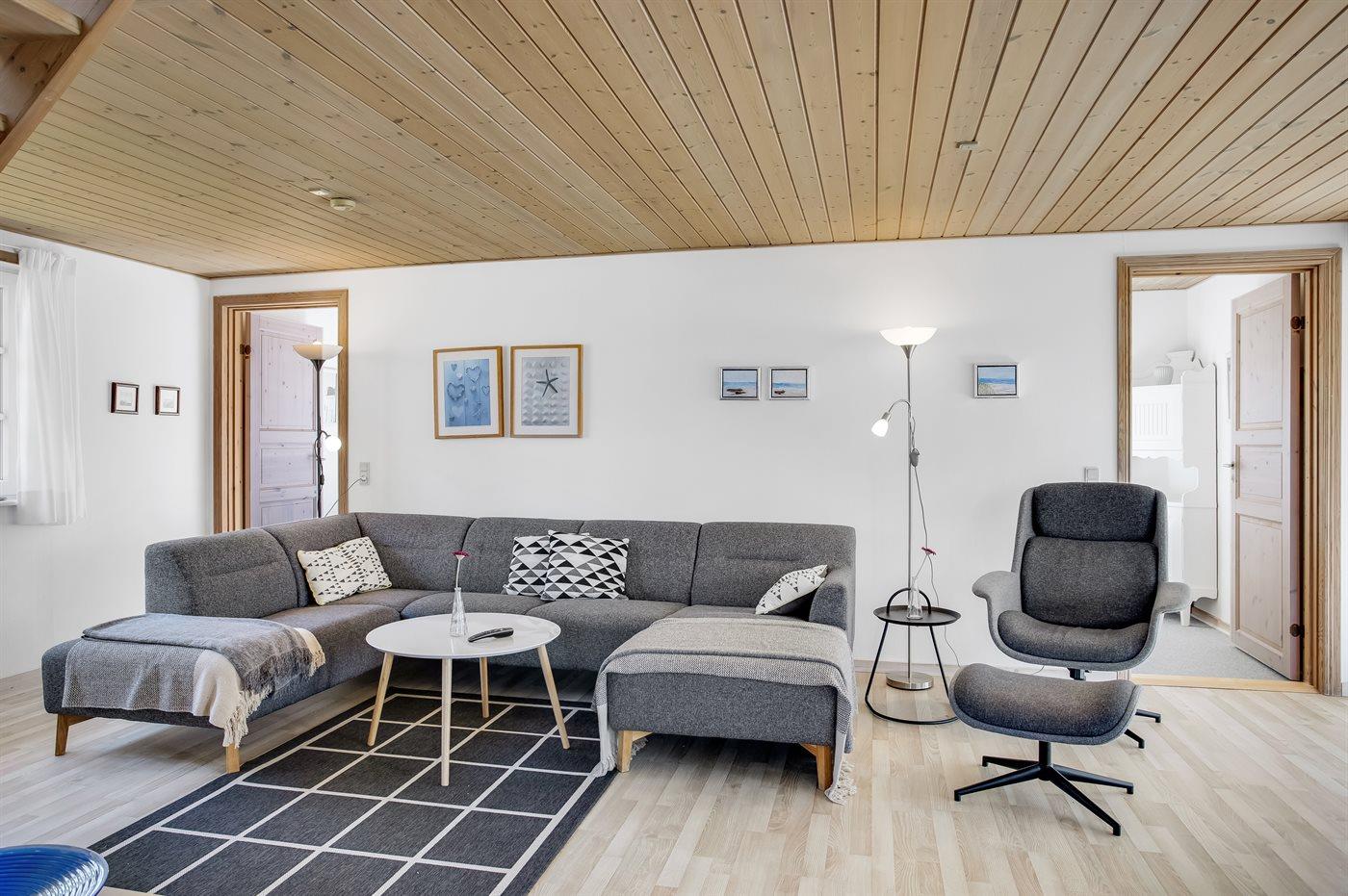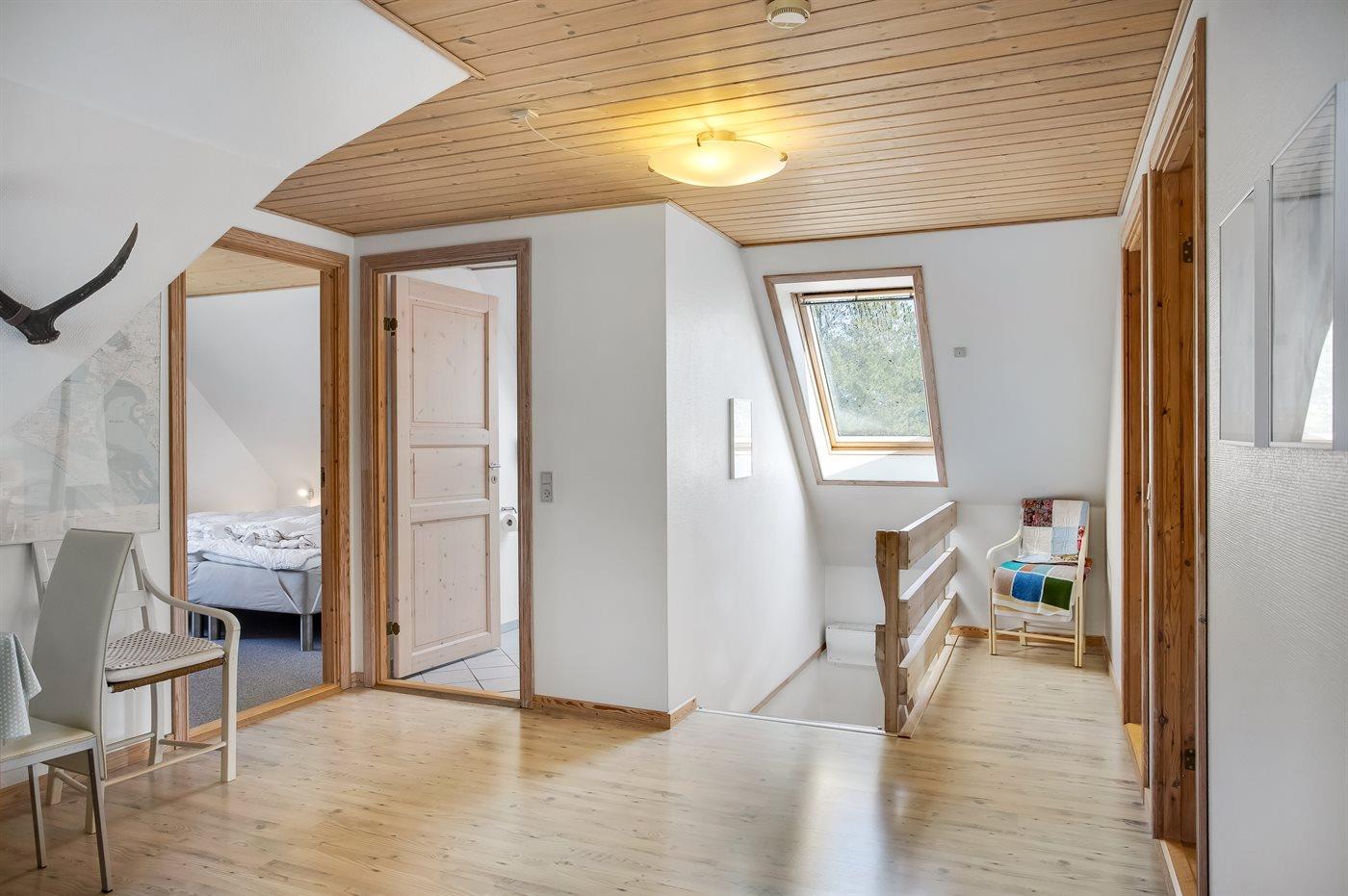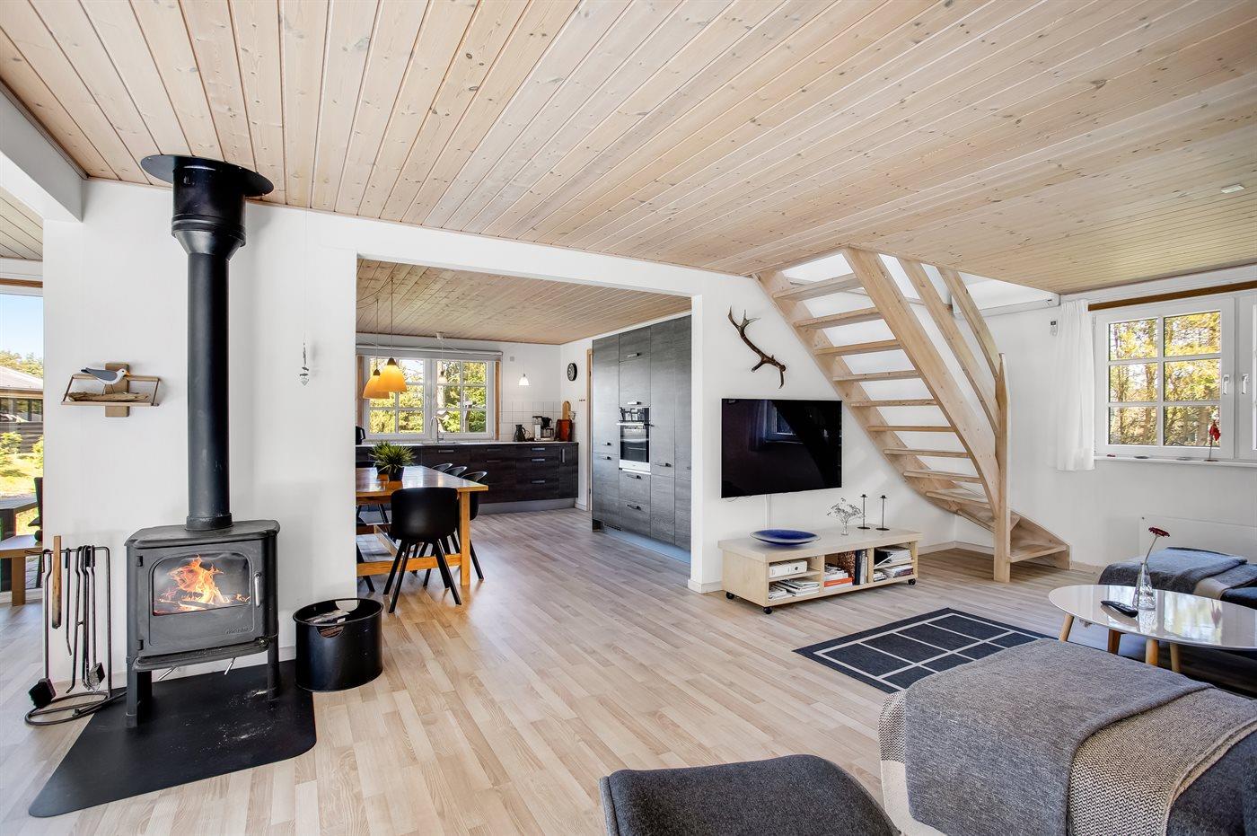 Huset har et stort køkkenalrum i forbindelse med stor lys opholdsstue med en hyggelig karnap, hvor der er udsigt over den skønne natur.