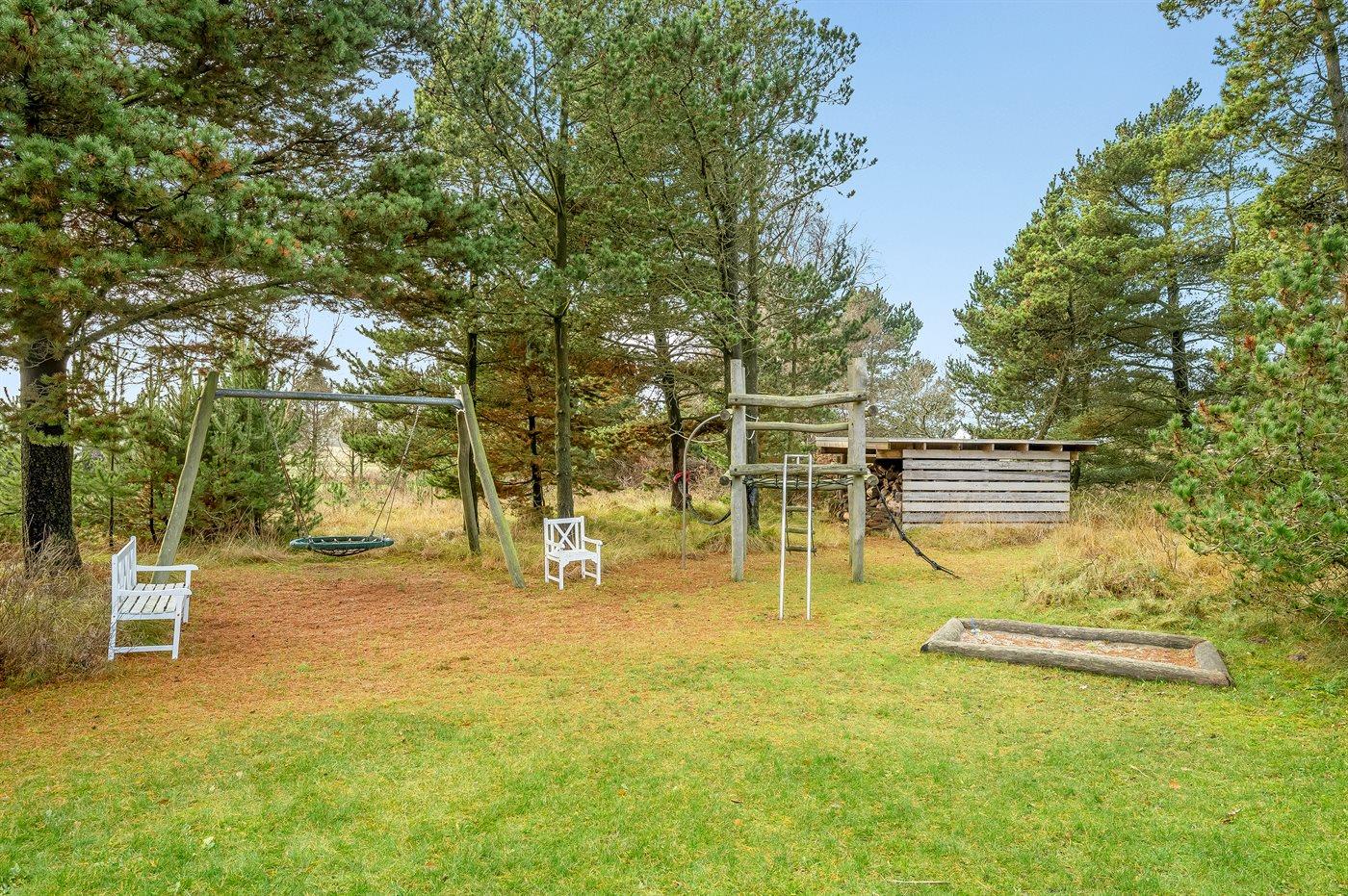 Sommerhuset ligger på en stor naturgrund, som giver masser af albuerum, privatliv og plads til leg. De mindste er der også tænkt på med gynge, sandkasse og klatrestativ, så hele familien kan være sammen på, hver deres præmisser.