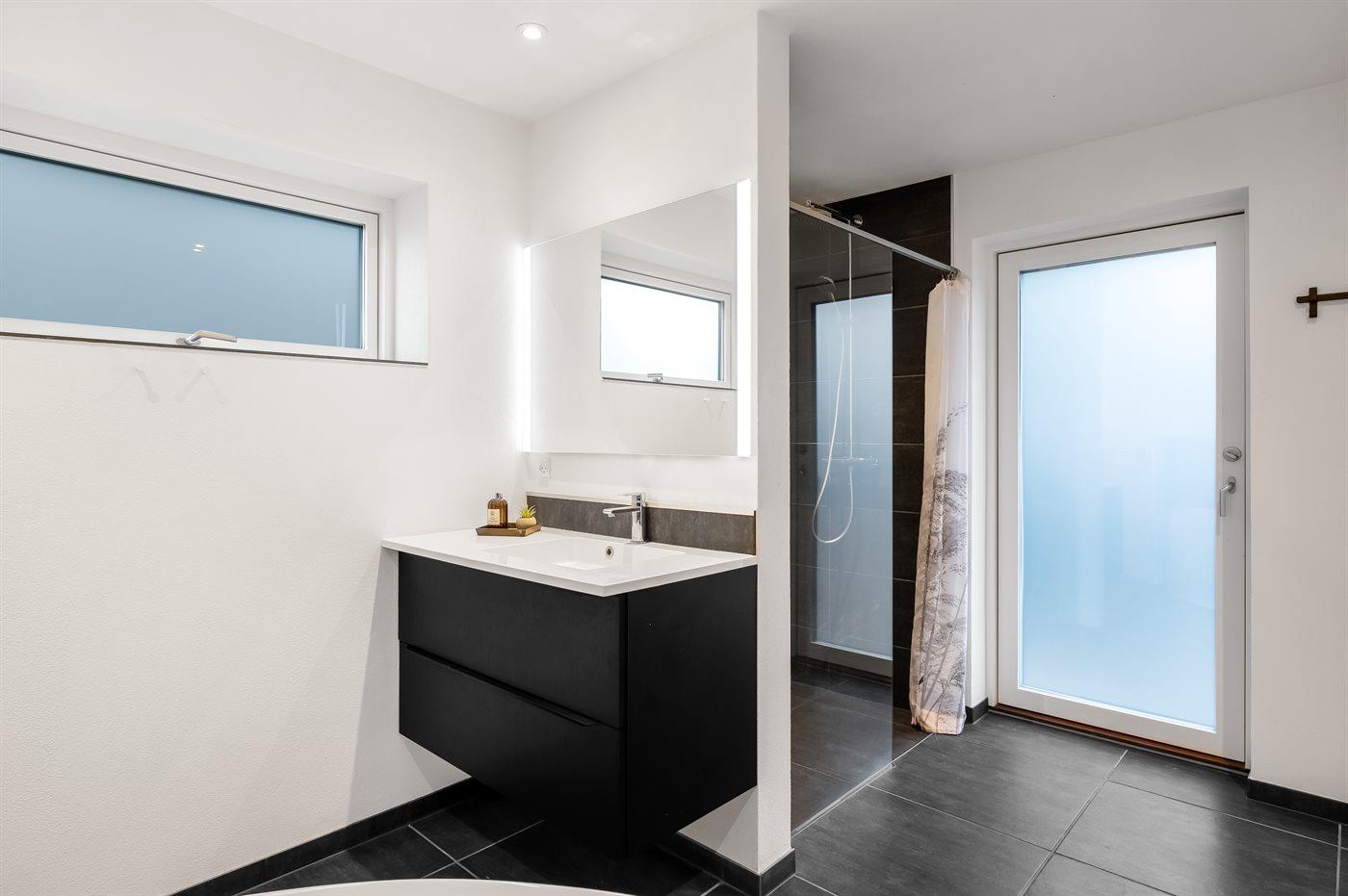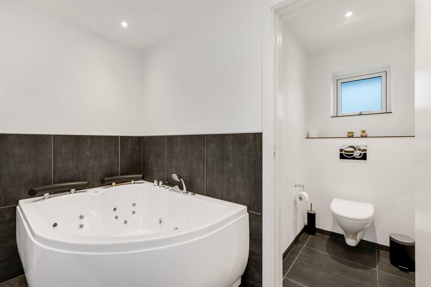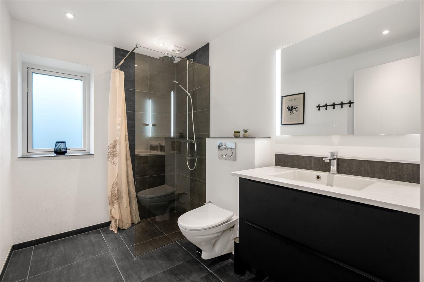 Der er 2 badeværelser med bruseniche og 3 toiletter, heraf 1 gæstetoilet. Der er gulvvarme på 2 badeværelser.