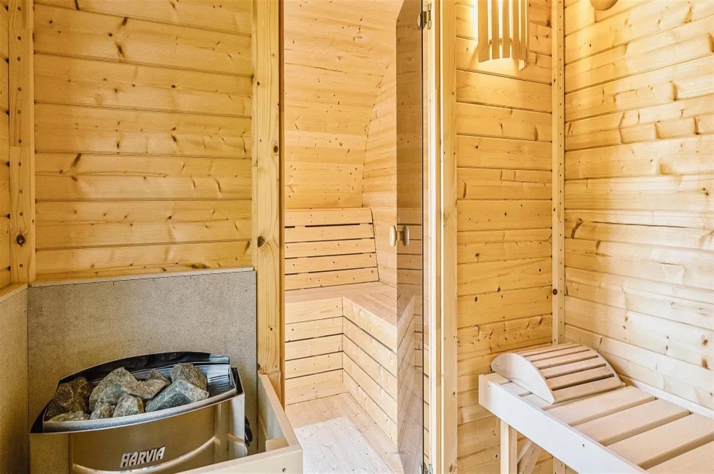 Der er mulighed for afslapning i indendørs spa til 2 personer. Der er mulighed for afslapning i det udendørs vildmarkskar til 6 personer.