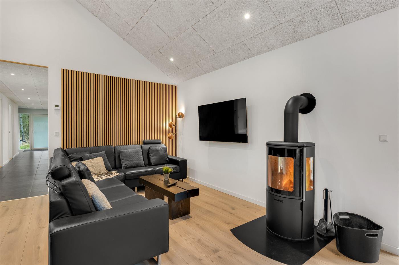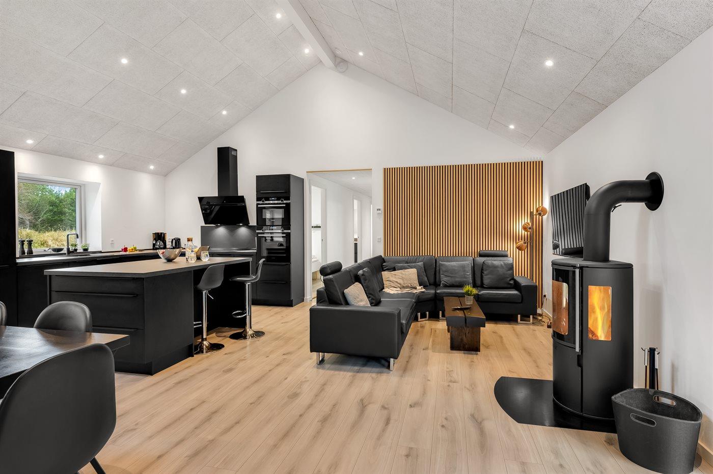 Sommerhuset byder på masser af plads og et lyst, indbydende køkken-alrum med spiseplads og brændeovn, som skaber den helt rigtige sommerhusstemning – uanset årstid.