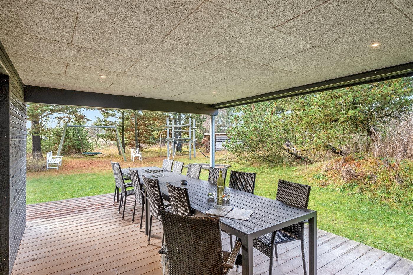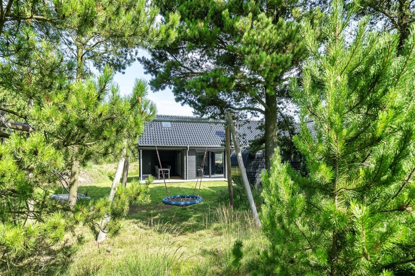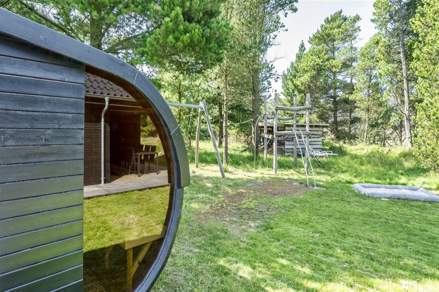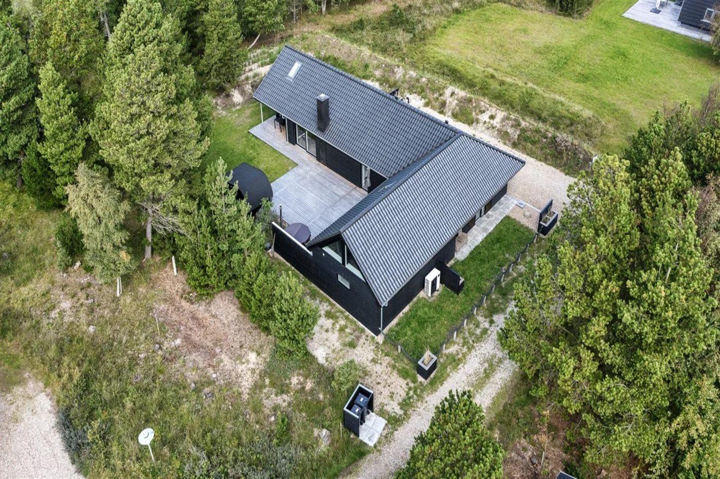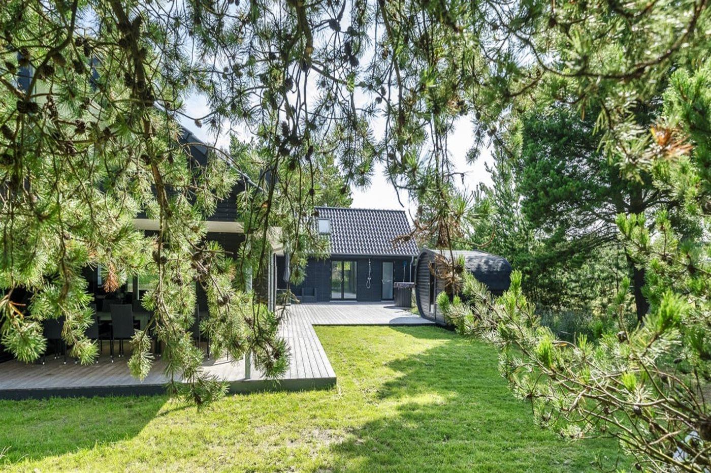 Ferieboligen er beliggende på en 1800 m² stor havegrund. Der er 1200 m til havet. Nærmeste forretning er beliggende i en afstand af 600 m. Til ferieboligen hører åbent terrasseareal. Desuden er der overdækket terrasse. Sandkasse. Legetårn. Bålsted. Udendørs sauna. Udendørs bruser. Grill til rådighed. Der er installeret stik til opladning af elbil. Type 2 stik. Med 11 kW ladeeffekt. Parkering ved ferieboligen.