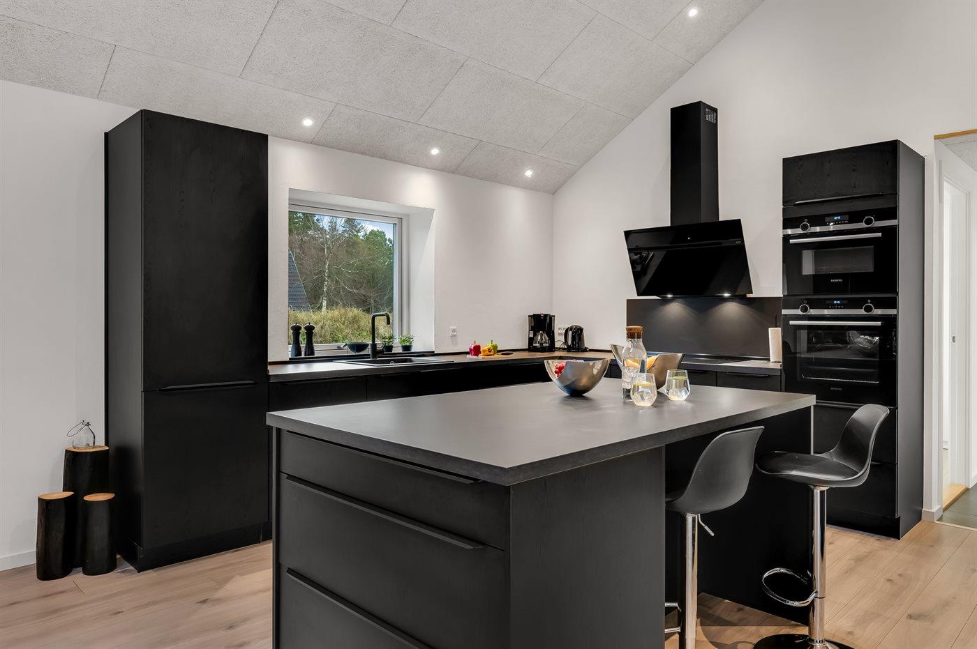 Køkkenet er udstyret med 1 køleskab. Der er 4 keramiske kogeplader, varmluftovn, mikrobølgeovn samt opvaskemaskine.