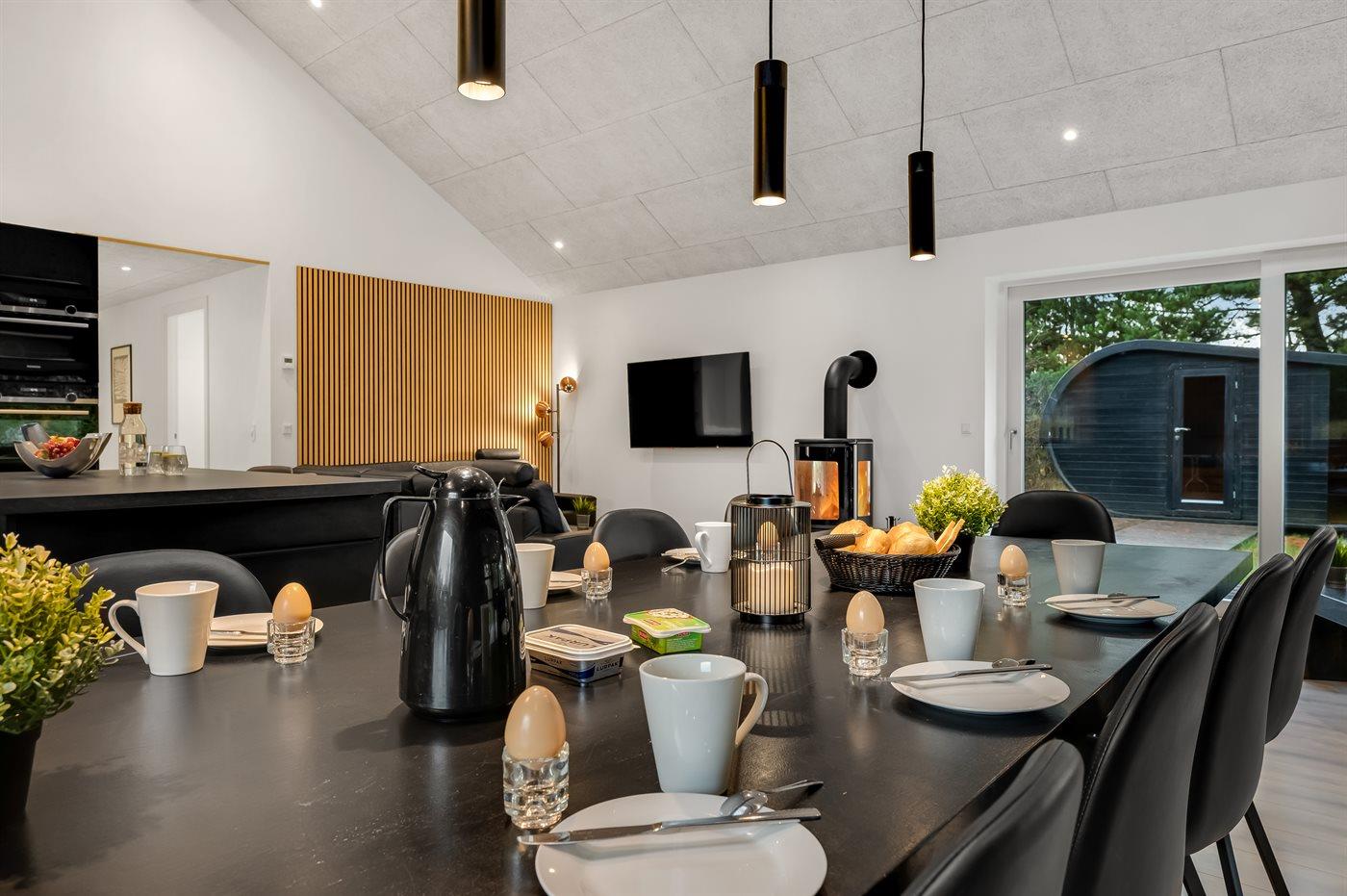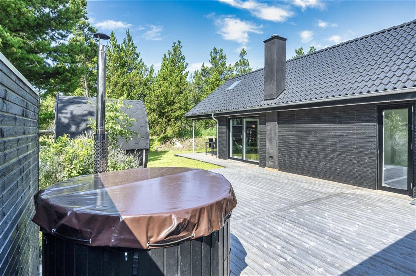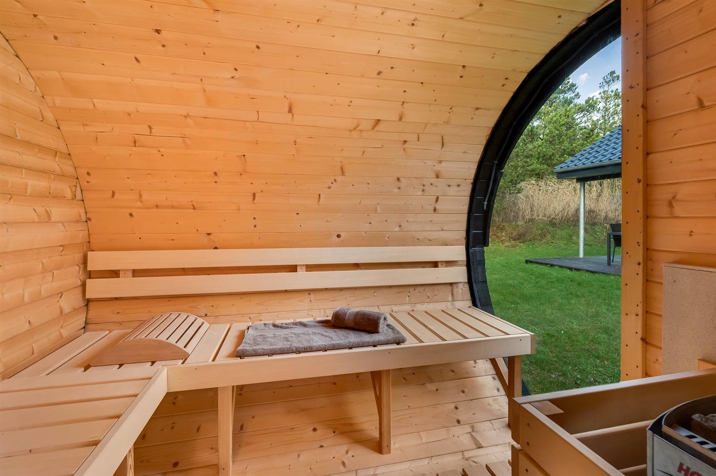 Udendørs venter en stor, delvist overdækket træterrasse med både læ, sol og plads til afslapning. Her kan I nyde ren velvære i det udendørs vildmarkskar, saunatønden og udebruseren – ideelt efter en dag på stranden eller i den omkringliggende natur. Indenfor finder I et spabad til to personer, klar til stille stunder og ekstra forkælelse.