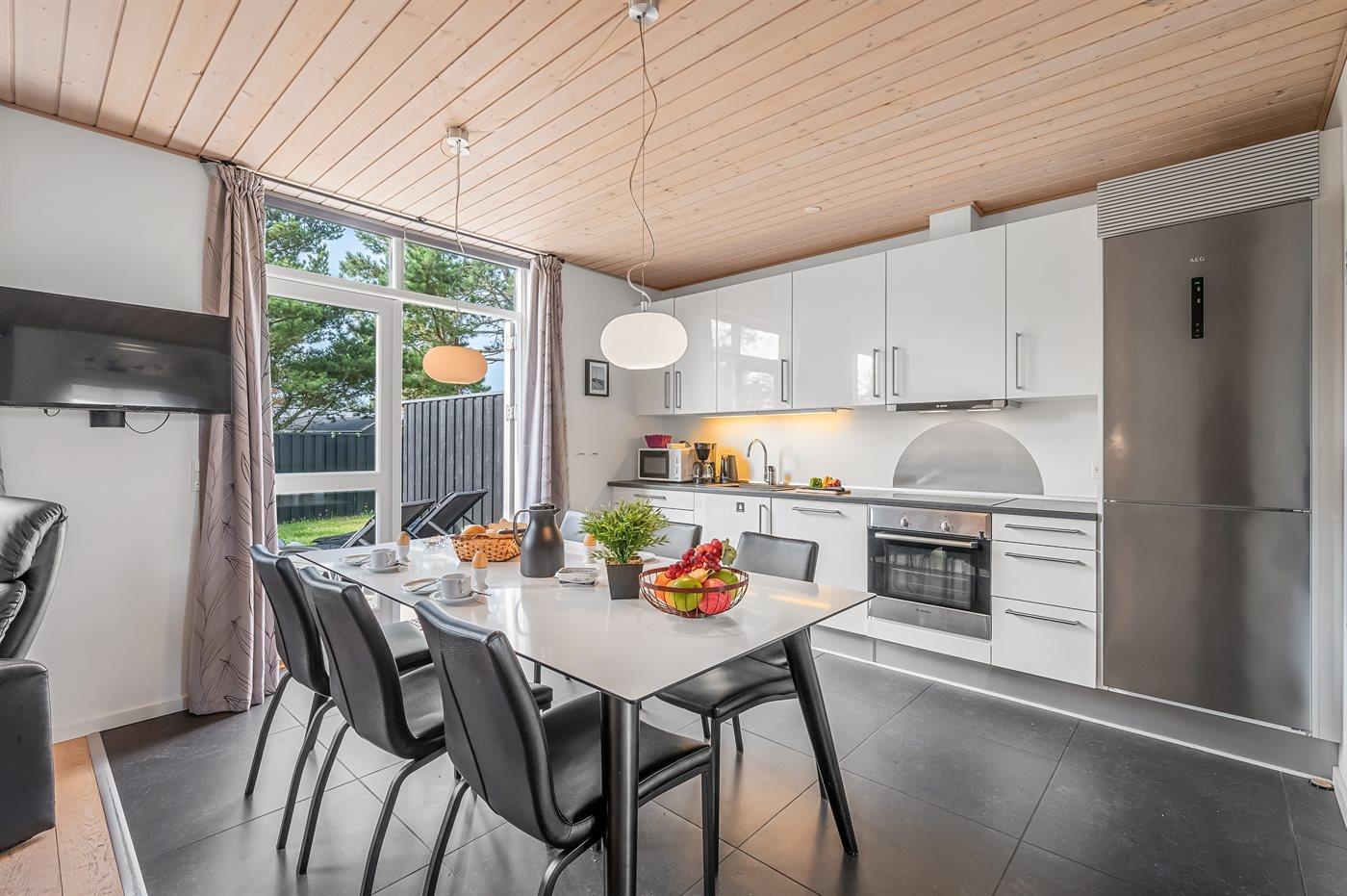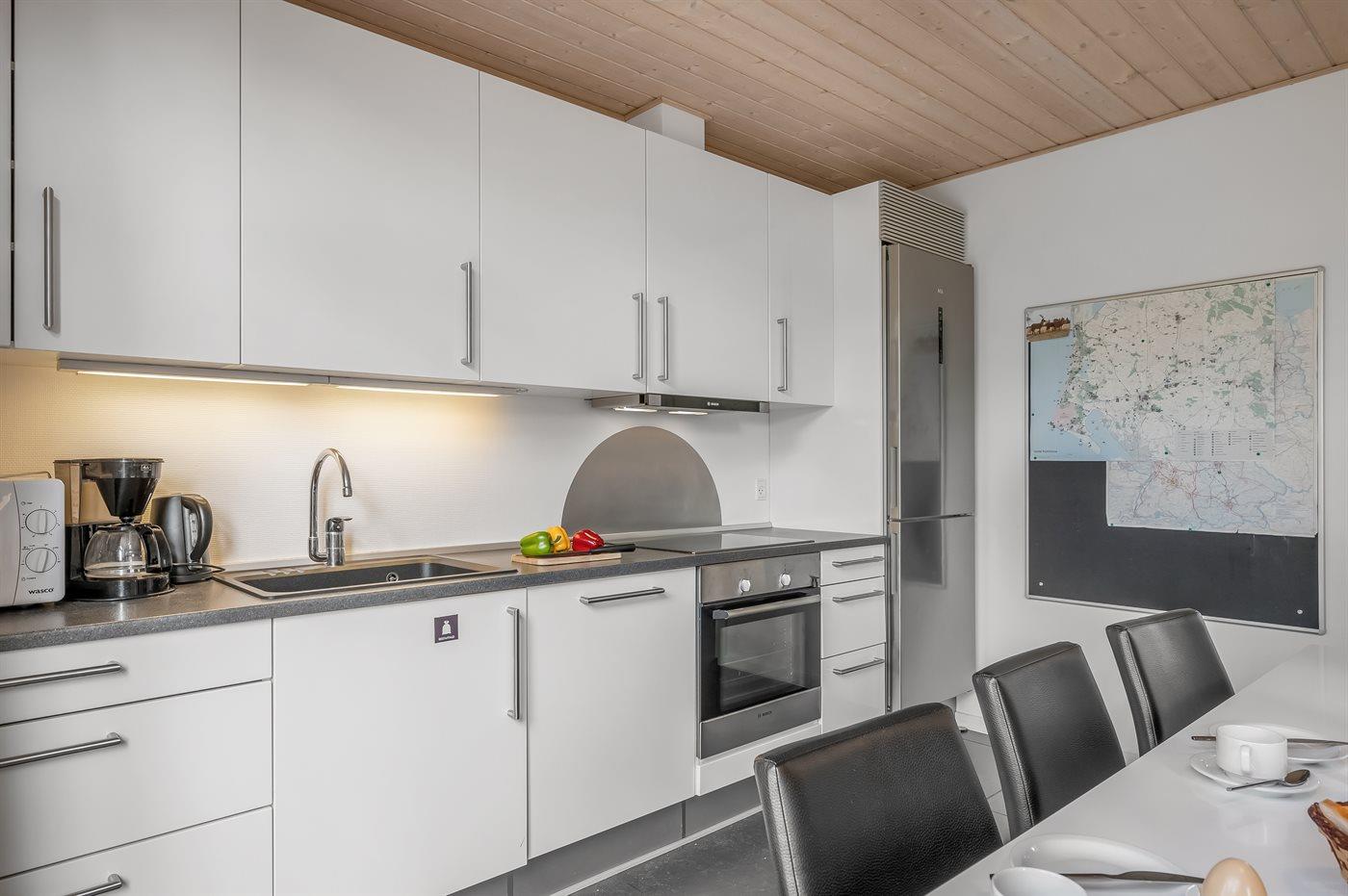 Køkkenet er udstyret med 1 køleskab. Der er 4 keramiske kogeplader, varmluftovn, mikrobølgeovn samt opvaskemaskine.