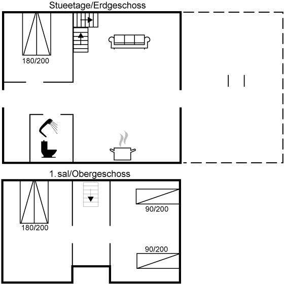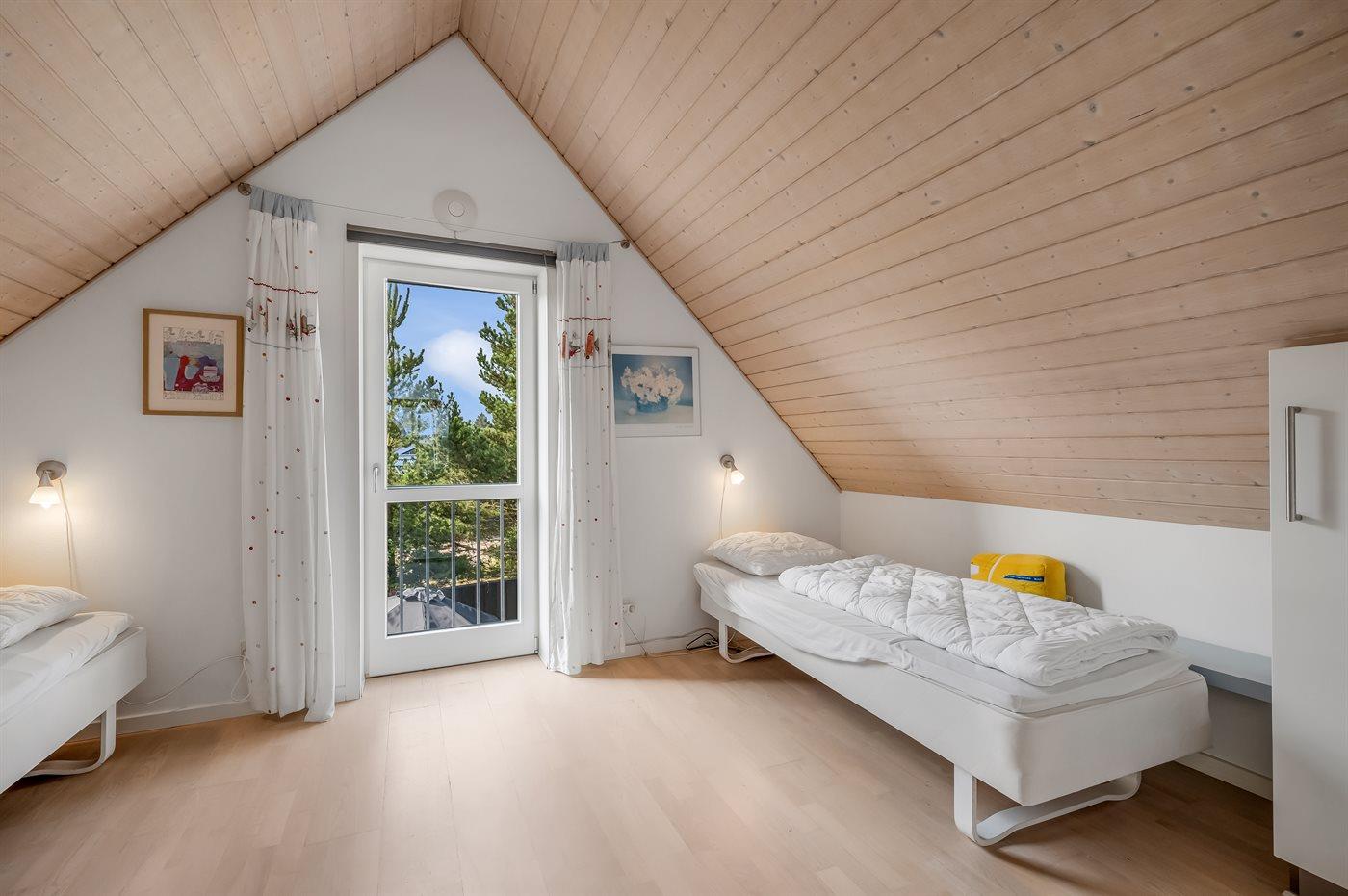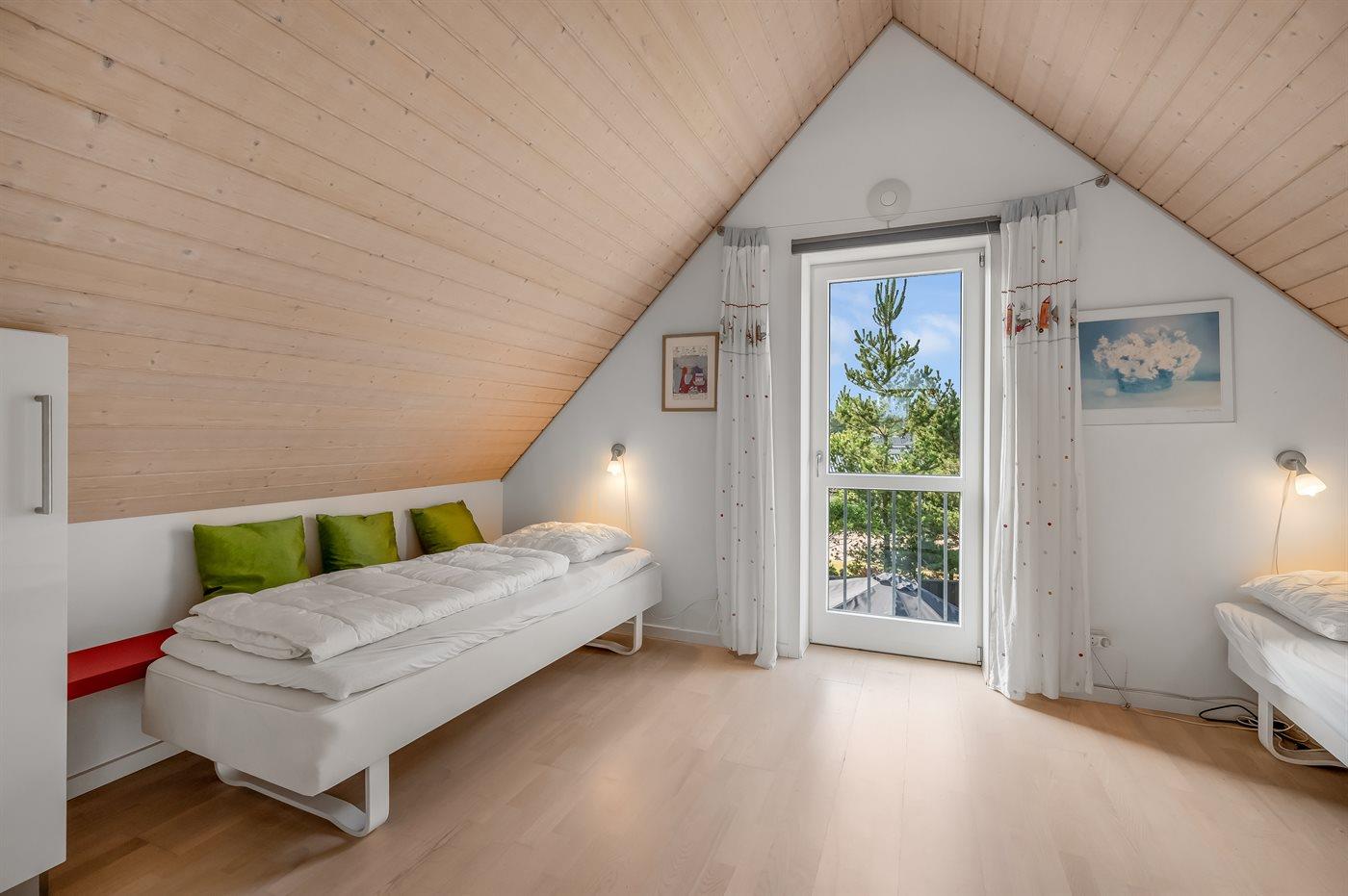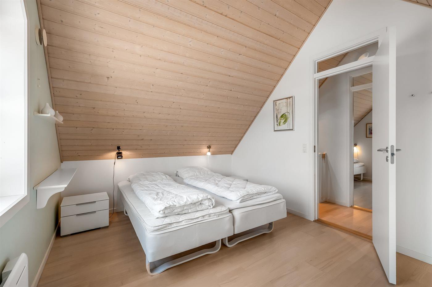 Der er i alt 3 soveværelser. Sovepladserne fordeler sig på: 4 sovepladser i dobbeltsenge. 2 sovepladser i enkeltsenge. Derudover er der 1 stk. barneseng.