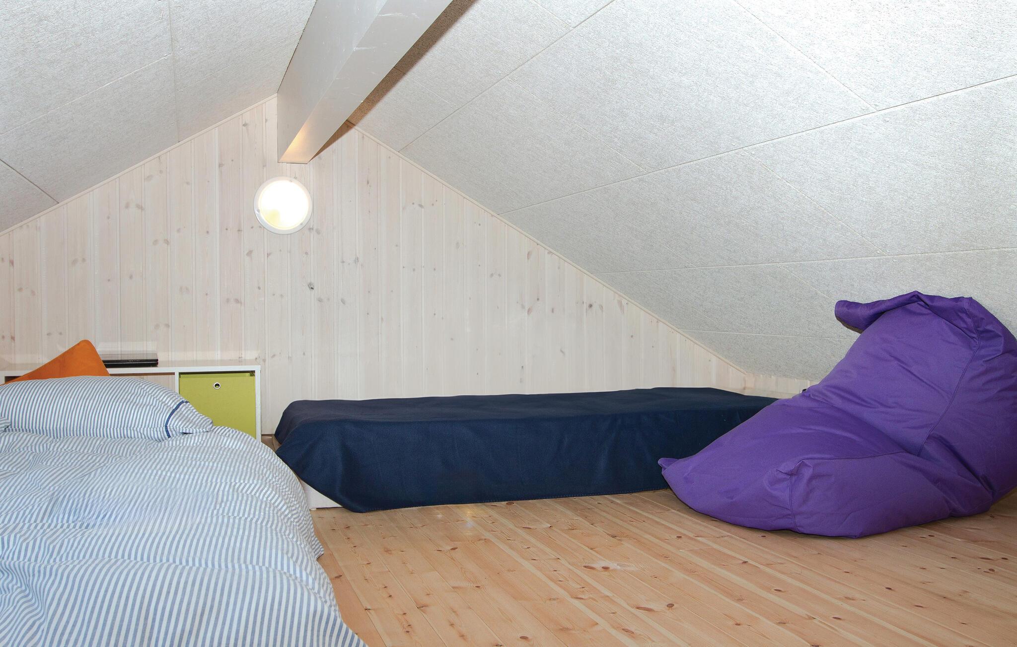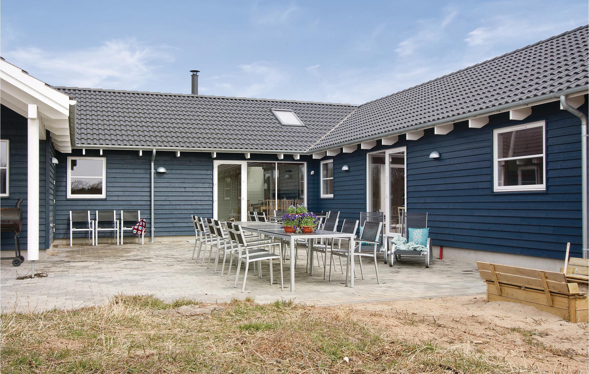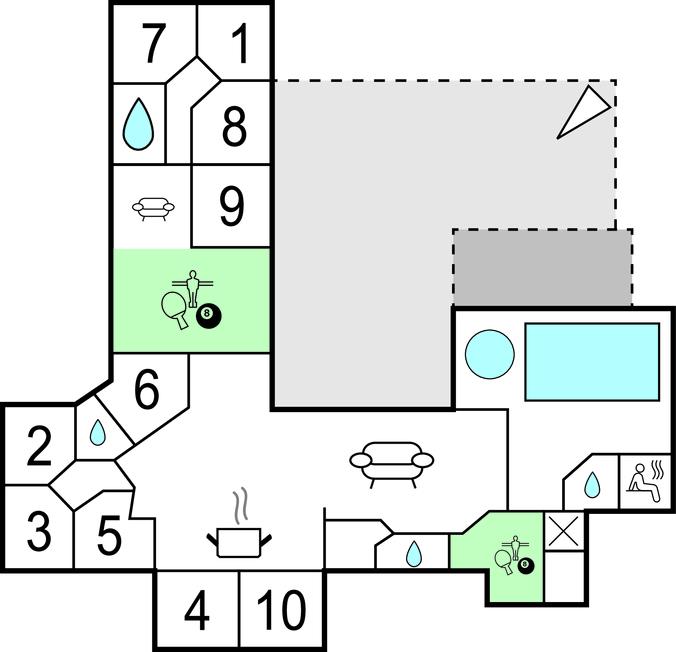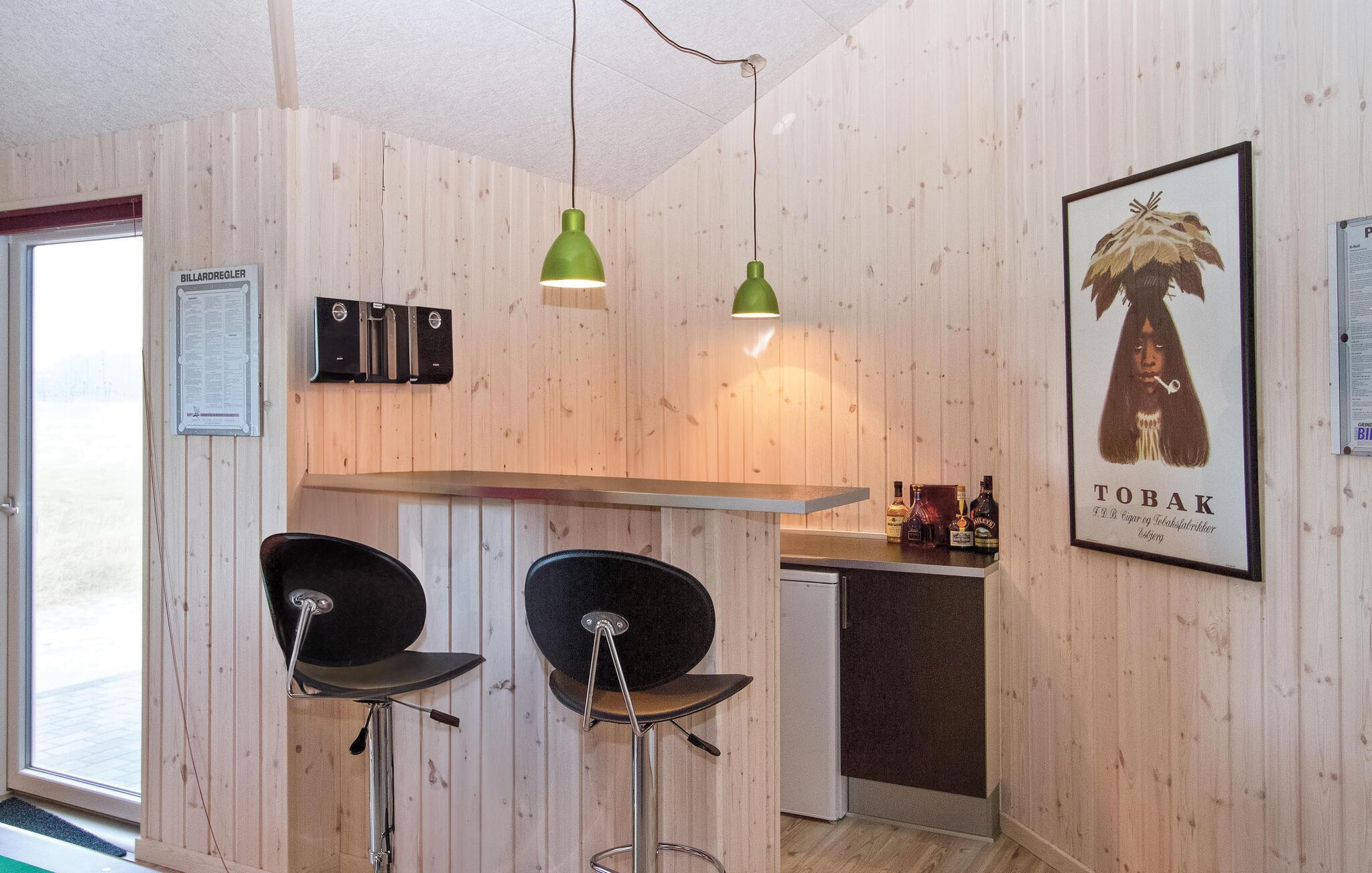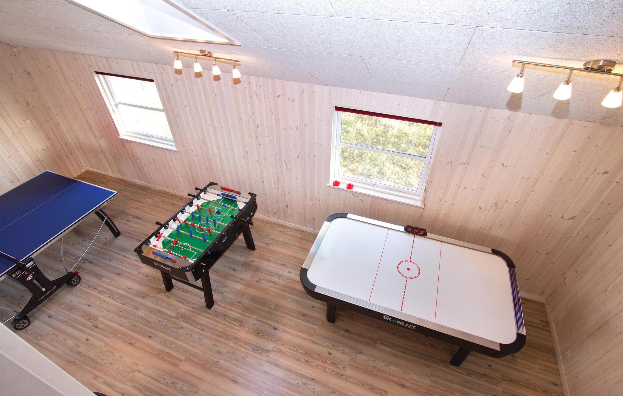 I feriehuset er alt optimeret til at forkæle mange gæster. Ti flotte og rummelige værelser i tre afdelinger med hver sit badeværelse og fire madrasser på en stor og højloftet hems. Stor stue med brændeovn samt meget rummeligt køkken/alrum med direkte udgang til en delvis overdækket terrasse. Desuden en aktivitetshems samt to aktivitetsrum, der er store nok til både flere aktivitetsmuligheder som billard, dart, bar, bordtennis, bordfodbold, airhockey og spillekonsol.