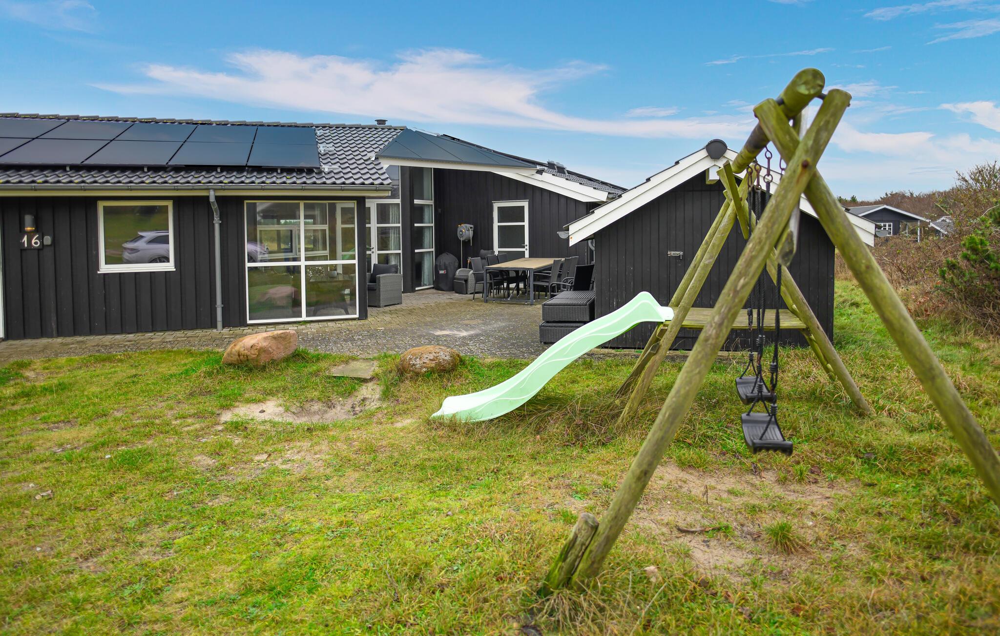 Gå ud på den afskærmede terrasse, og brug de behagelige havemøbler til rolige stunder på den dejlige naturgrund i den friske vesterhavsluft. Gyngerne og rutsjebanen indbyder børn til sjov og leg.
