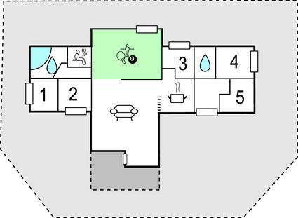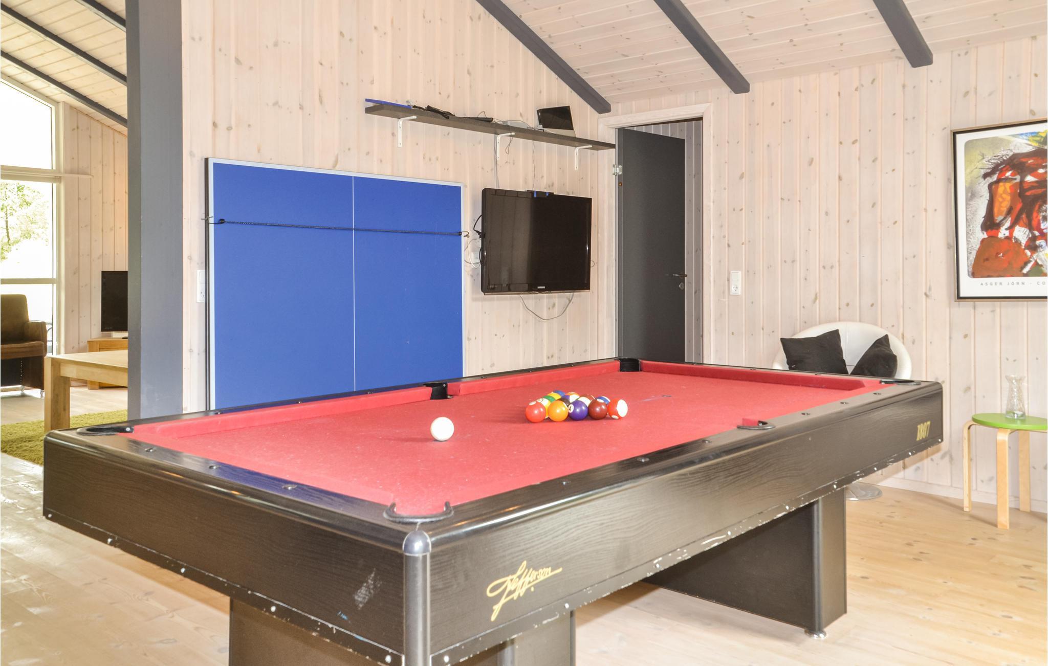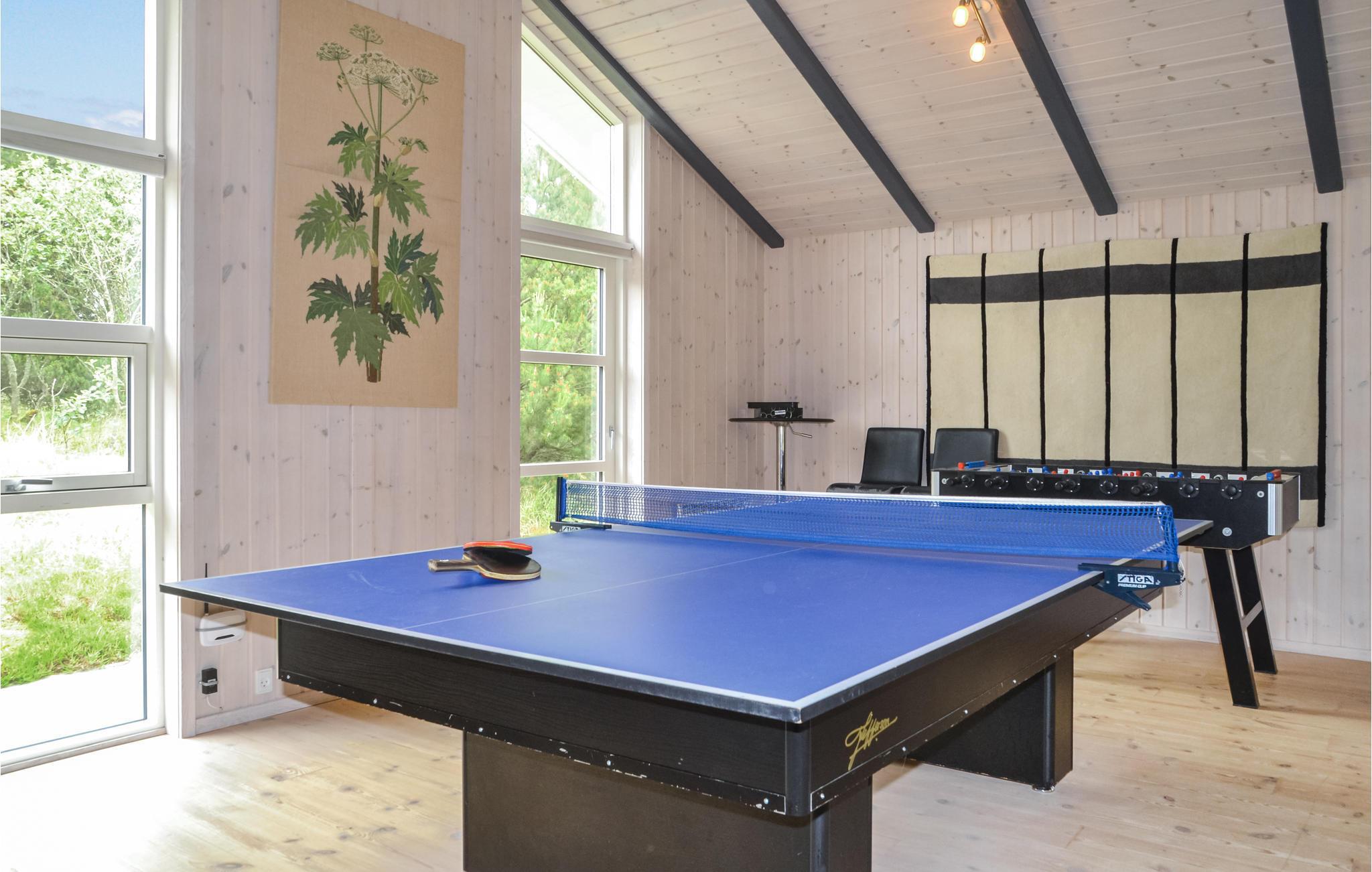 Rigtig hyggelig og velholdt aktivitetssommerhus med bl.a. bordtennis, poolbord og bordfodbold. Sommerhuset er yderst praktisk indrettet med et rummeligt køkken/alrum indeholdende et stort spisebord med plads til alle og en hyggelig sofaafdeling, hvorfra der er adgang til aktivitetsrummet. Alle soveværelser er rummelige og i de største af de to badeværelser findes et spabad og adgang til saunaen. Omkring sommerhuset er der flere gode og læfulde, delvis overdækkede terrasser, og den store naturgrund har en ugenert beliggenhed. På grunden findes desuden trampolin, petanquebane, sandkasse og grill.