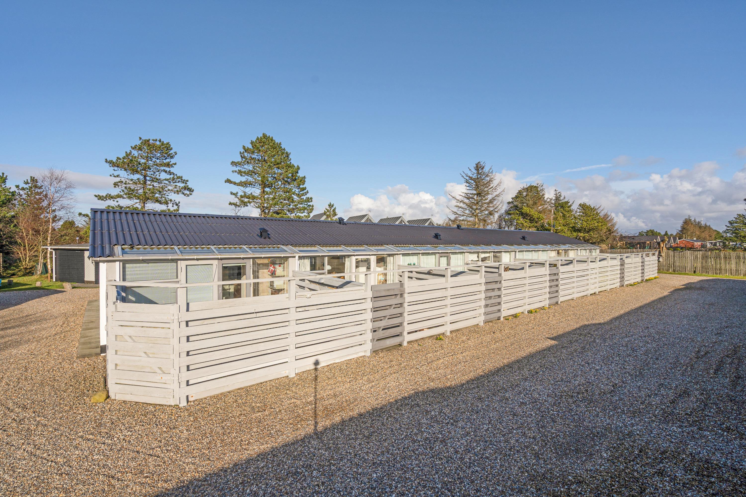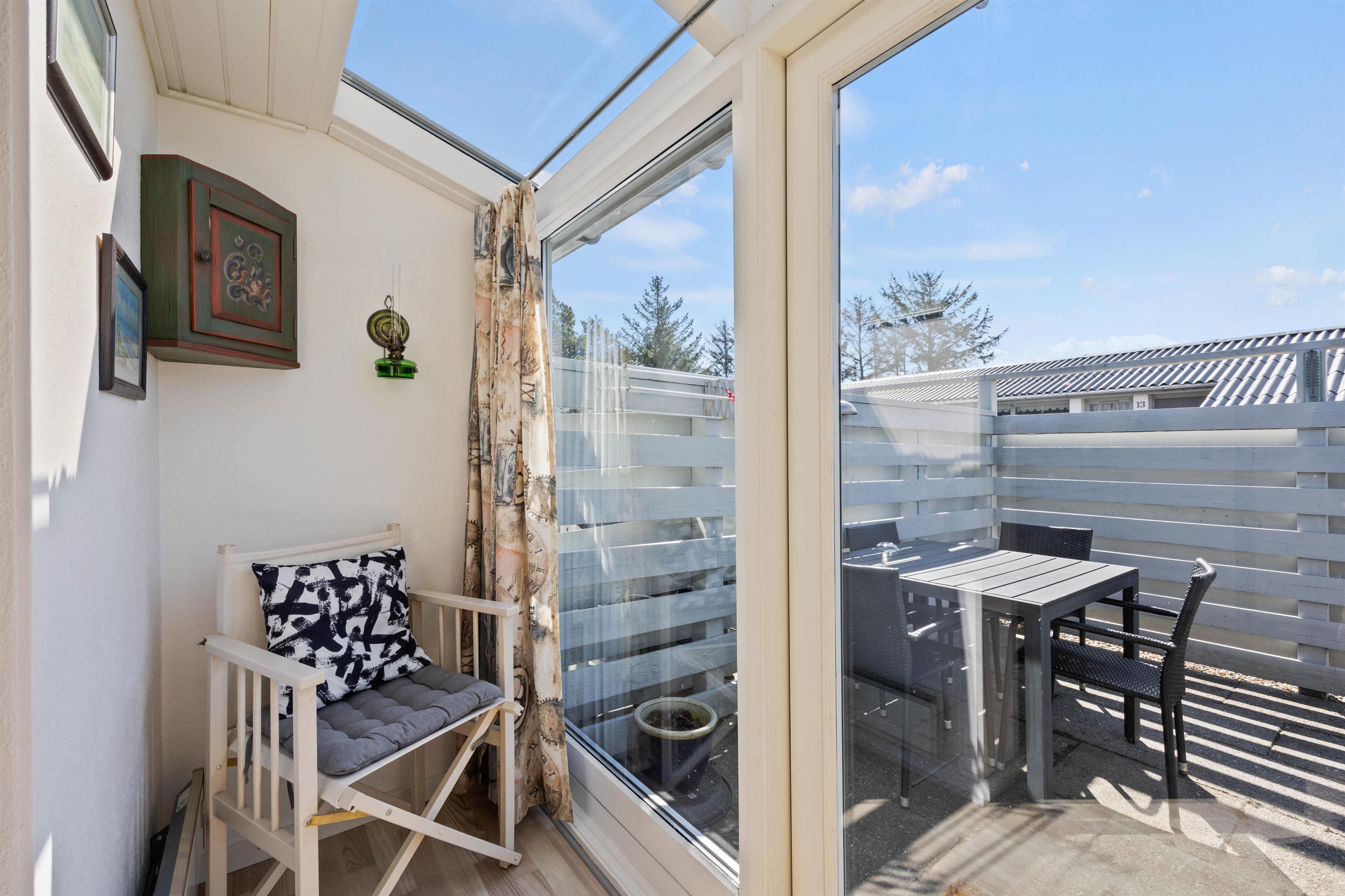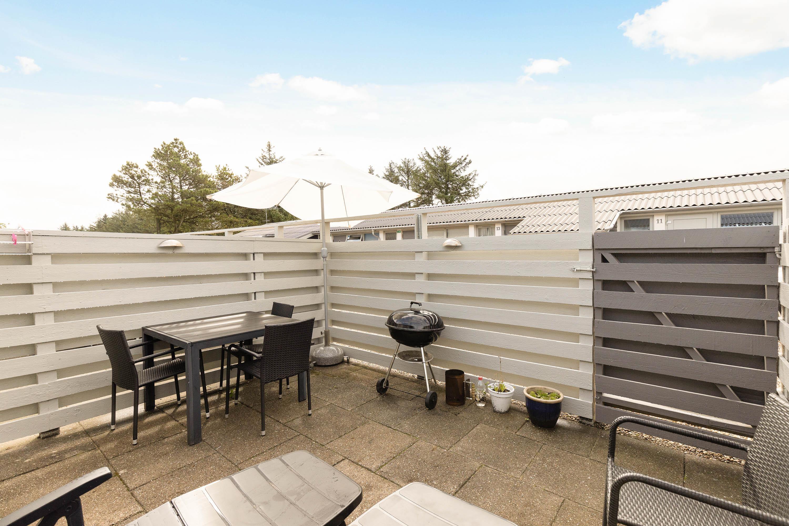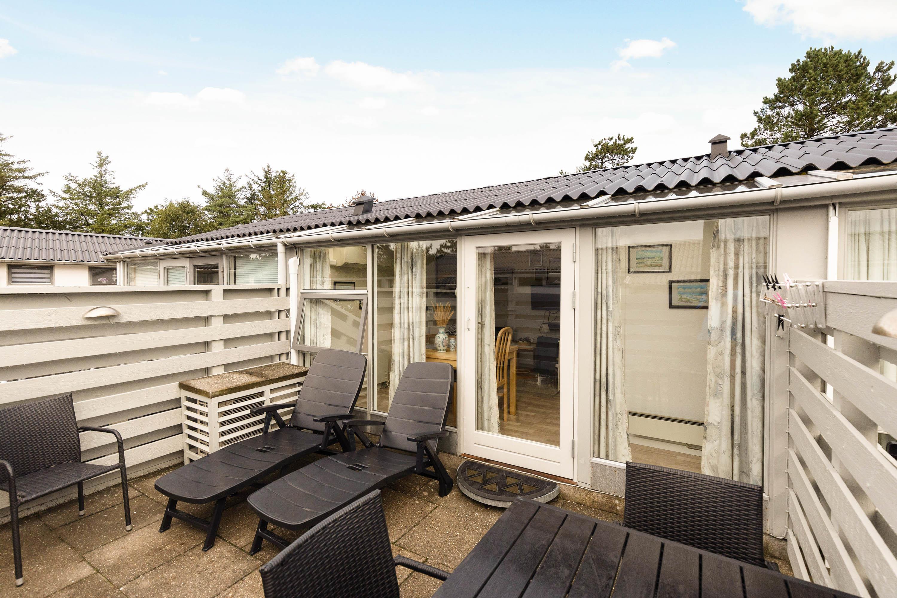 Fra ferielejlighedens alrum kan I træde direkte ud på den afskærmede, lukkede terrasse, hvor der står havemøbler og liggestole klar, som I kan sætte jer godt til rette i på de solrige feriedage, mens I nyder varmen og bare slapper helt af.