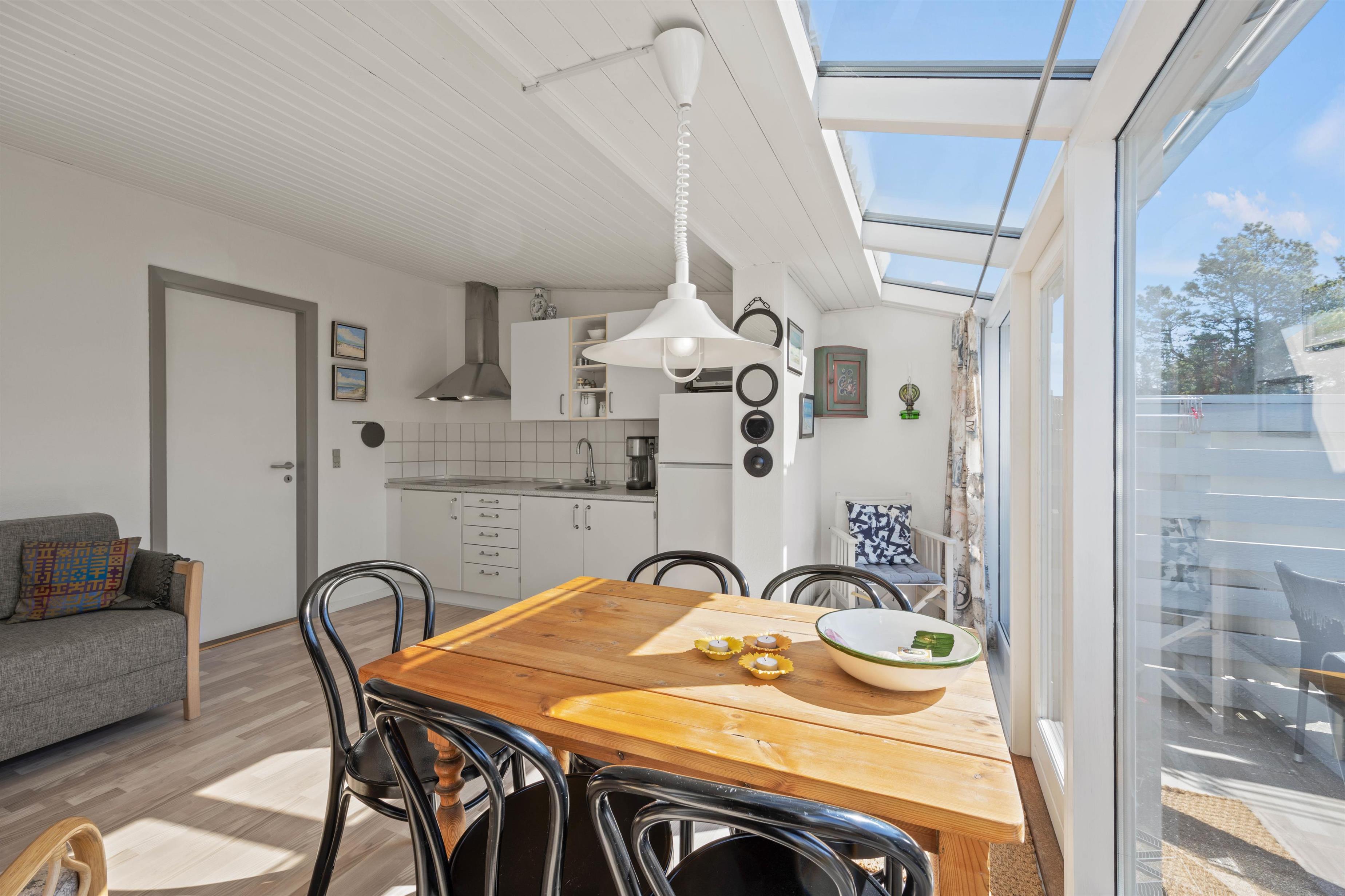 I ferielejligheden er køkken, stue og spiseplads samlet i ét rum, og rammerne er derfor sat for mange hyggelige feriestunder, hvor I sammen kan lave mad i køkkenet, spille spil omkring spisebordet eller se film i tv’et. Her har I desuden en varmepumpe, der på energivenlig vis sørger for et godt indeklima.