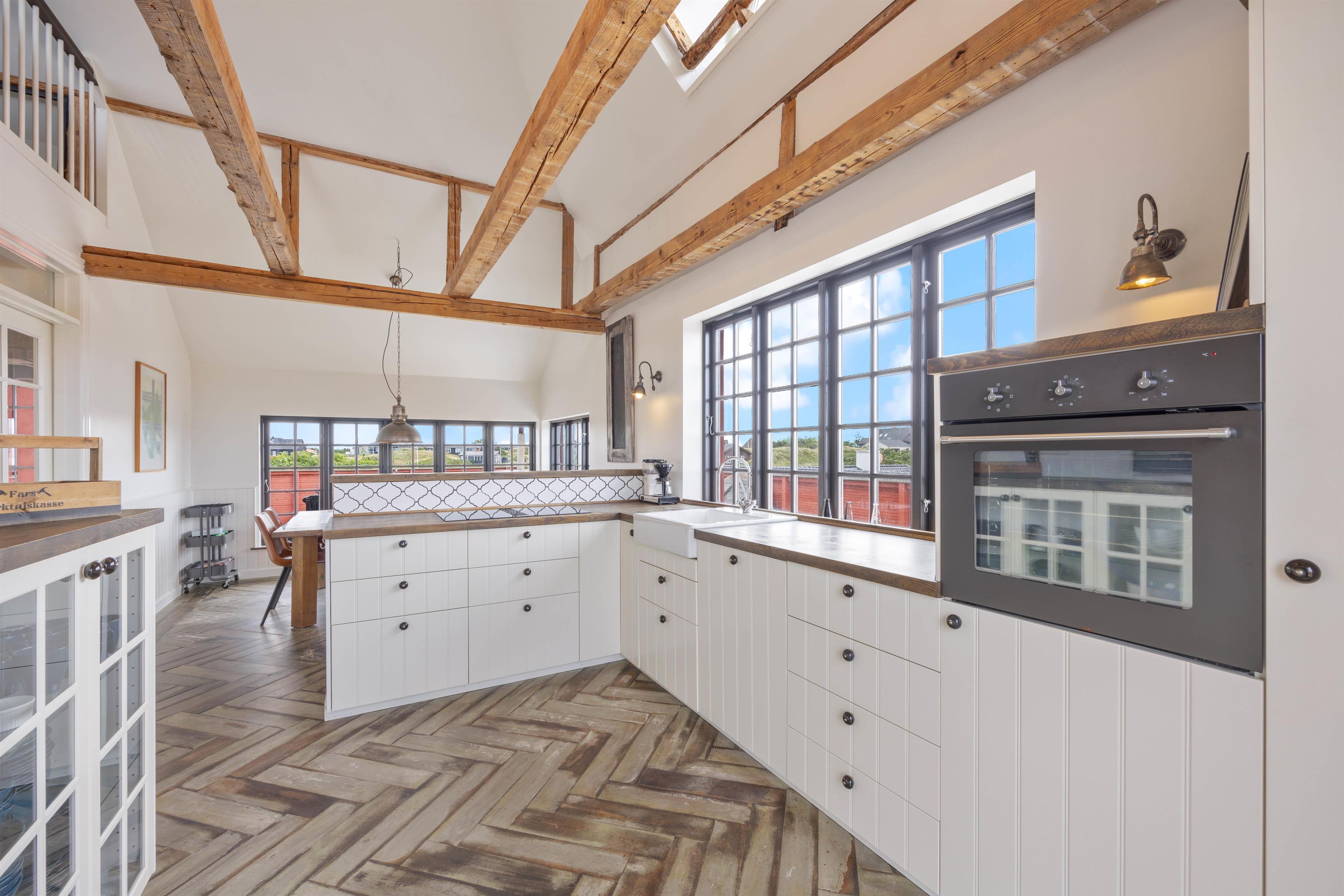 I stueetagen finder I ét af sommerhusets hjerterum - det åbne opholdsrum, hvor stue og landkøkken smelter sammen. I det veludstyrede køkken kan I fremtrylle lækre retter, som samler familien omkring det store spisebord, mens den bløde sofa indbyder til hyggelige filmaftner tæt på brændeovnen, som spreder hygge og varme på de køligere aftner.