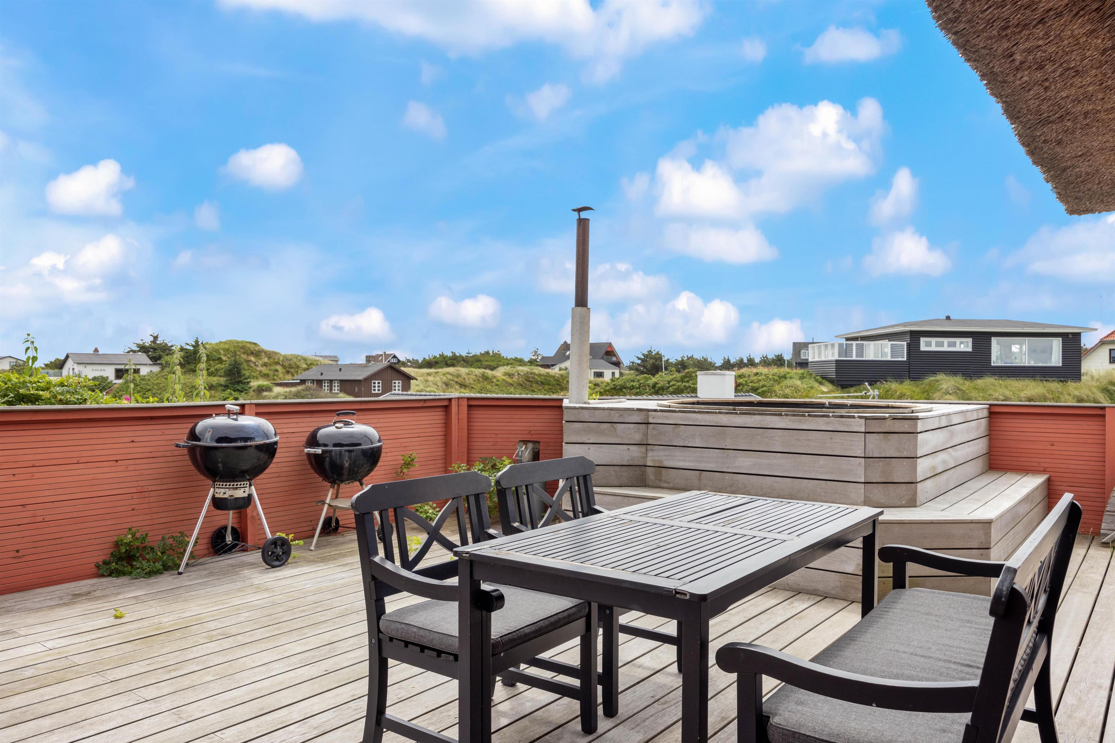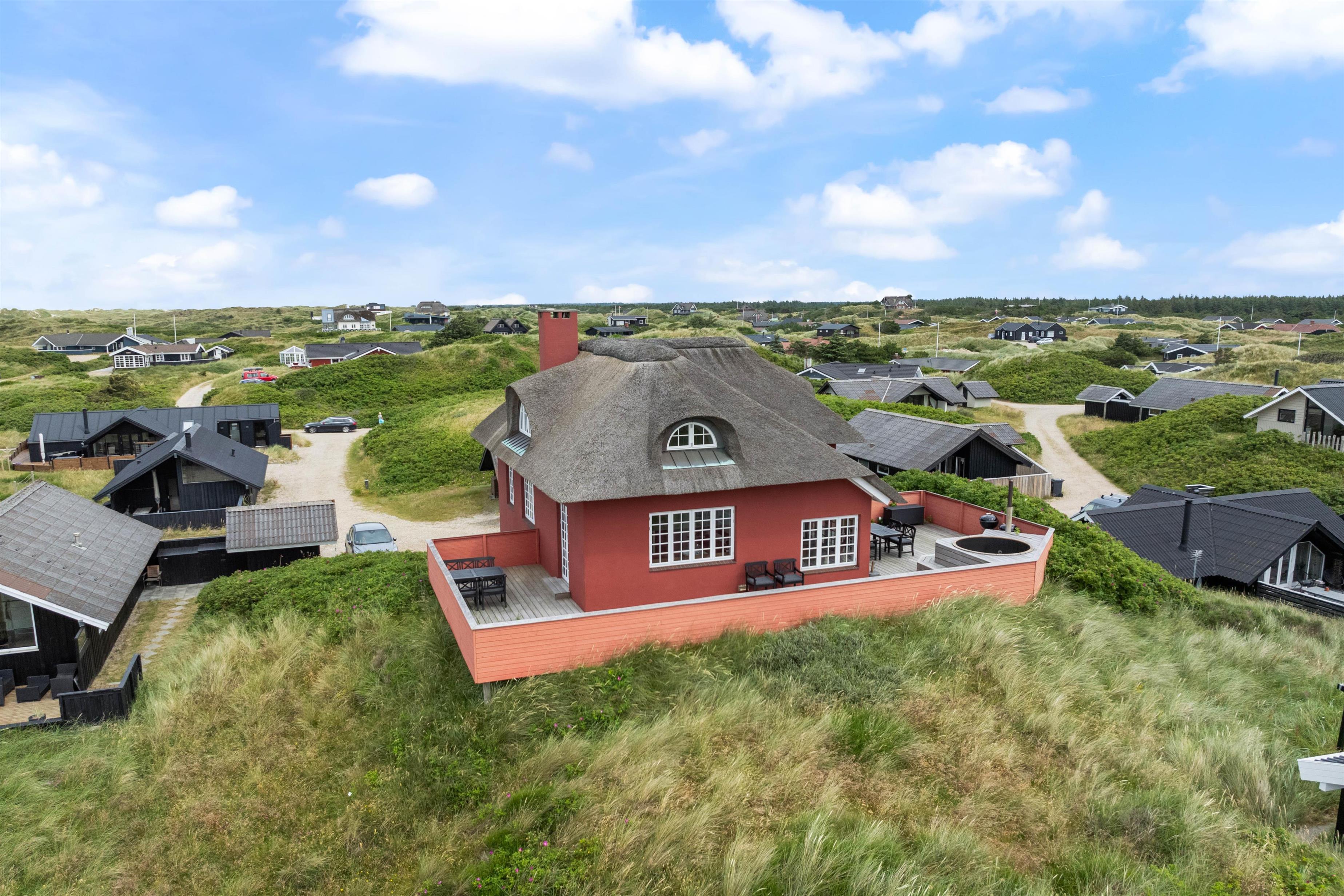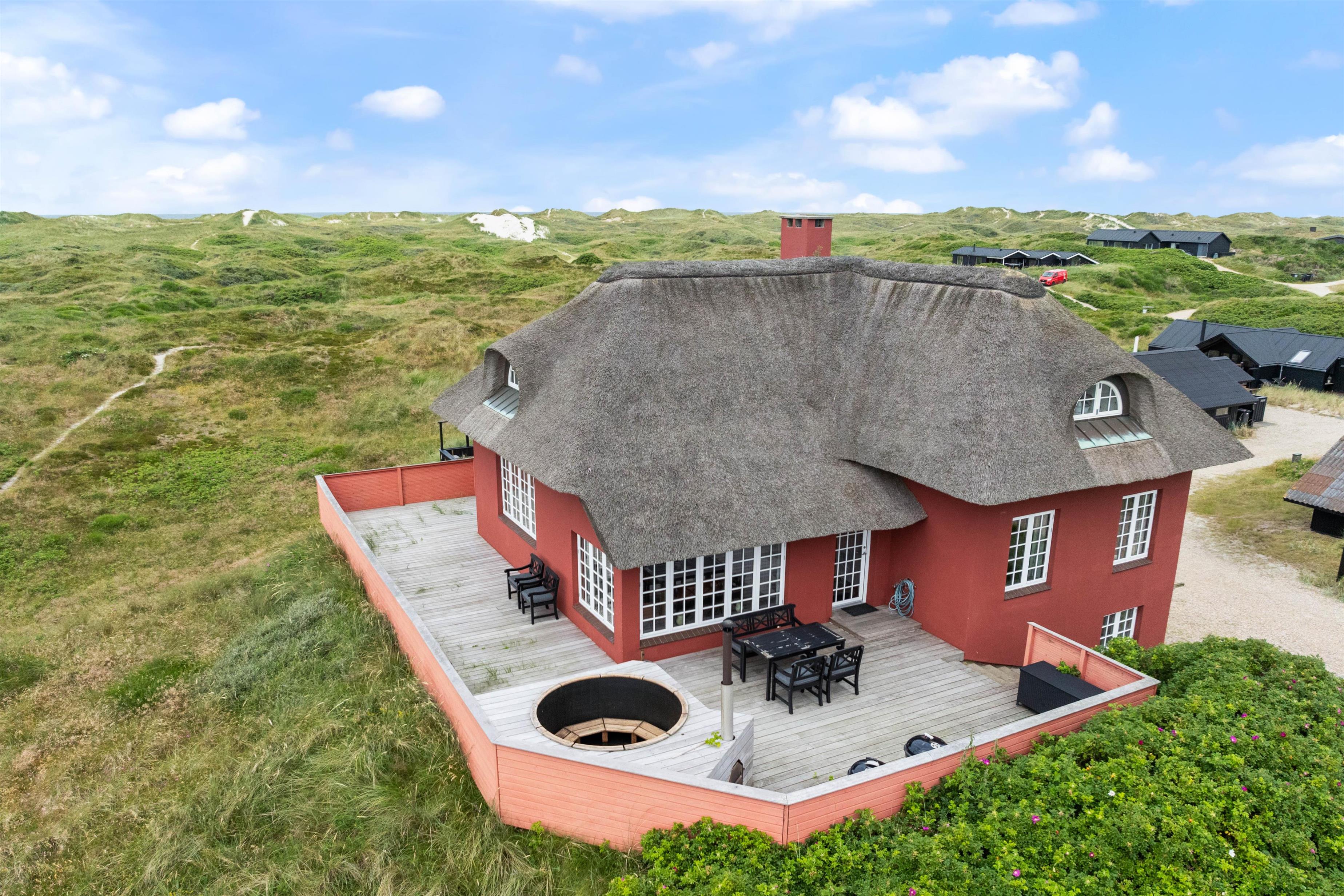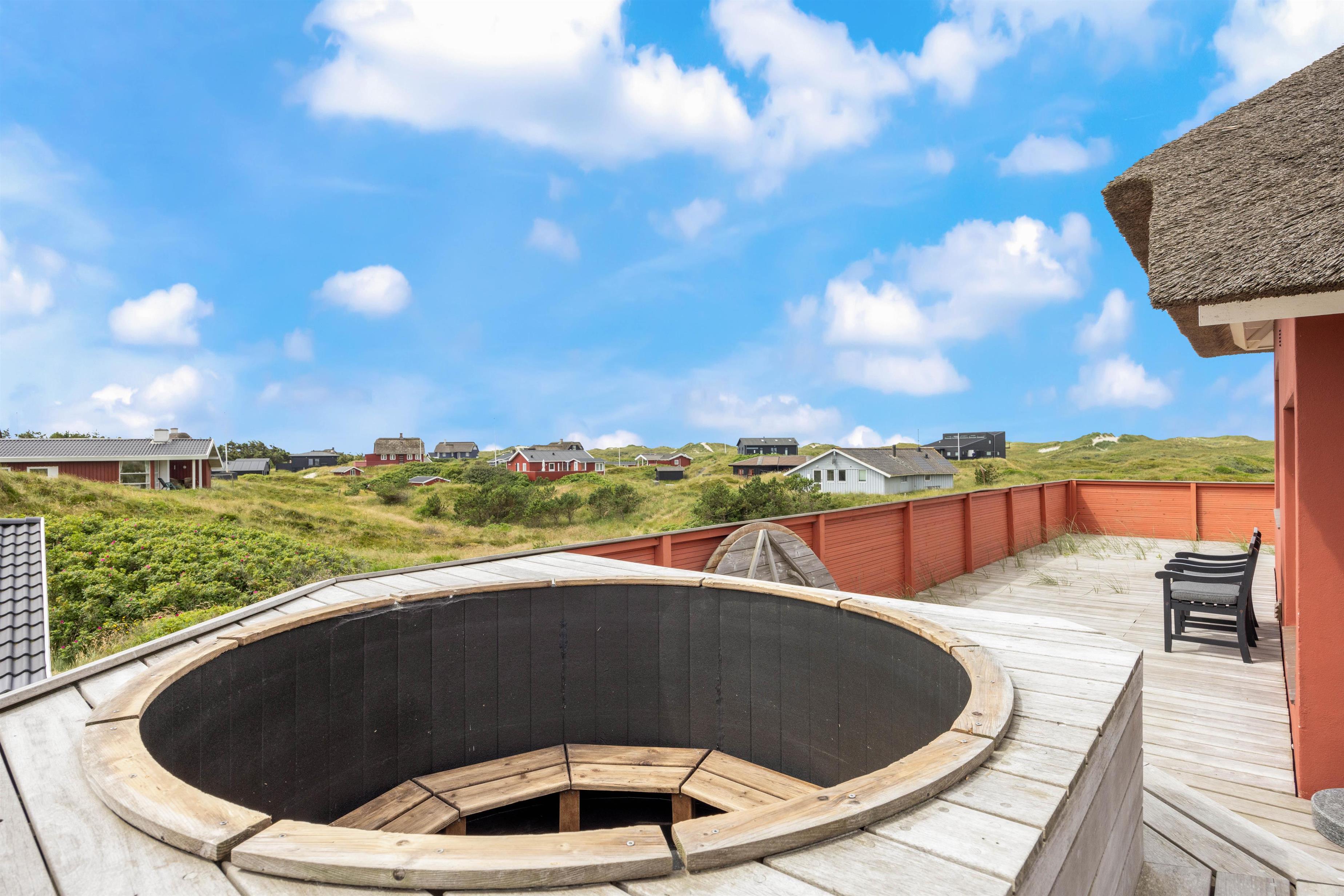 I feriebyen Vejers, små 300 meter fra vandet, finder I dette charmerende feriehus. Et stort stråtækt feriehus, hvor der er kræset om hyggen, en knitrende brændeovn samt god plads til hele familien. Her er en smuk udsigt udover klitterne, som både kan nydes fra sommerhuset og det varme vildmarksbad på terrassen.