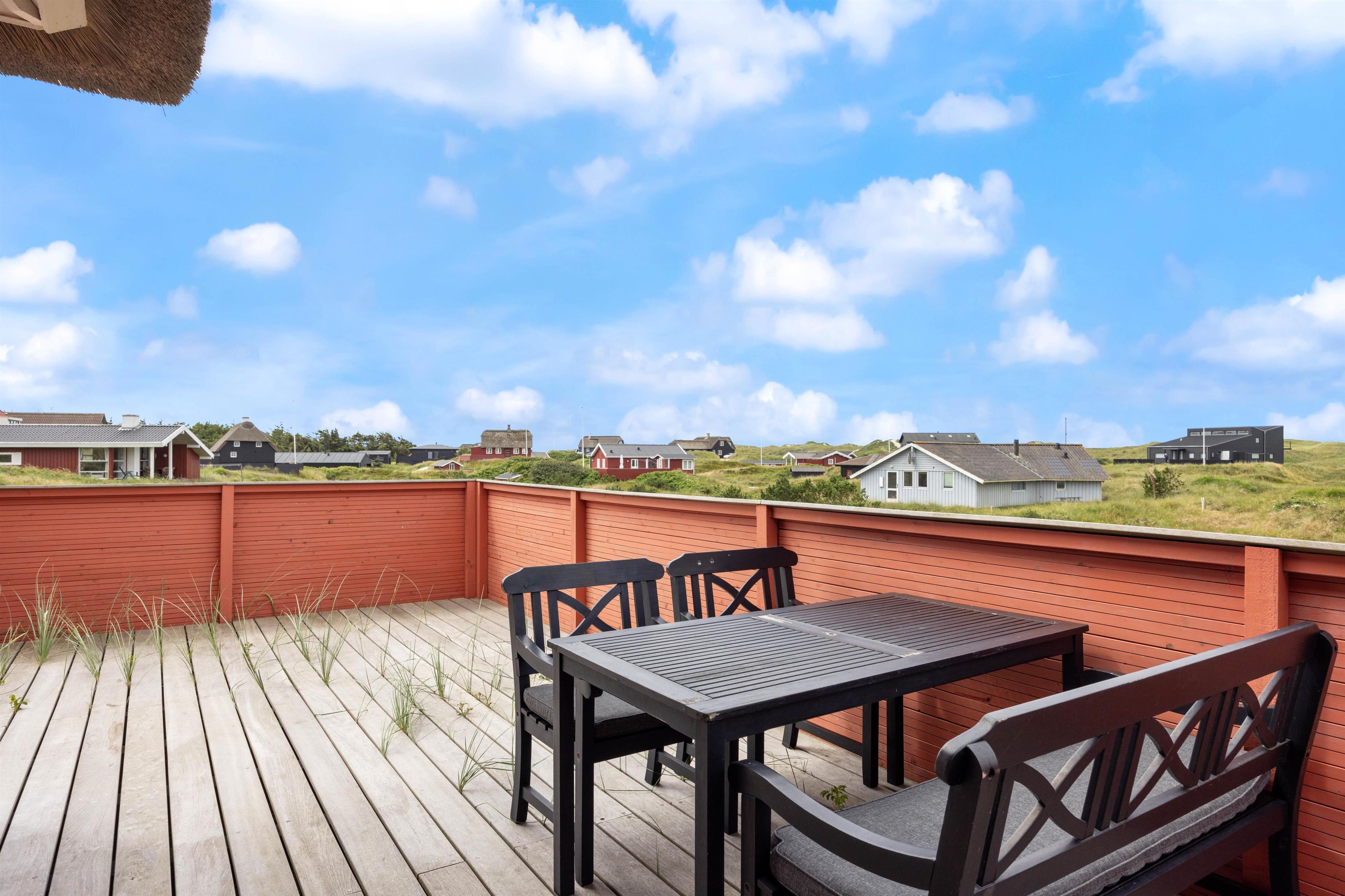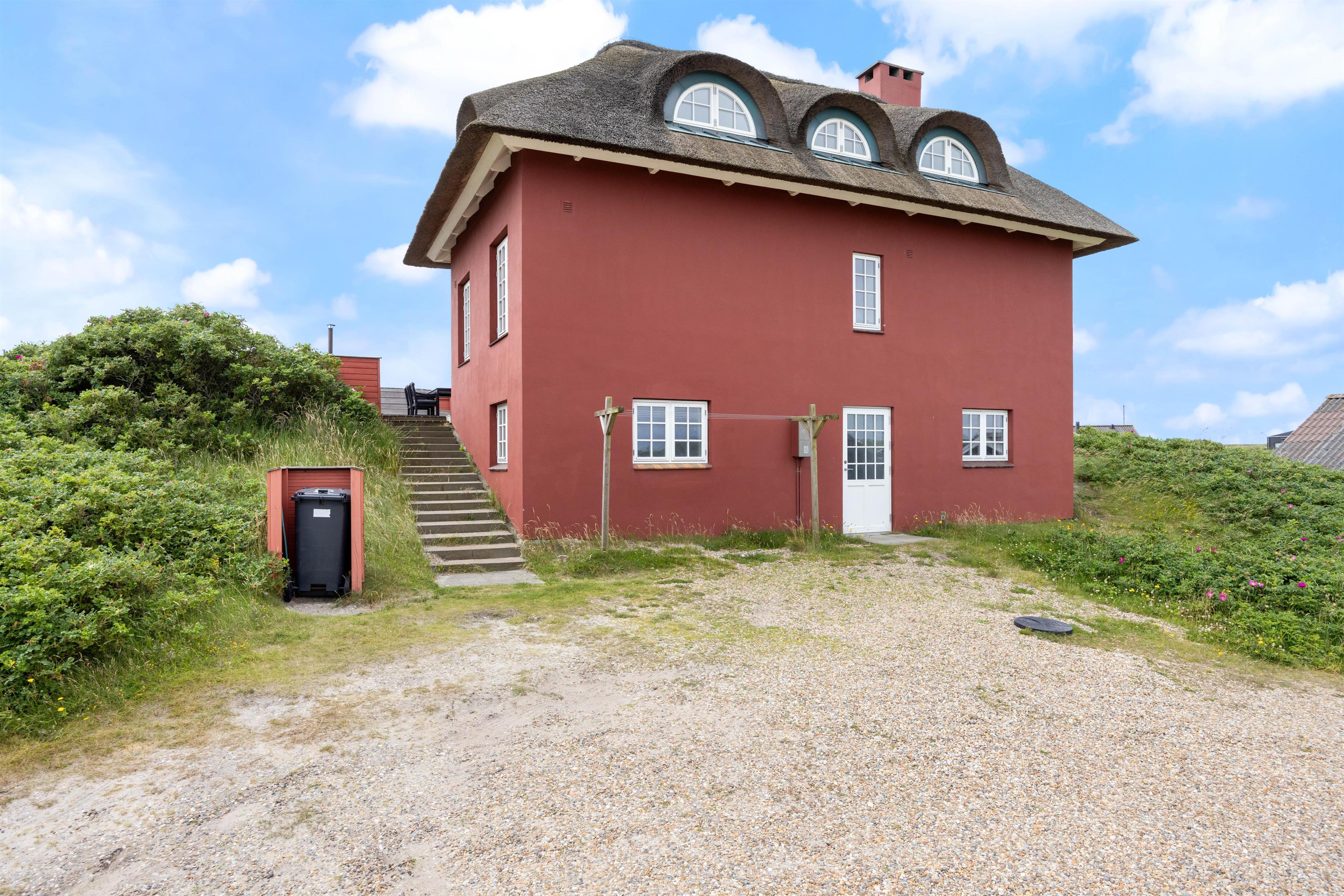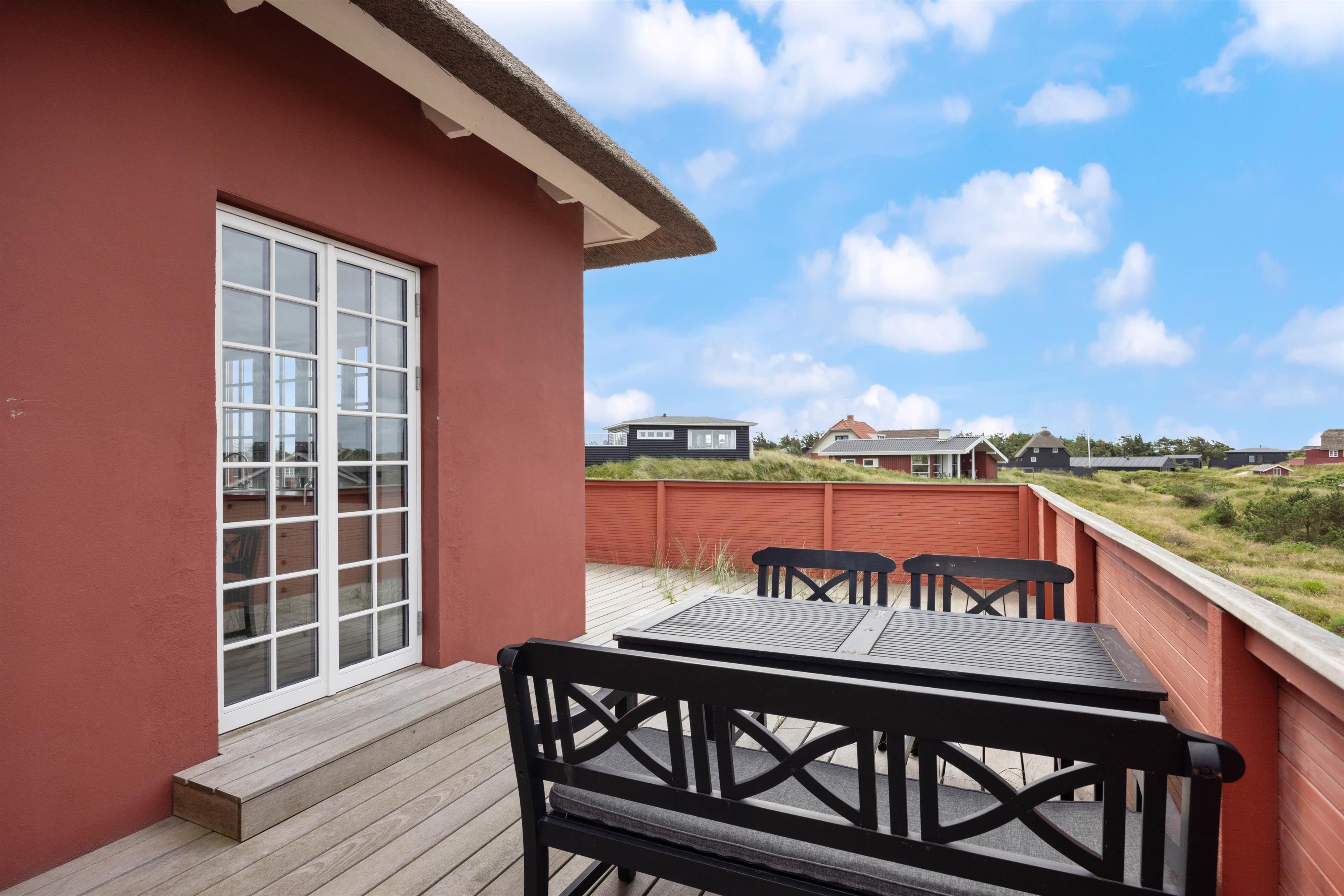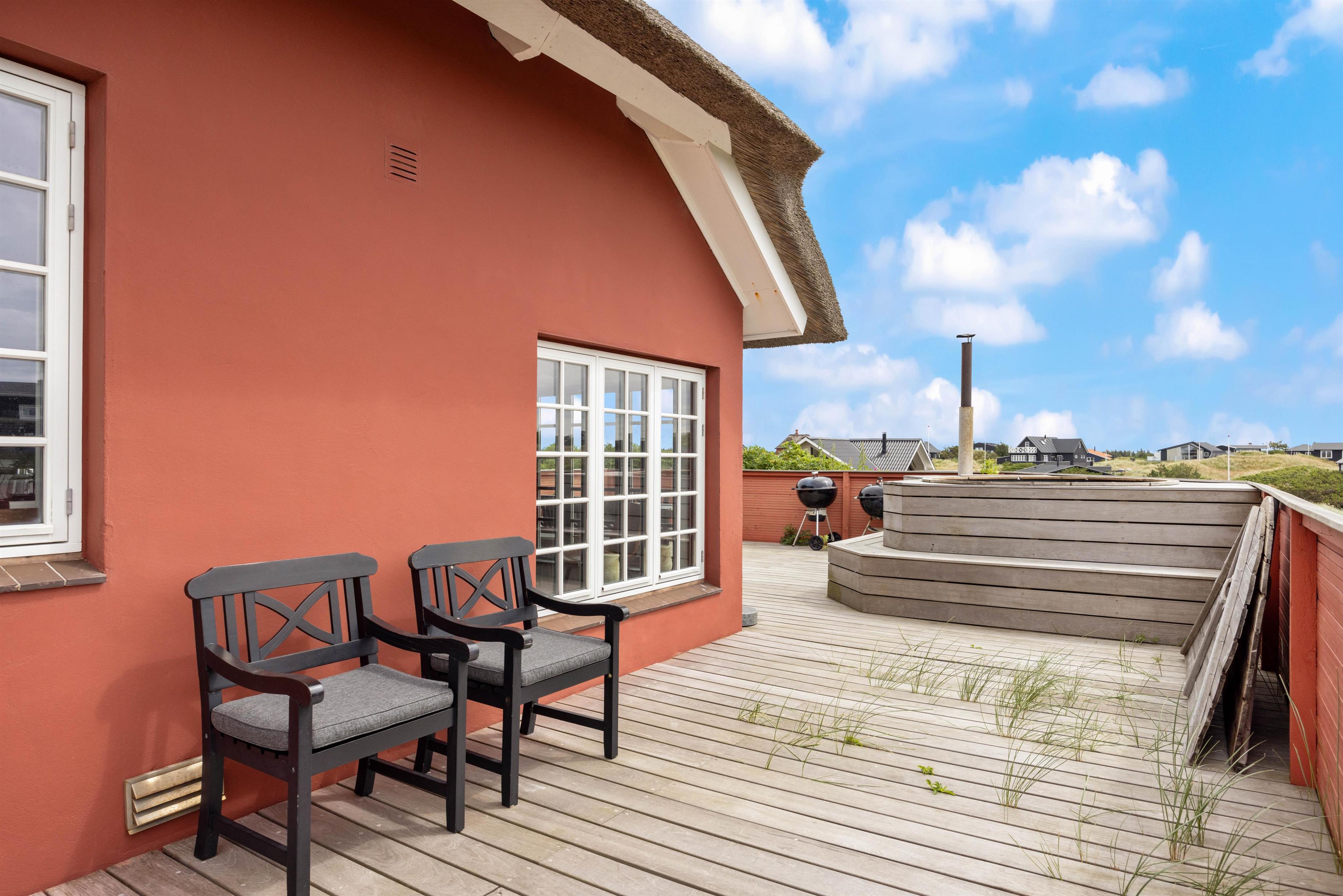 I feriebyen Vejers, små 300 meter fra vandet, finder I dette charmerende feriehus. Et stort stråtækt feriehus, hvor der er kræset om hyggen, en knitrende brændeovn samt god plads til hele familien. Her er en smuk udsigt udover klitterne, som både kan nydes fra sommerhuset og det varme vildmarksbad på terrassen.