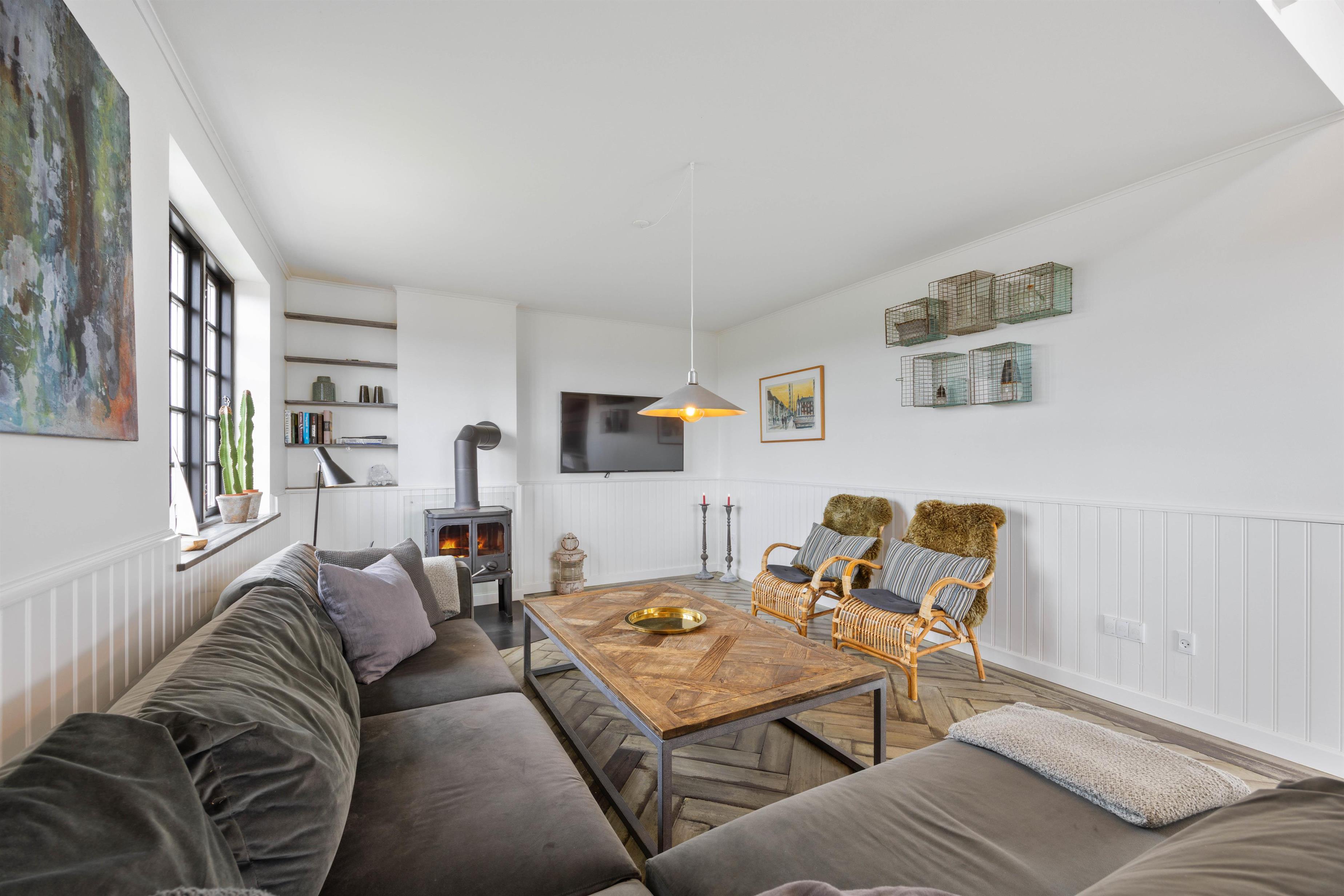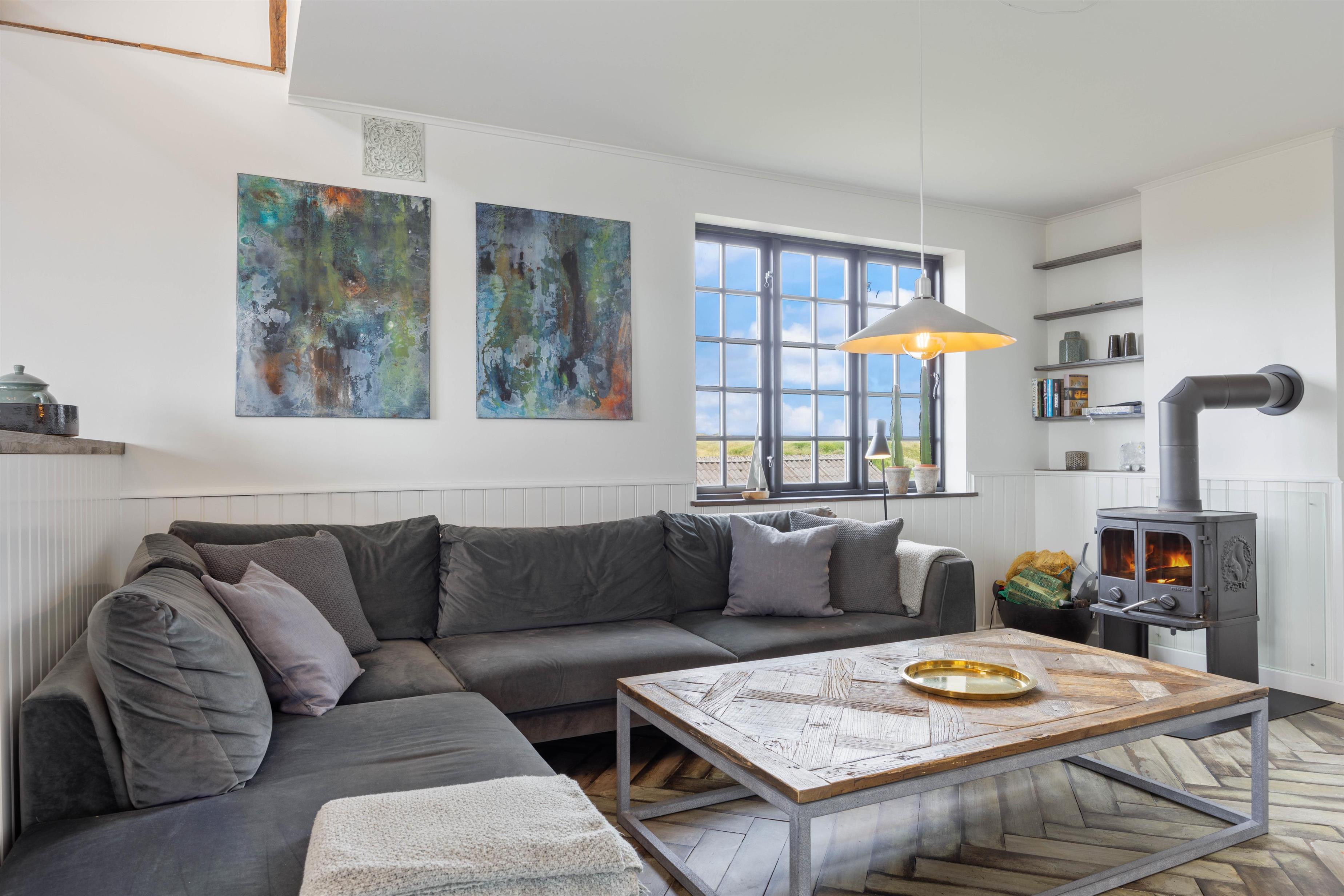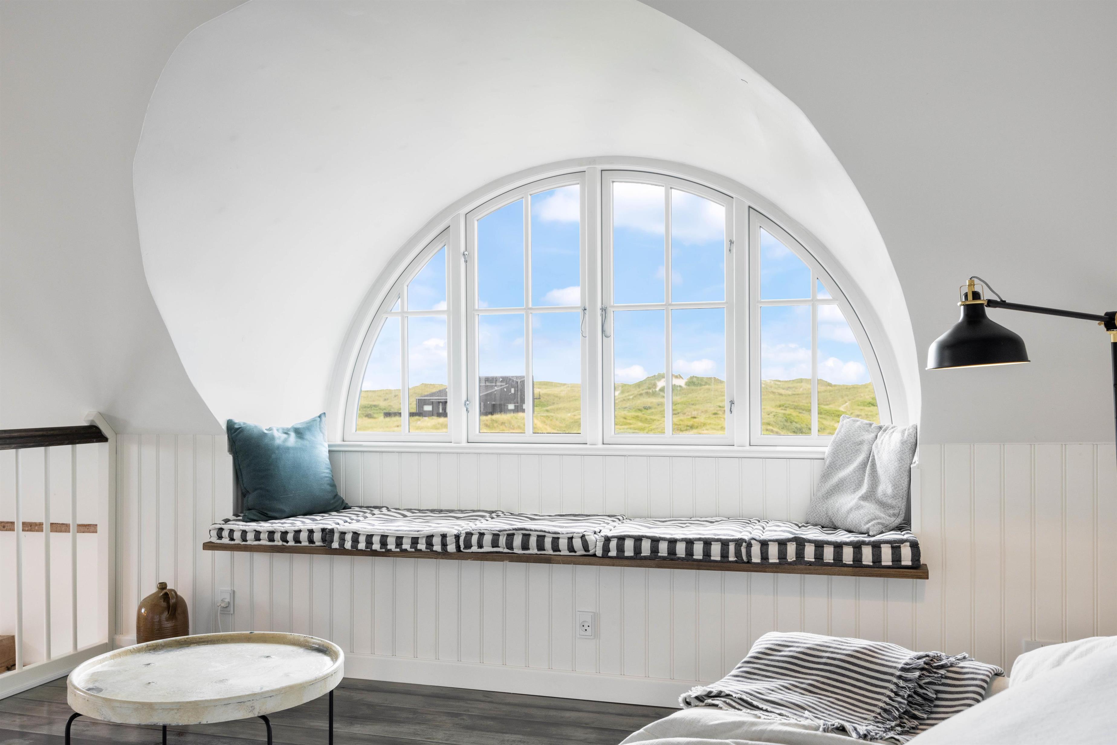 På førstesalen finder I også endnu en opholdsstue, hvorfra der er åben udsigt til køkkenet nedenfor. Her kan I putte jer i en af de store lænestole, læse en bog eller nyde en kop kaffe på bænken i det smukke, runde vindue. Sæt dig her, slap af og nyd den skønne udsigt mod havet.