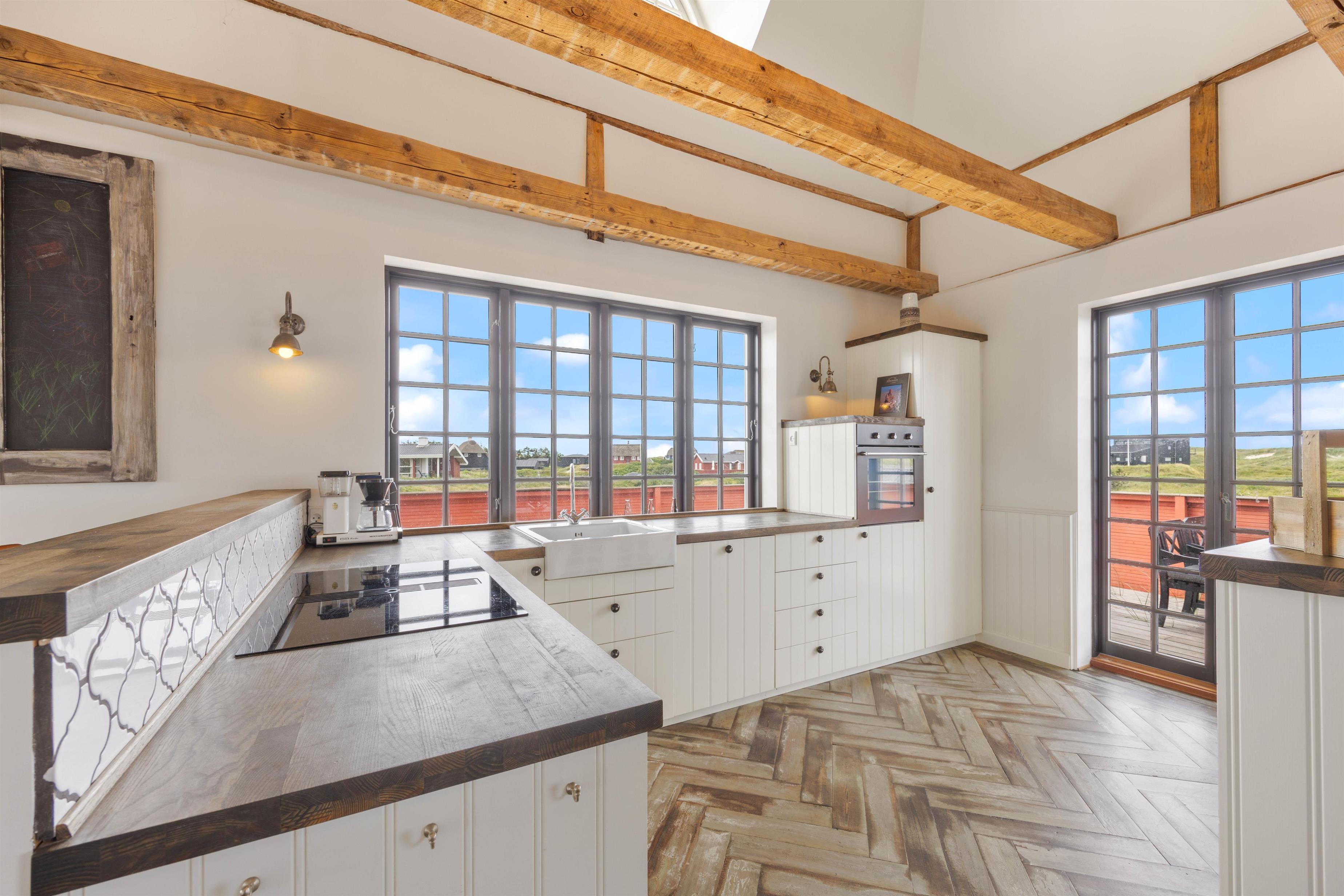 Fra køkkenet er der direkte udgang til den store, fine træterrasse mod syd. Her kan I nyde solens varme med en lækker morgenmad, spille spil med familien eller holde en skøn grillaften. Nyd roen, mens bøfferne steger på grillen, og tag jer et godt glas vin.