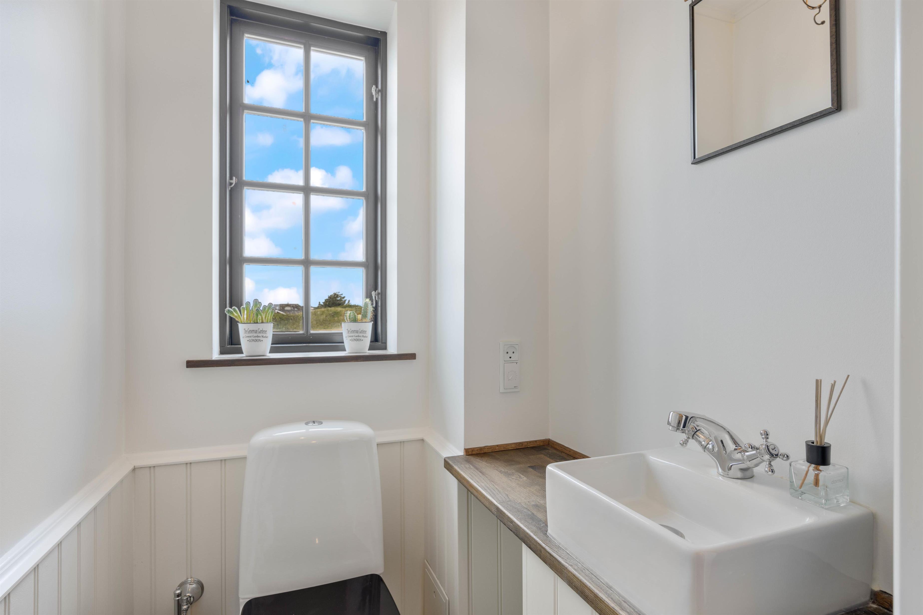I stuen finder I 2 af de 3 badeværelser, mens der under trappen findes vaskemaskine og tørretumbler, der sikrer jer friske strandhåndklæder under opholdet. I alt er her 4 fine værelser; 2 på førstesalen og 2 i stueetagen – alle er udstyret med komfortable senge, der sikrer jer en god nattesøvn.