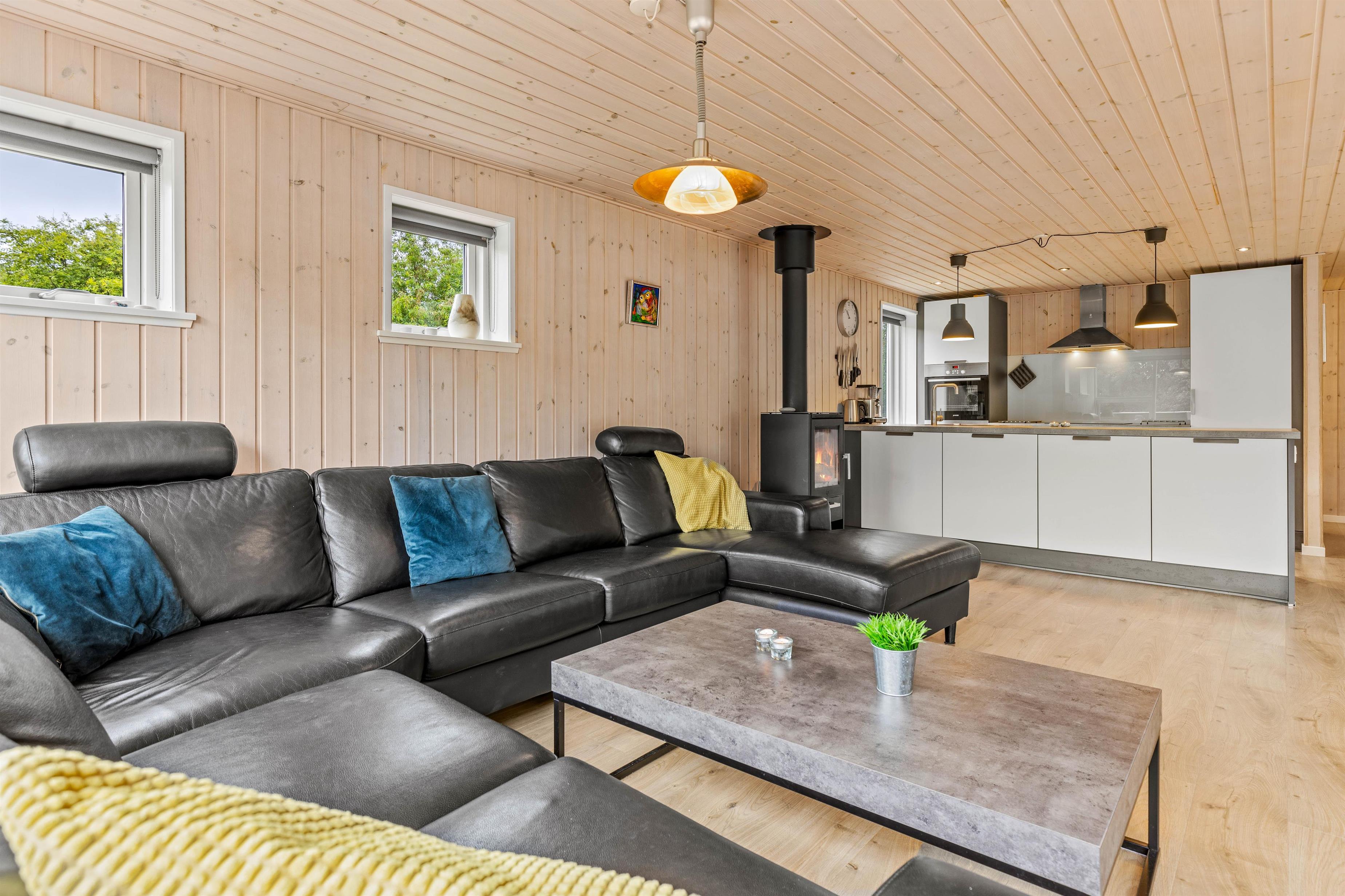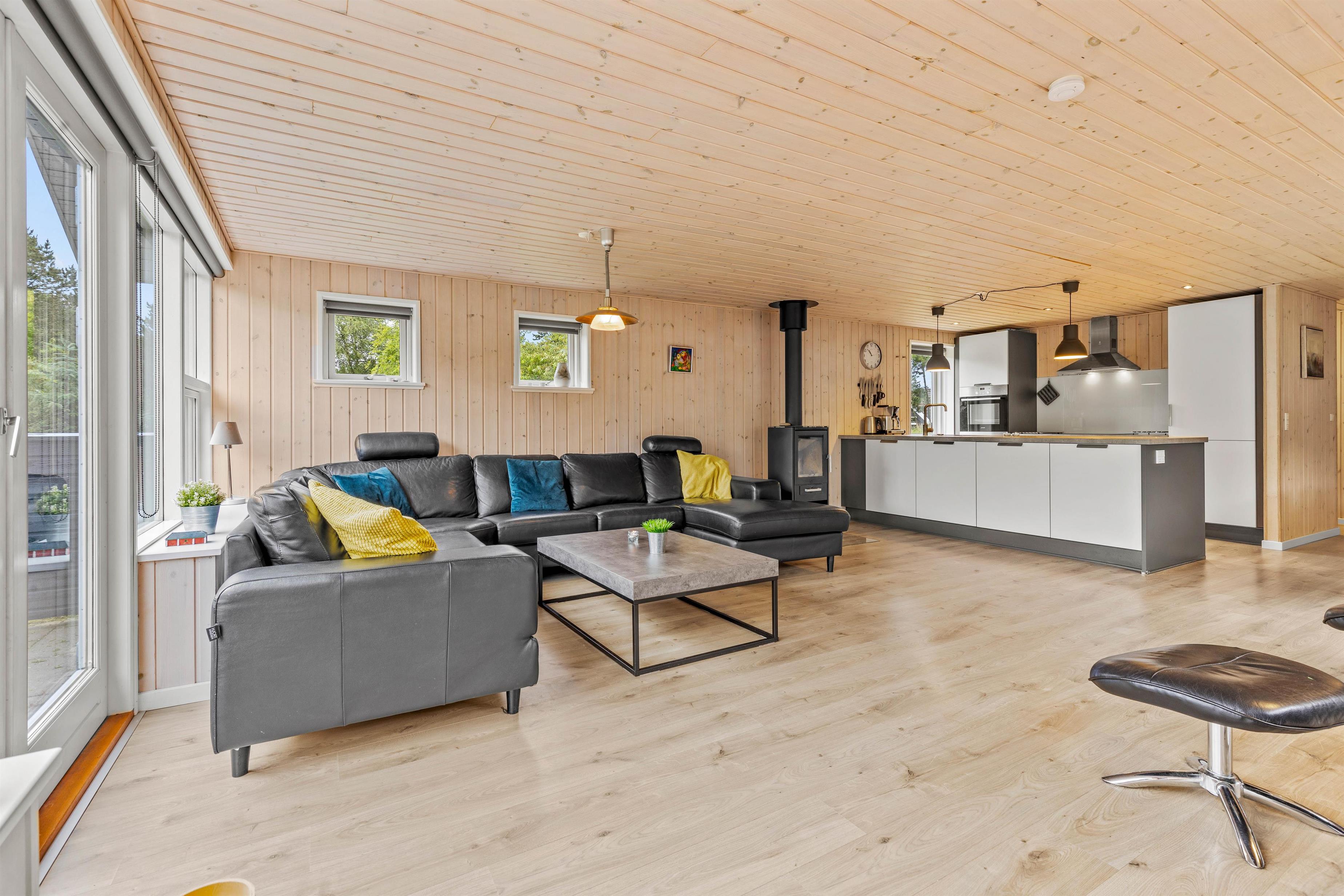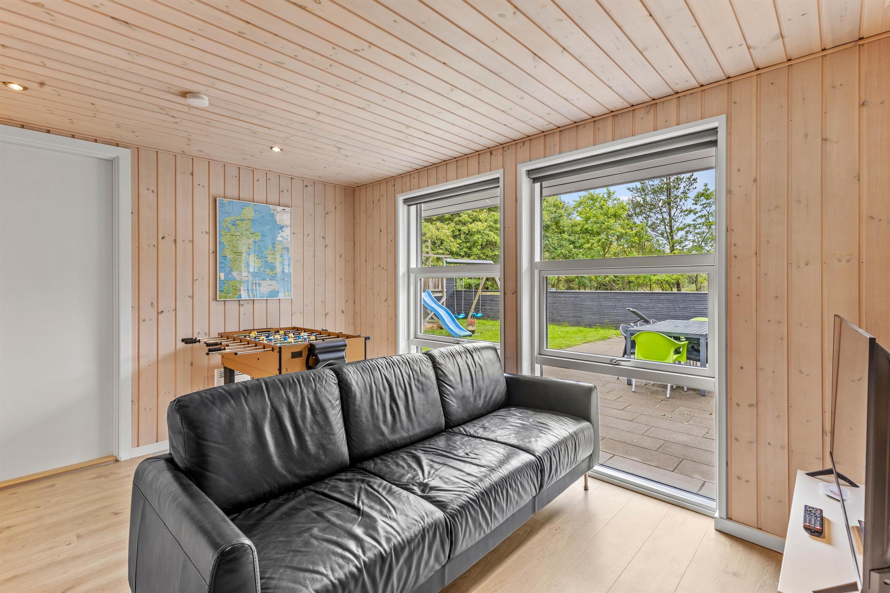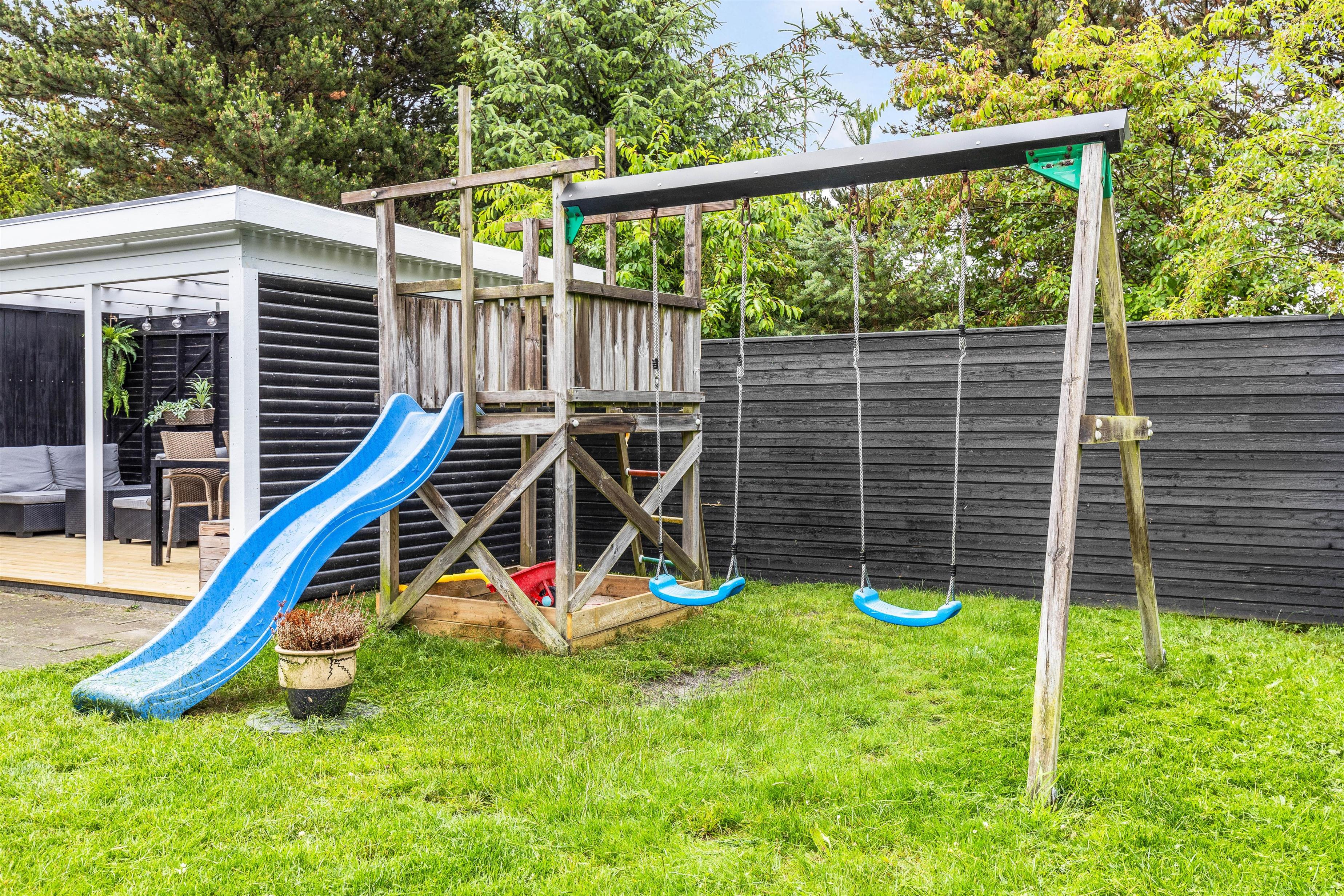 Det er ikke kun indvendigt, sommerhuset er spækket med fede feriehighlights. I får også et helt fantastisk udendørsareal. En stor, lukket terrasse – med markise! – sørger for, at I roligt kan lade både børnene og hundene lege, mens I læser en god bog i solen. På terrassen befinder der sig desuden et stykke græsplæne og et legeområde til børnene.