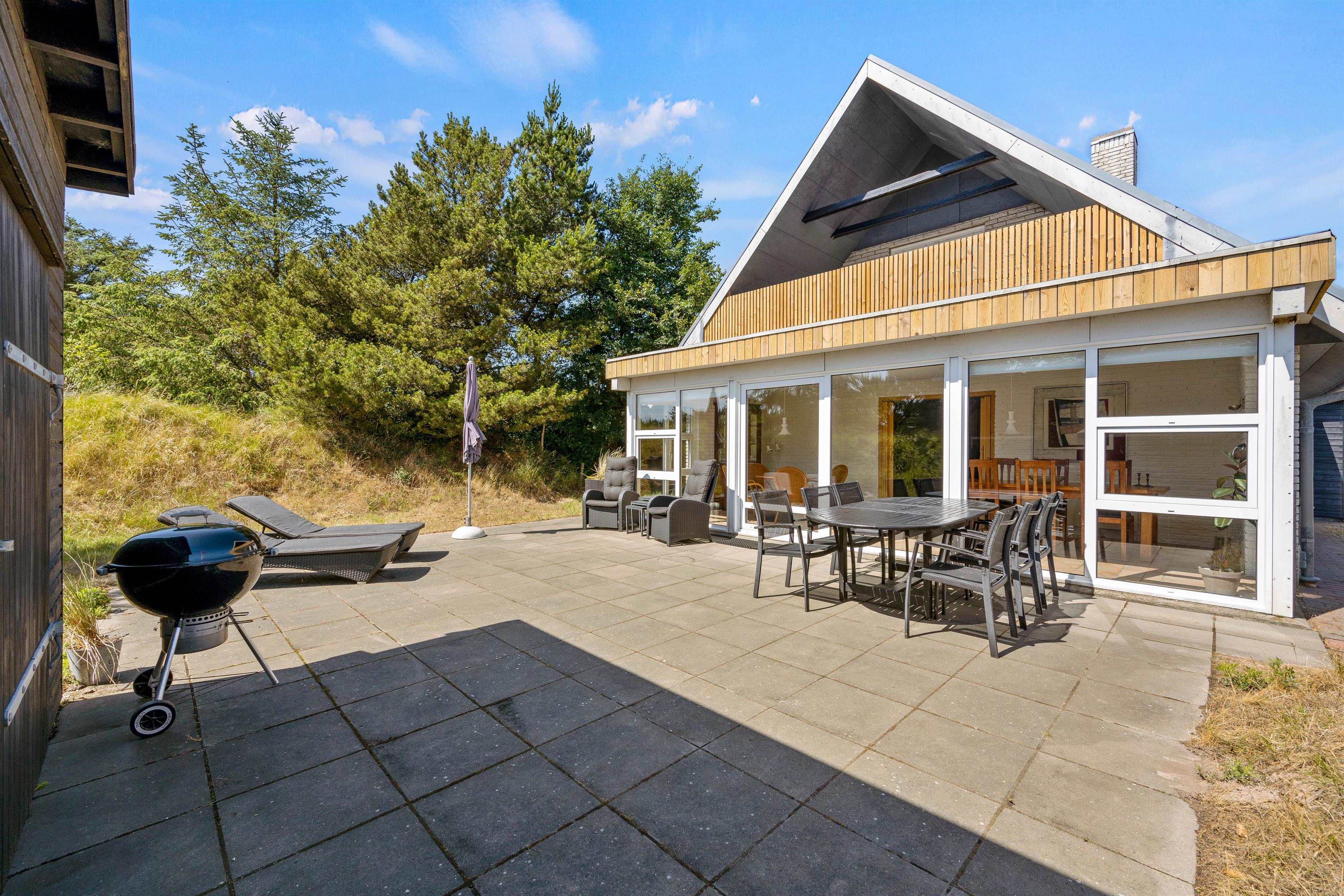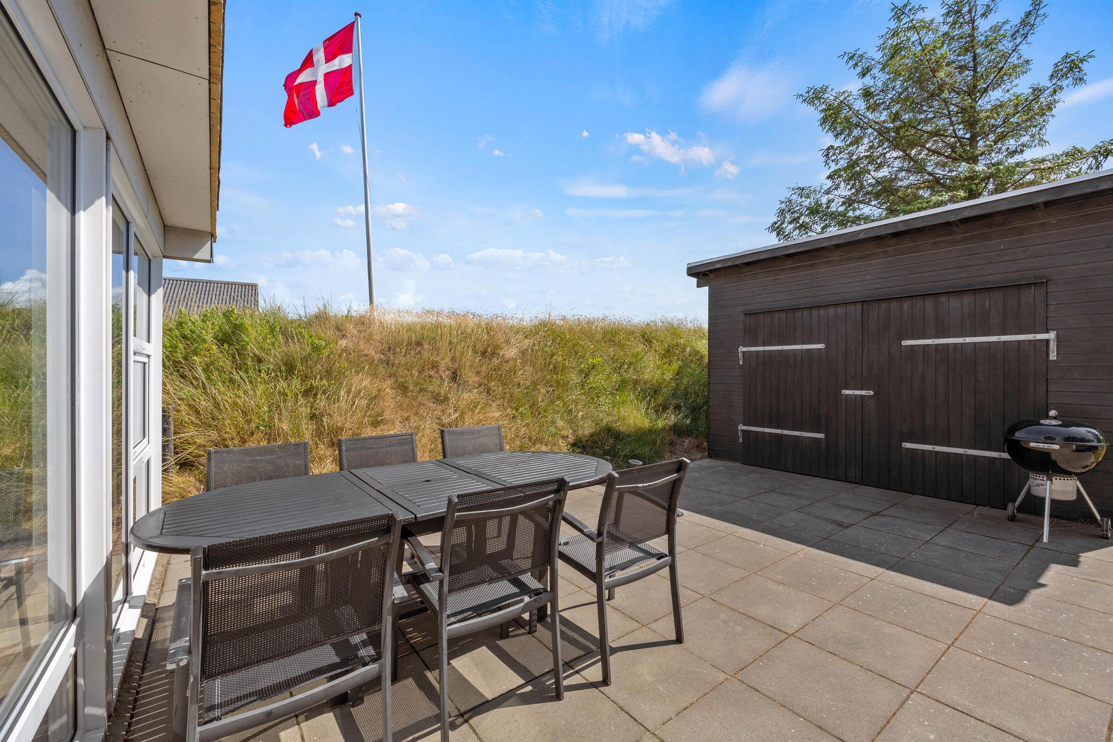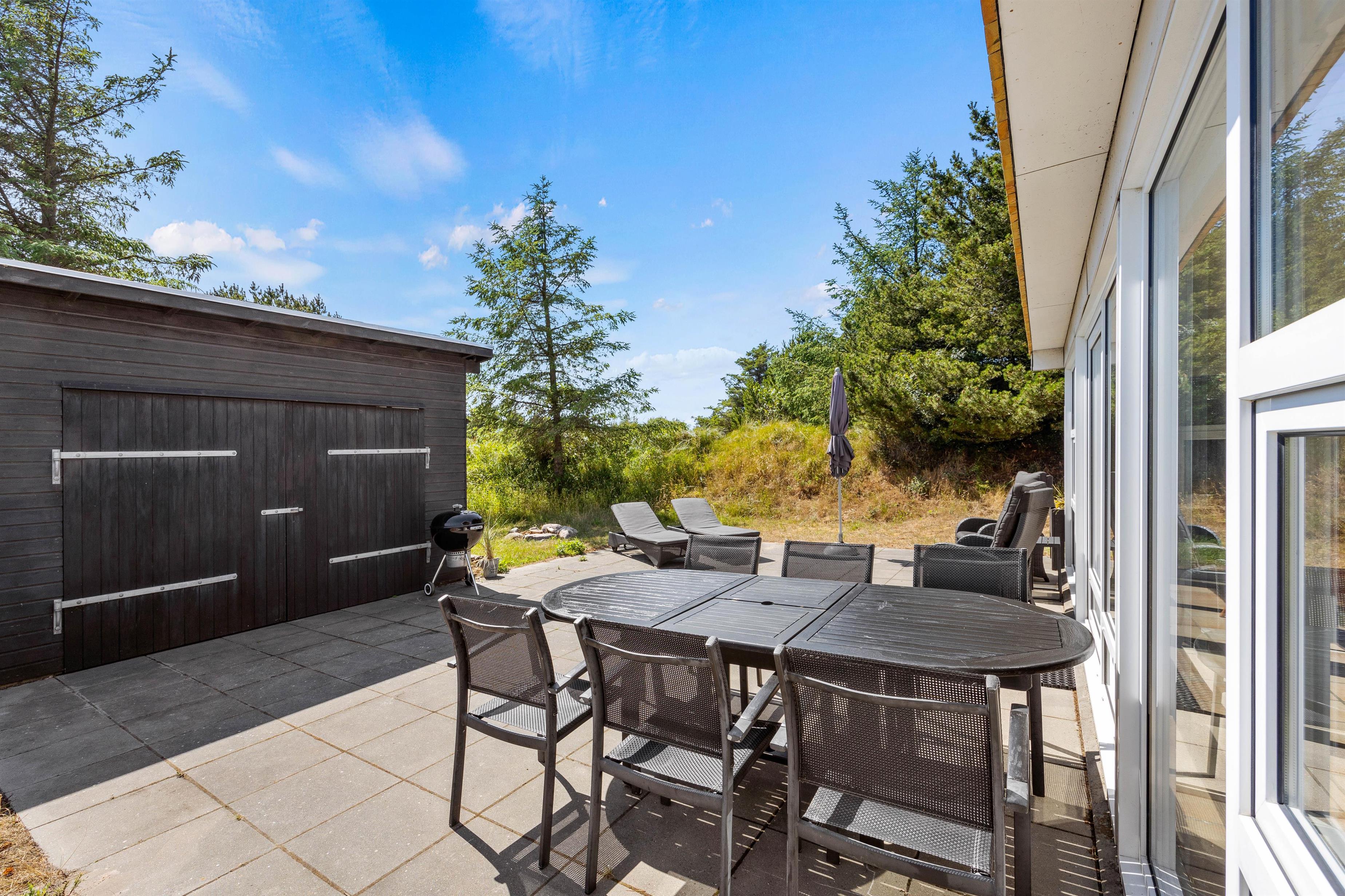 Udover altanen har I også en skøn terrasse, som I kan træde ud på fra udestuen i stueetagen. På terrassen kan I finde jer til rette i havemøbler og liggestole og bare nyde ferien, roen og solen. Om aftenen kan I gøre klar til aftensmaden, som kan tilberedes på sommerhusets grill.