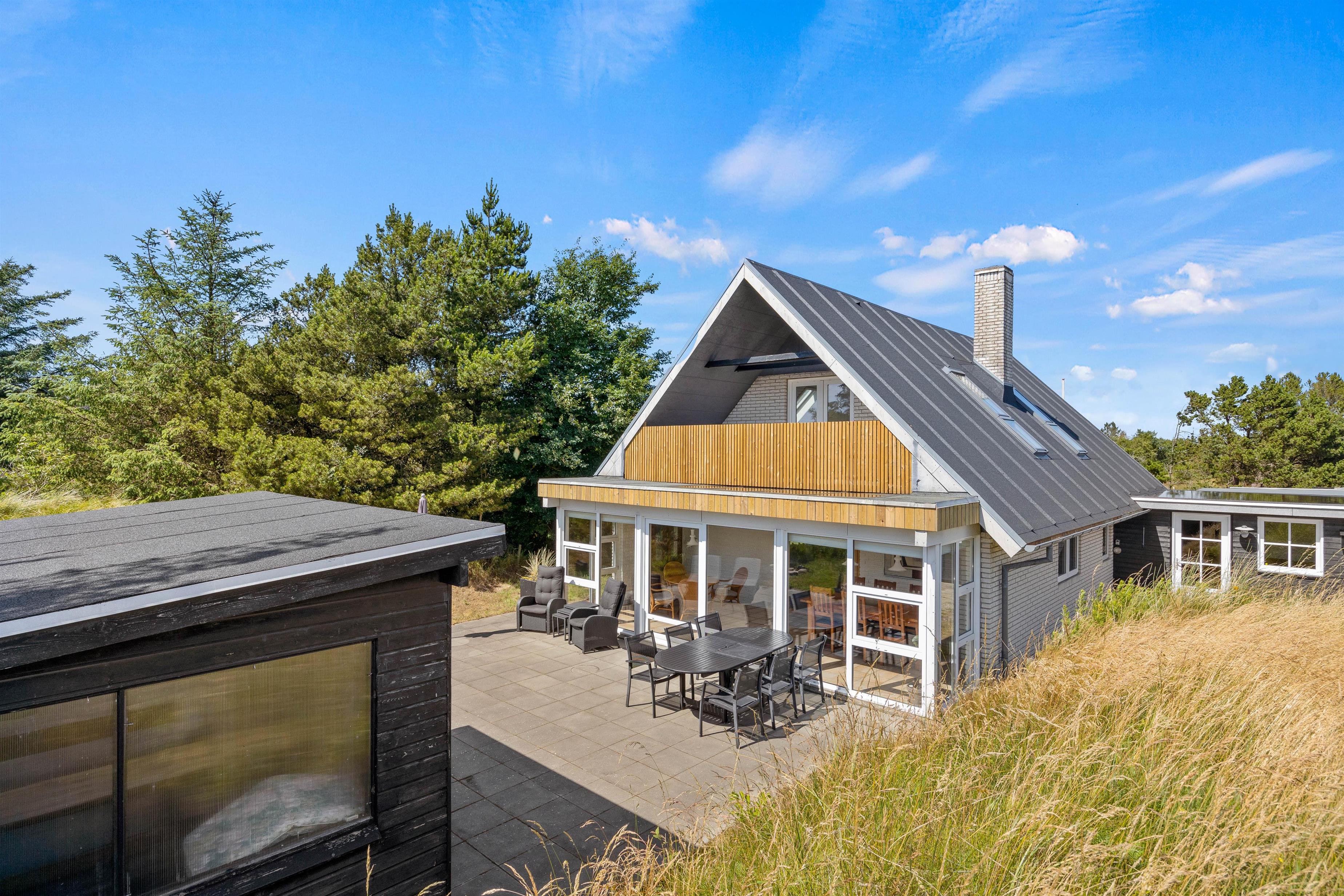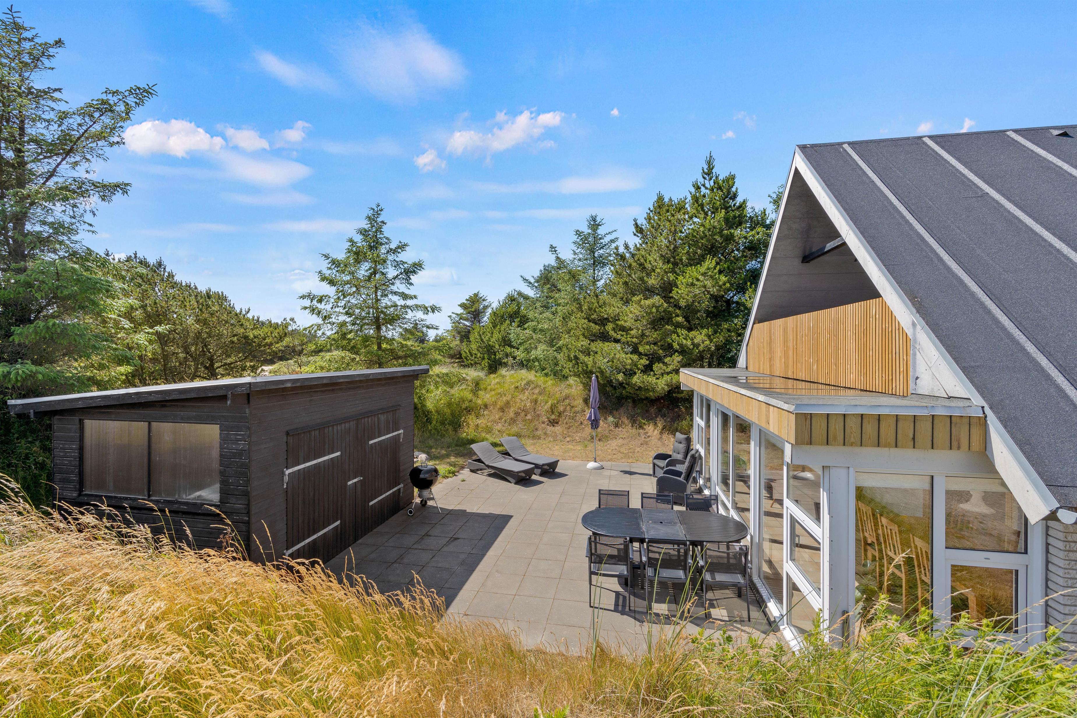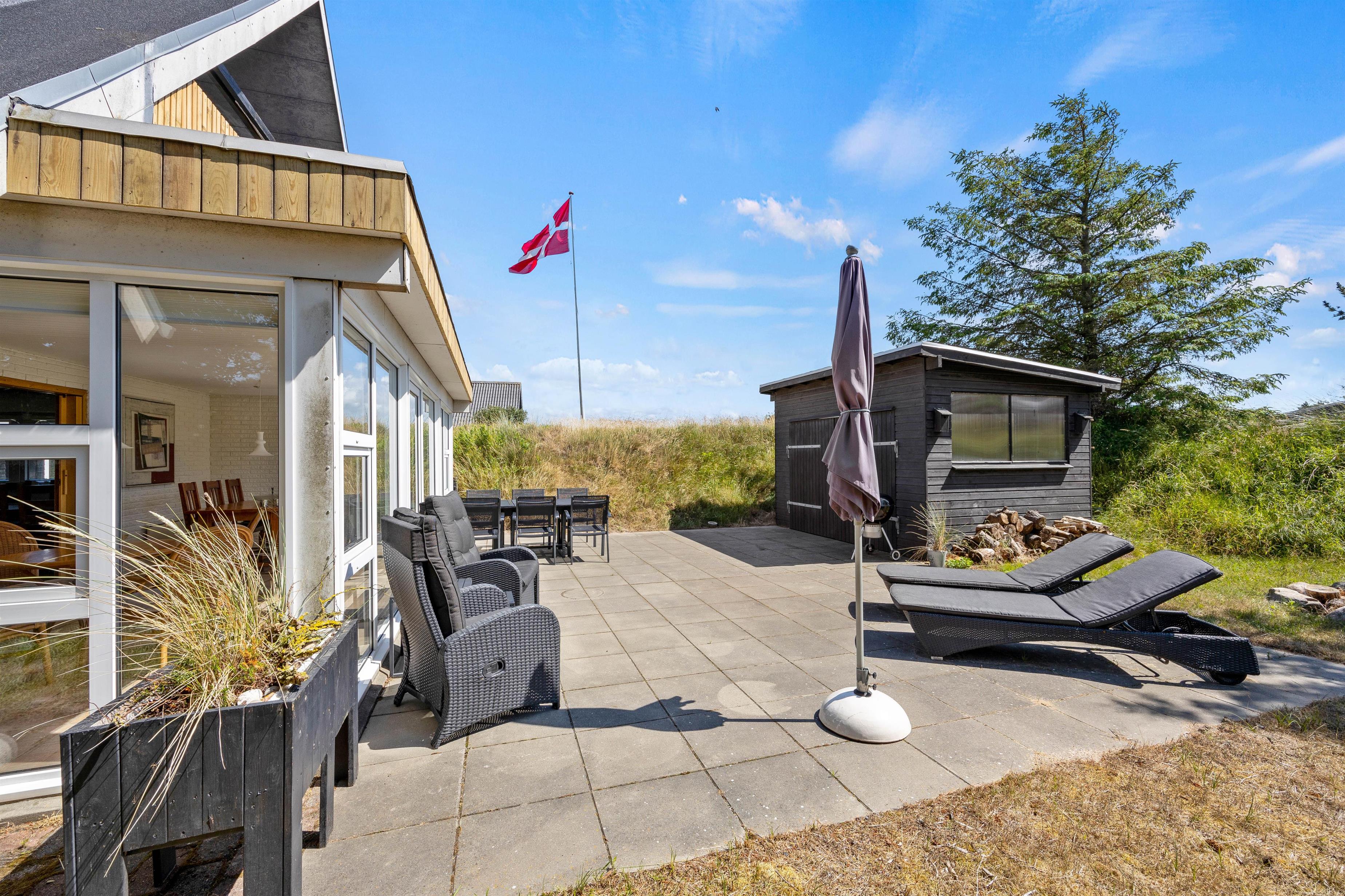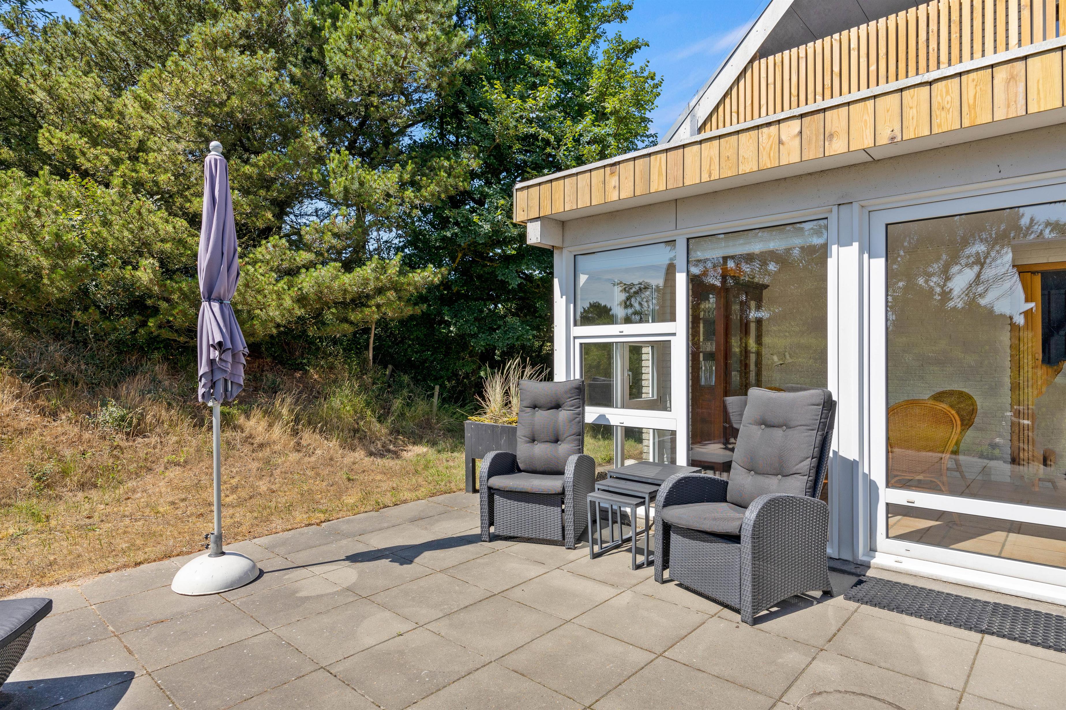 Udover altanen har I også en skøn terrasse, som I kan træde ud på fra udestuen i stueetagen. På terrassen kan I finde jer til rette i havemøbler og liggestole og bare nyde ferien, roen og solen. Om aftenen kan I gøre klar til aftensmaden, som kan tilberedes på sommerhusets grill.