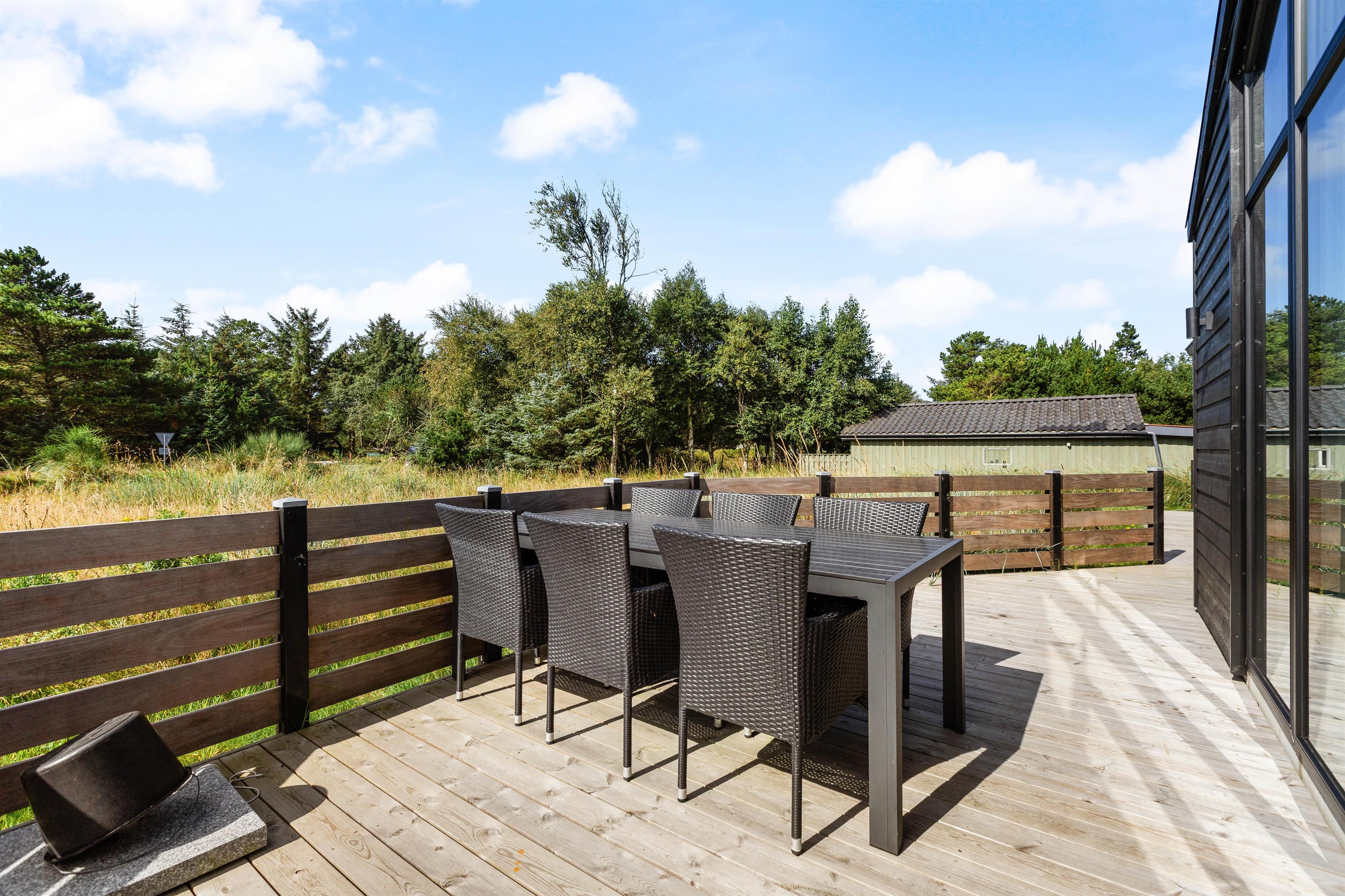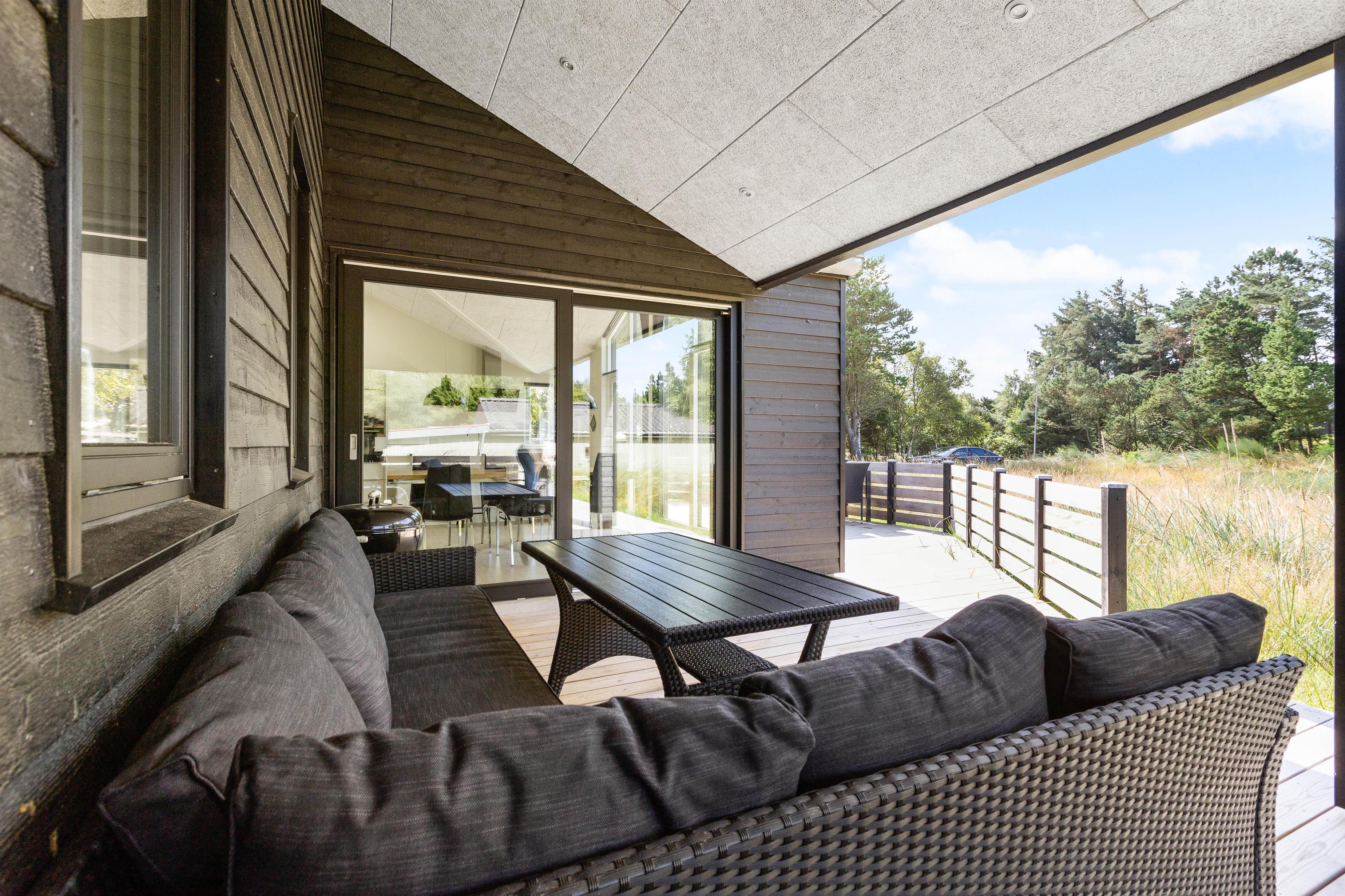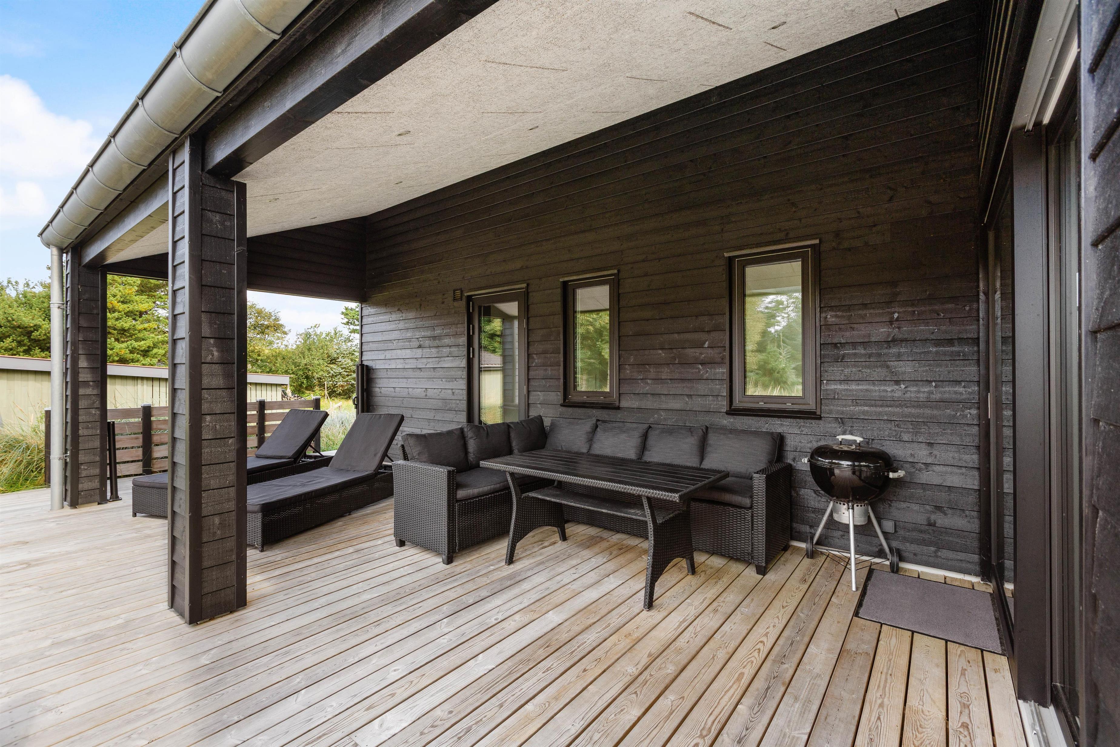På den store terrasse har du flere dejlige steder at nyde solens varme stråler. Her står havemøbler og liggestole klar til jer, men foretrækker man hellere læ for vinden og skygge, er der også mulighed for dette under den overdækkede del af terrassen – herunder kan I såmænd også sagtens sidde og nyde et lækkert grill-måltid, en kold sodavand eller sommerdrink for at blive kølet ned.