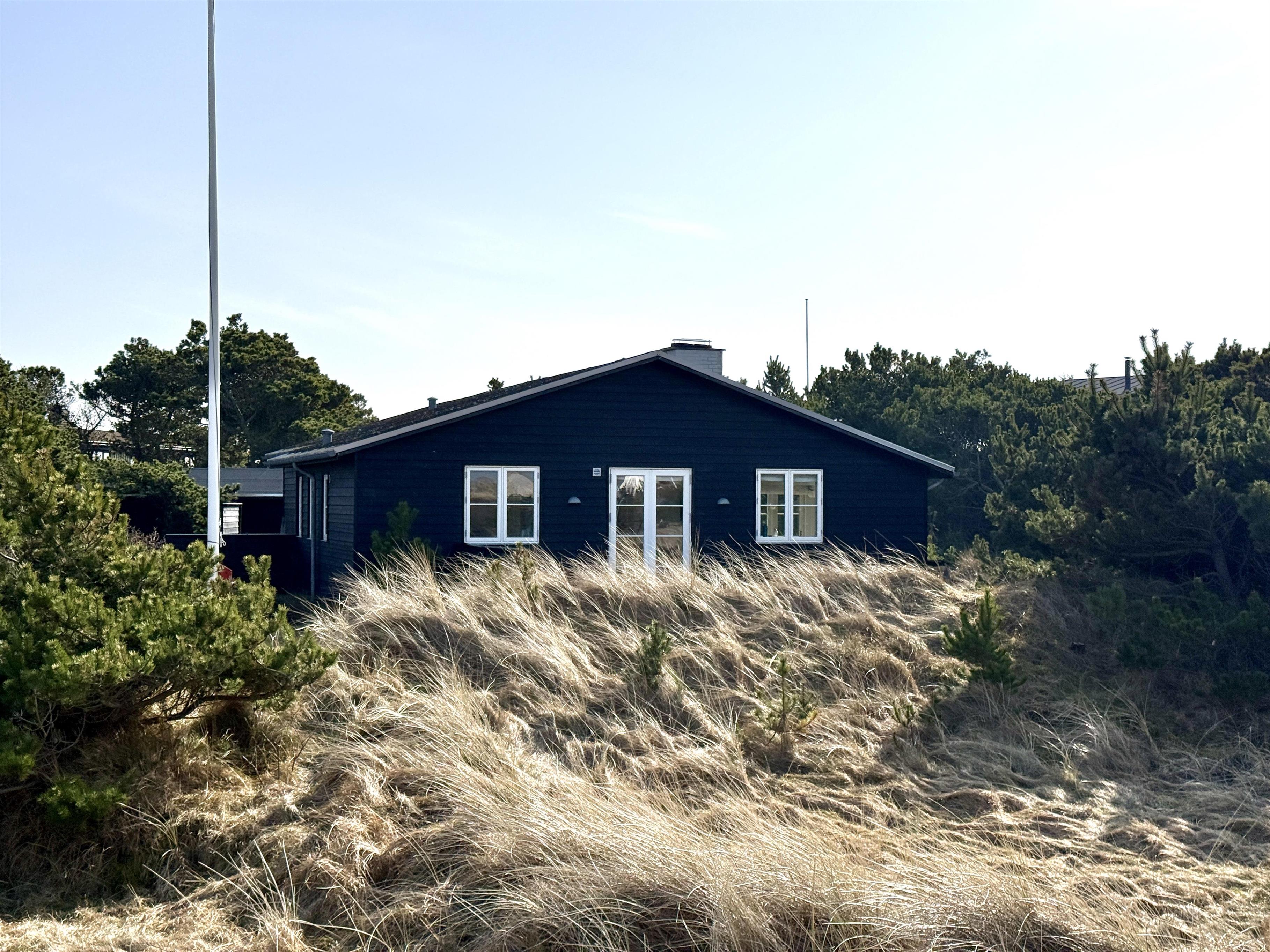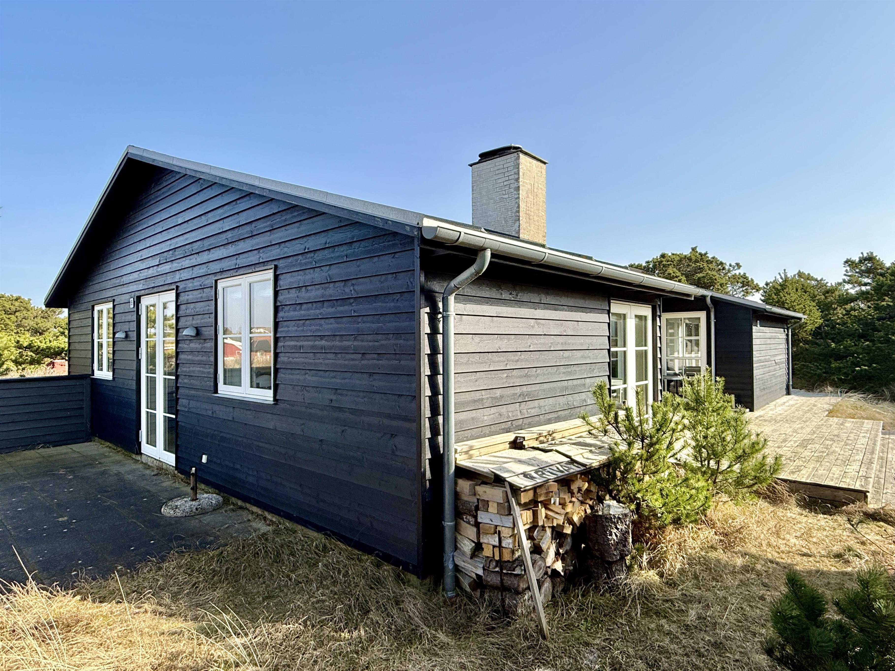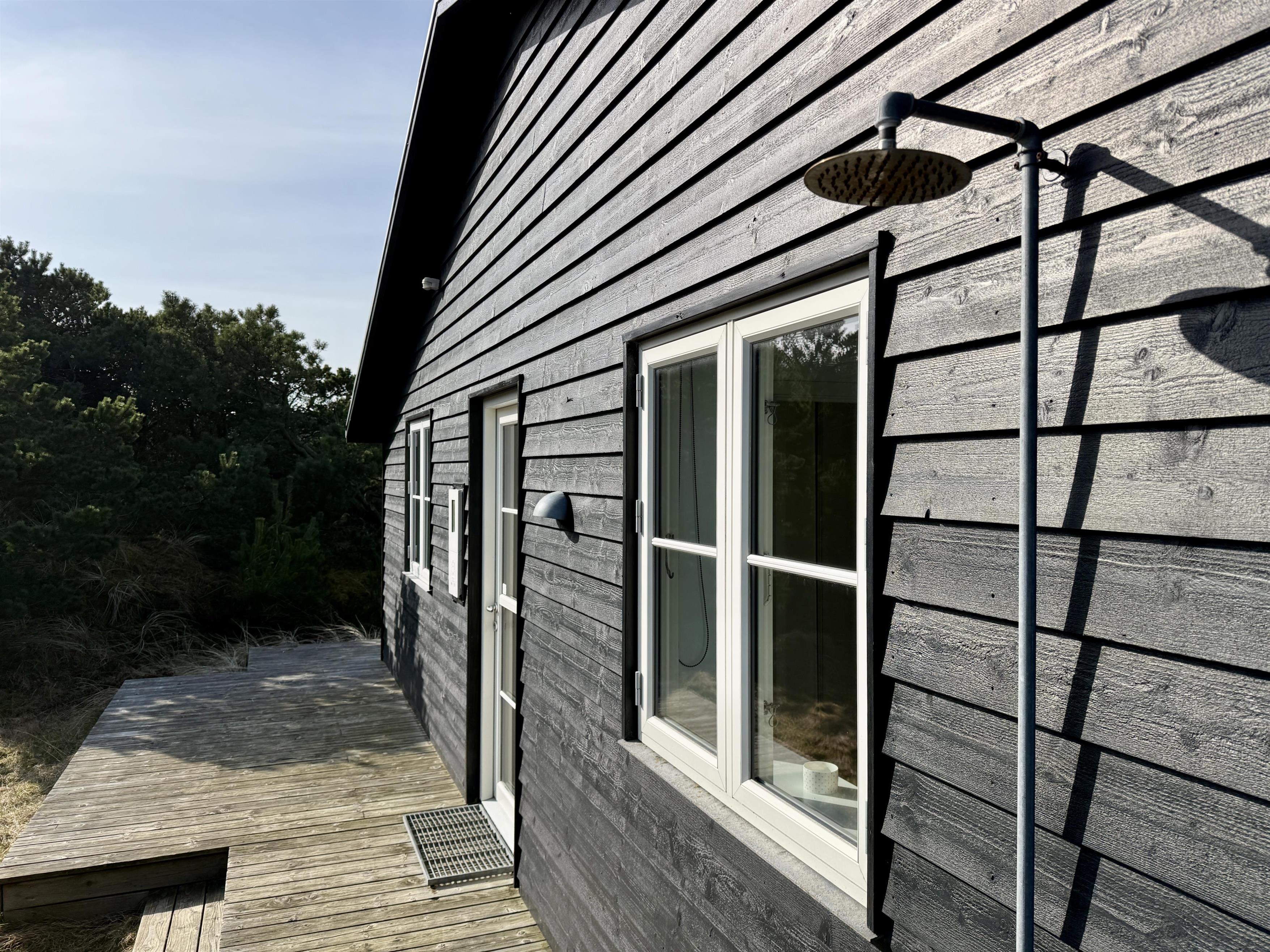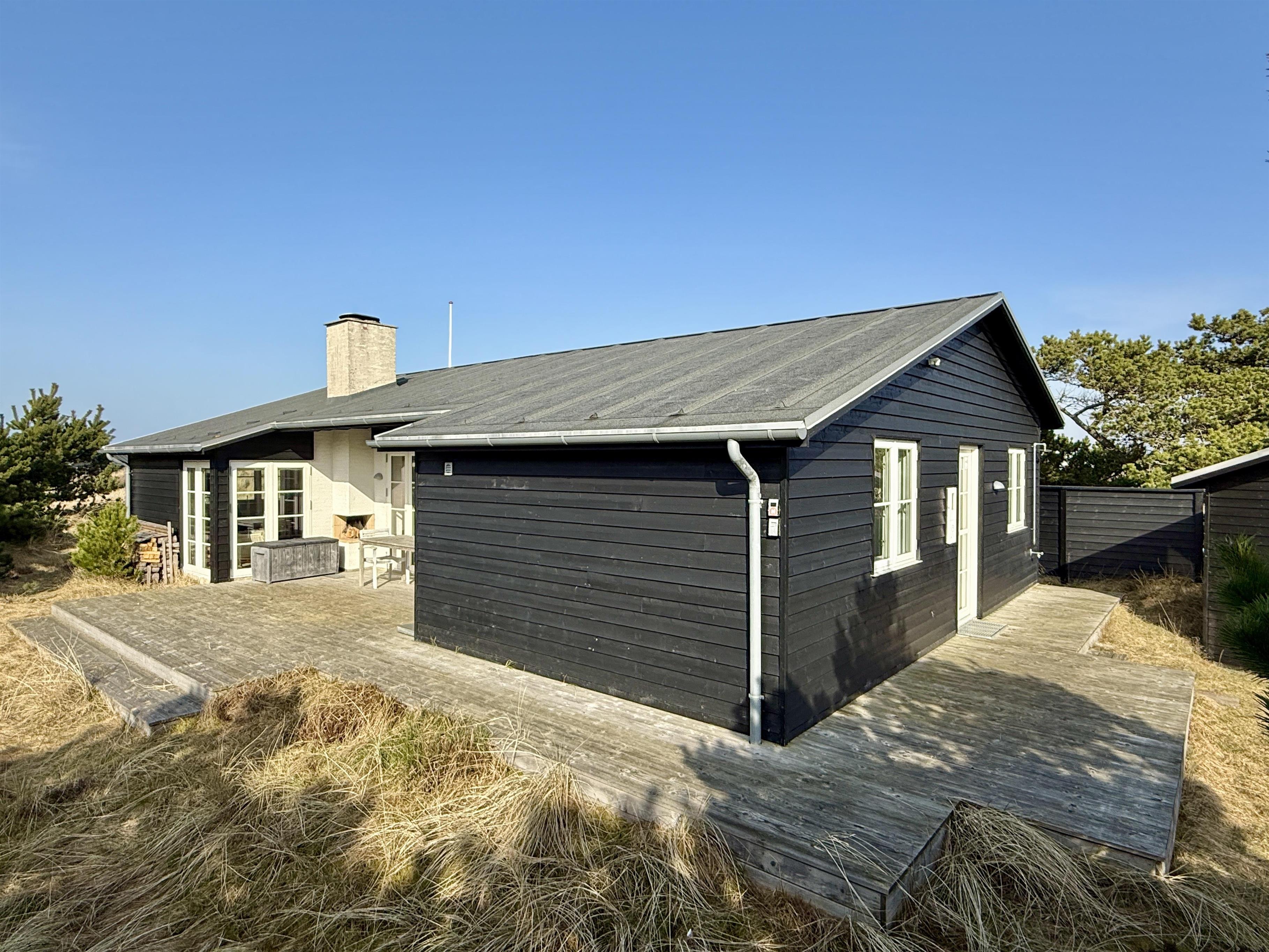 Udenfor får du en stor klitgrund på 2500 m2, og den afskærmede beliggenhed midt i klitterne skaber en særlig fornemmelse af at være tæt på naturen. Her kan du nyde udelivet på den åbne terrasse, når solen står højt, eller rykke ind på den overdækkede terrasse, når duggen falder, eller vinden tager til. Tænd op i udepejsen i de lange sommeraftener med god grill mad og afslappet stemning, mens børn og voksne kan finde plads til leg, afslapning og små pauser i læ.