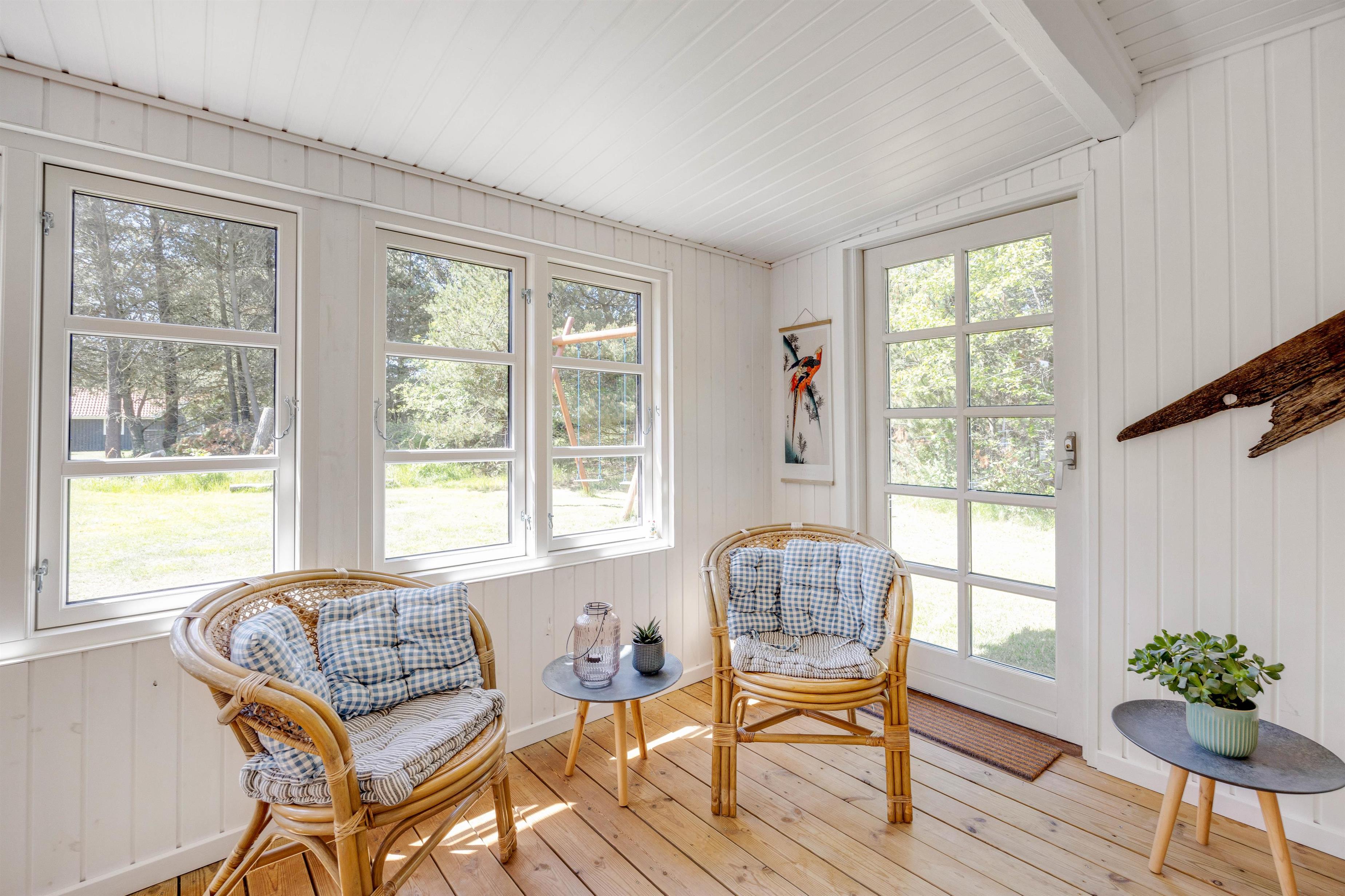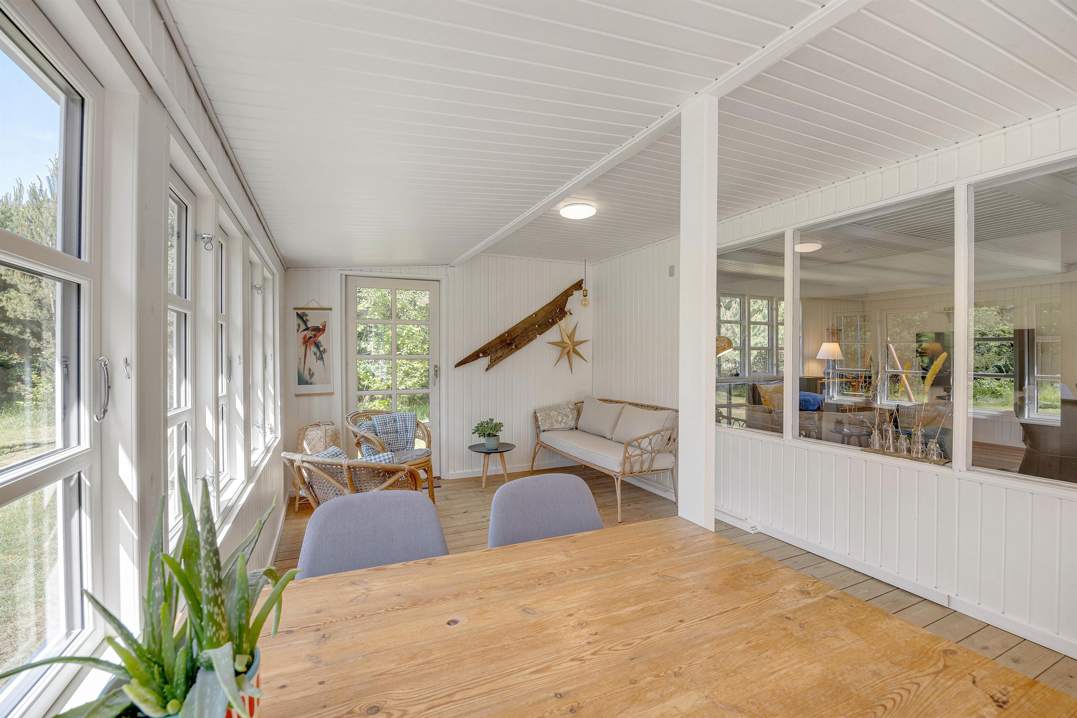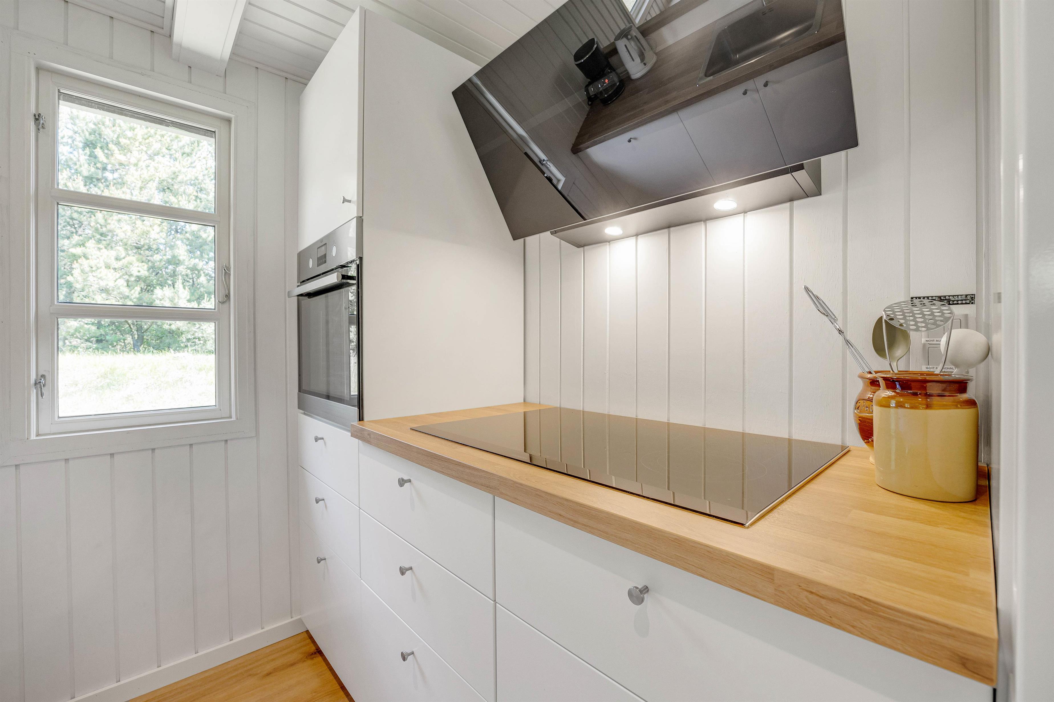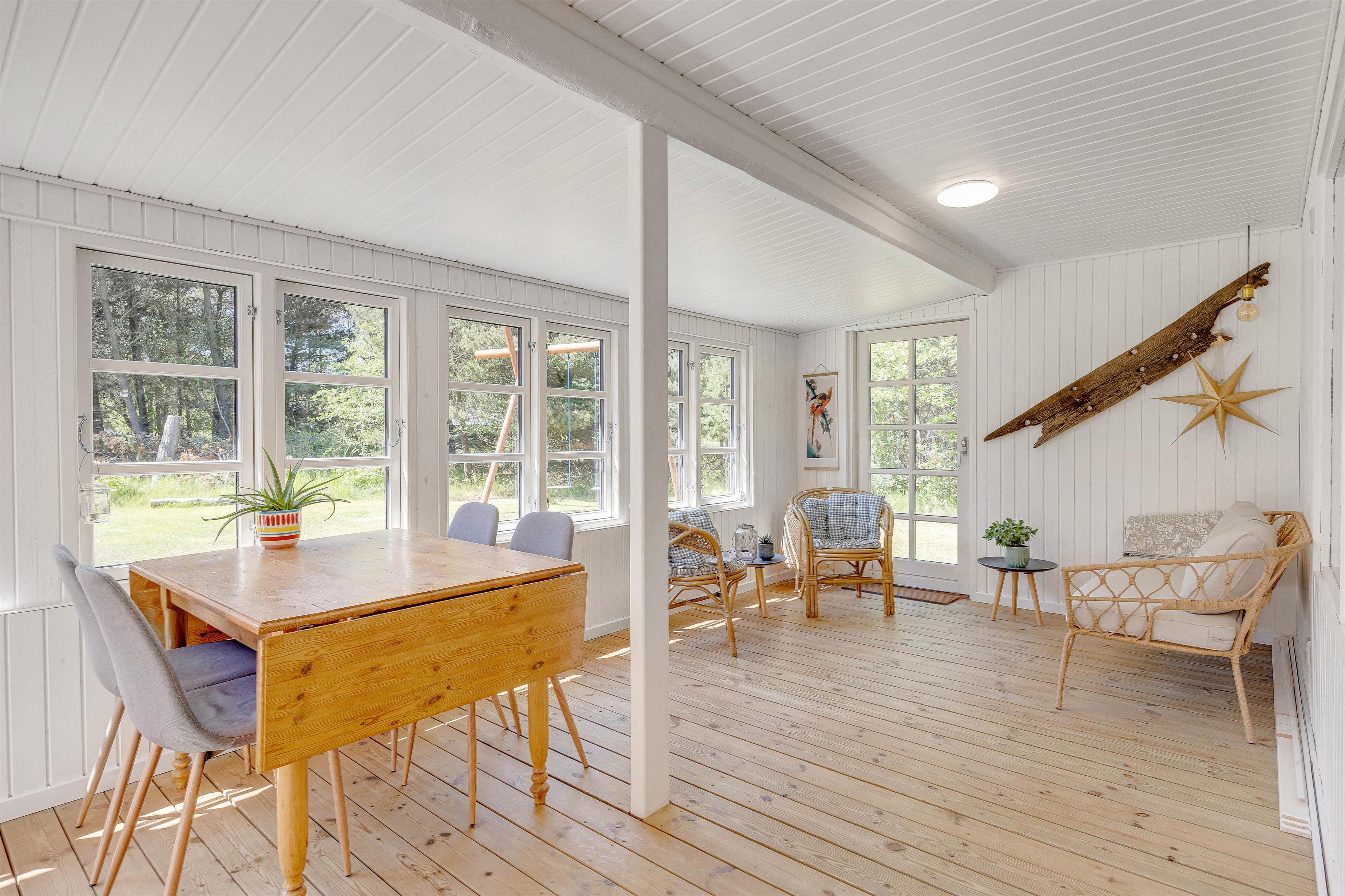 Køkkenet er praktisk indrettet med kig til den hyggelige stue, hvor brændeovnen og de gode siddemuligheder lægger op til mange timer med fællesskab omkring gode måltider, familiespil og snak. For energibesparende varme sørger husets varmepumpe. Især i den kolde årstid, når man ikke kan sidde på terrassen, men alligevel gerne vil nyde naturen og lyset, har man her mulighed for det i husets ”udestue”.