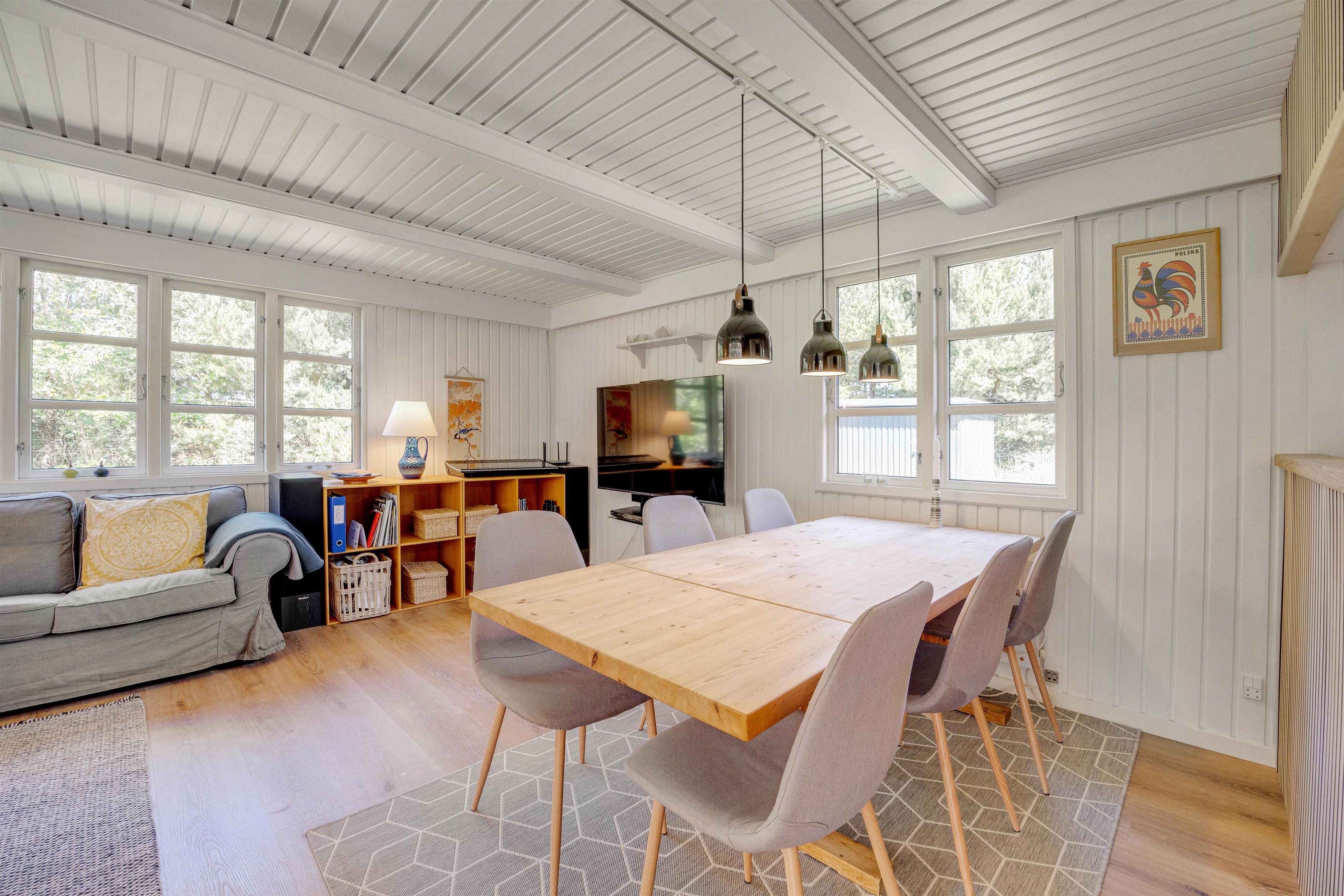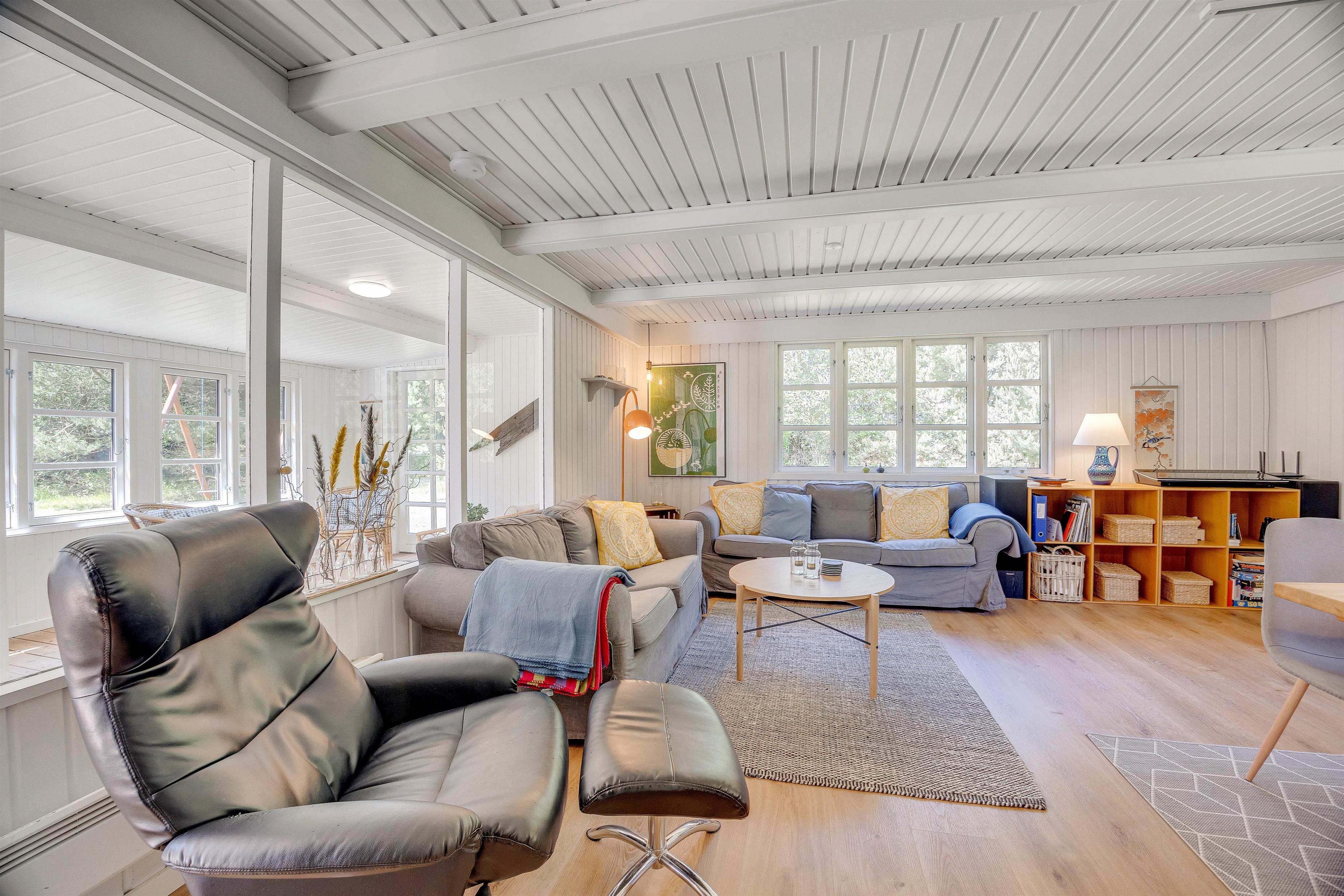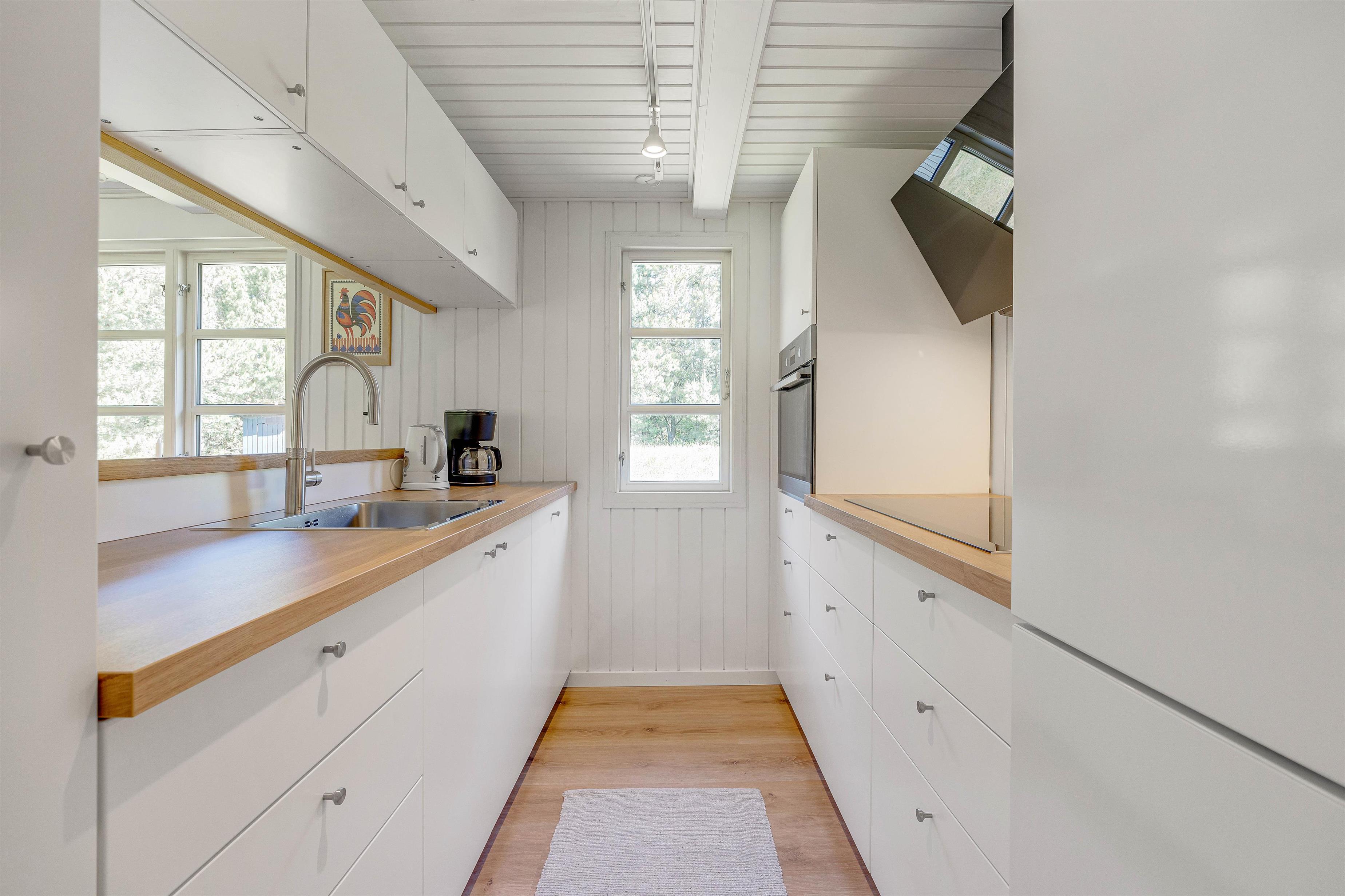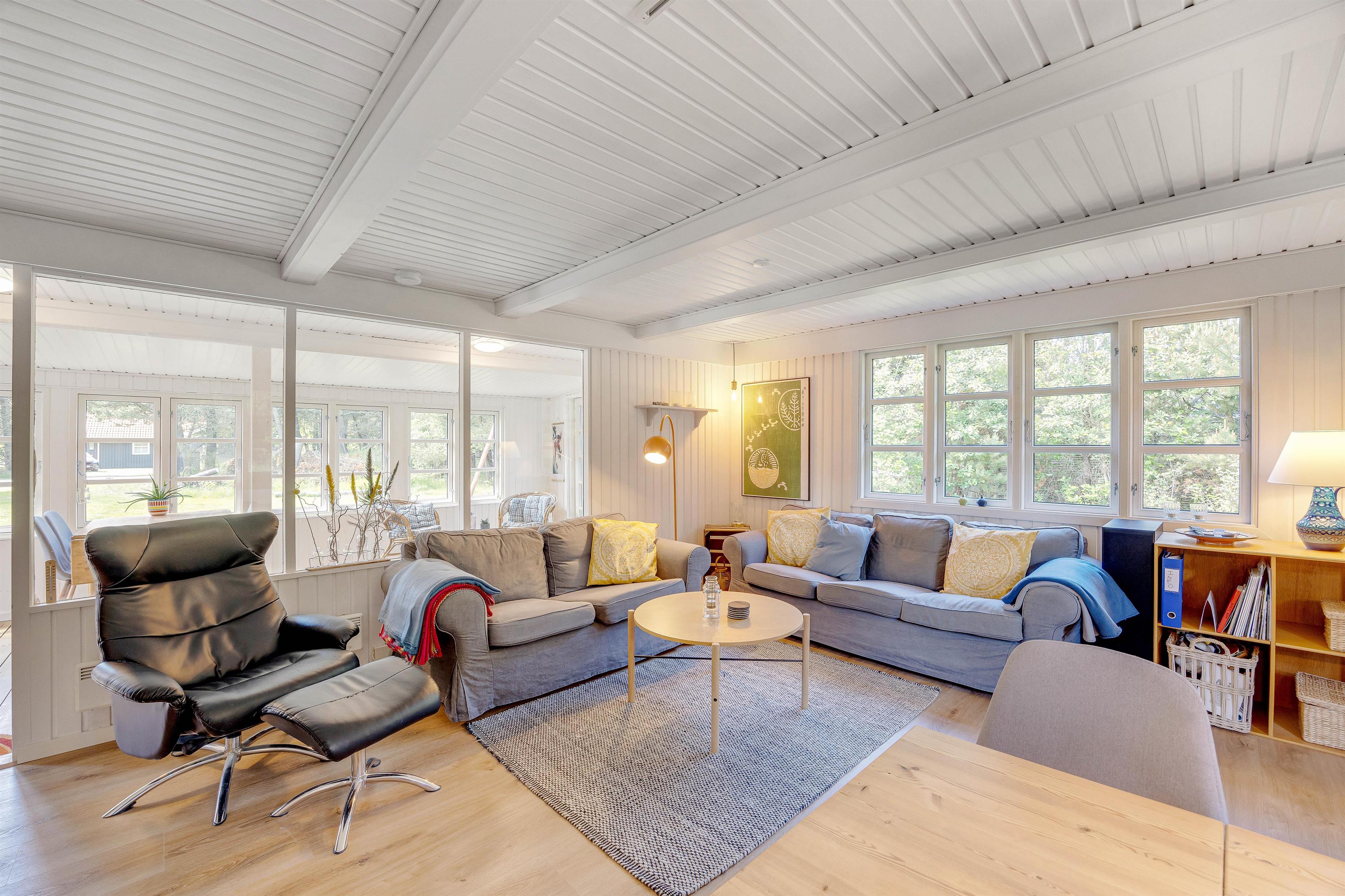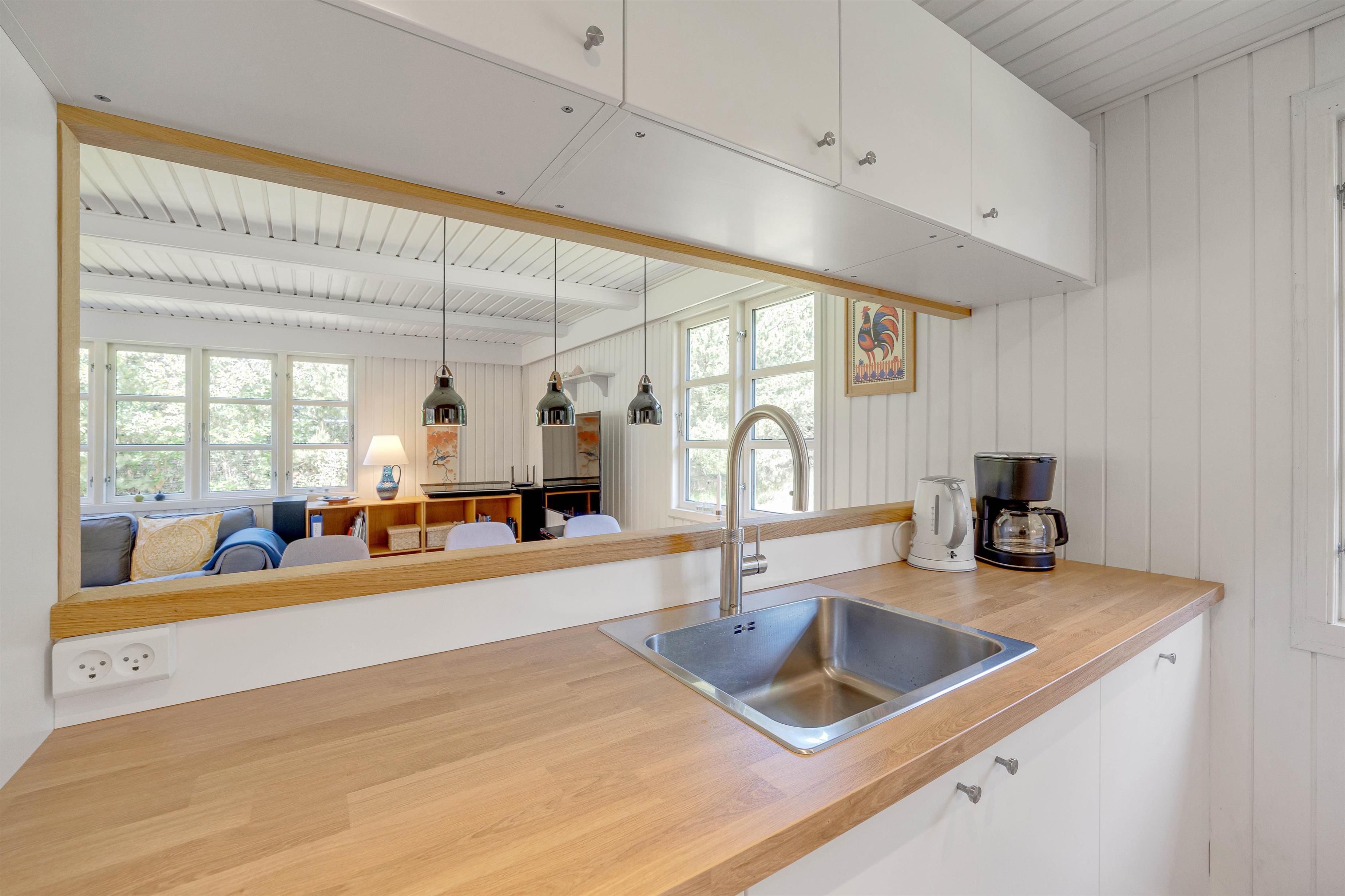 Køkkenet er praktisk indrettet med kig til den hyggelige stue, hvor brændeovnen og de gode siddemuligheder lægger op til mange timer med fællesskab omkring gode måltider, familiespil og snak. For energibesparende varme sørger husets varmepumpe. Især i den kolde årstid, når man ikke kan sidde på terrassen, men alligevel gerne vil nyde naturen og lyset, har man her mulighed for det i husets ”udestue”.