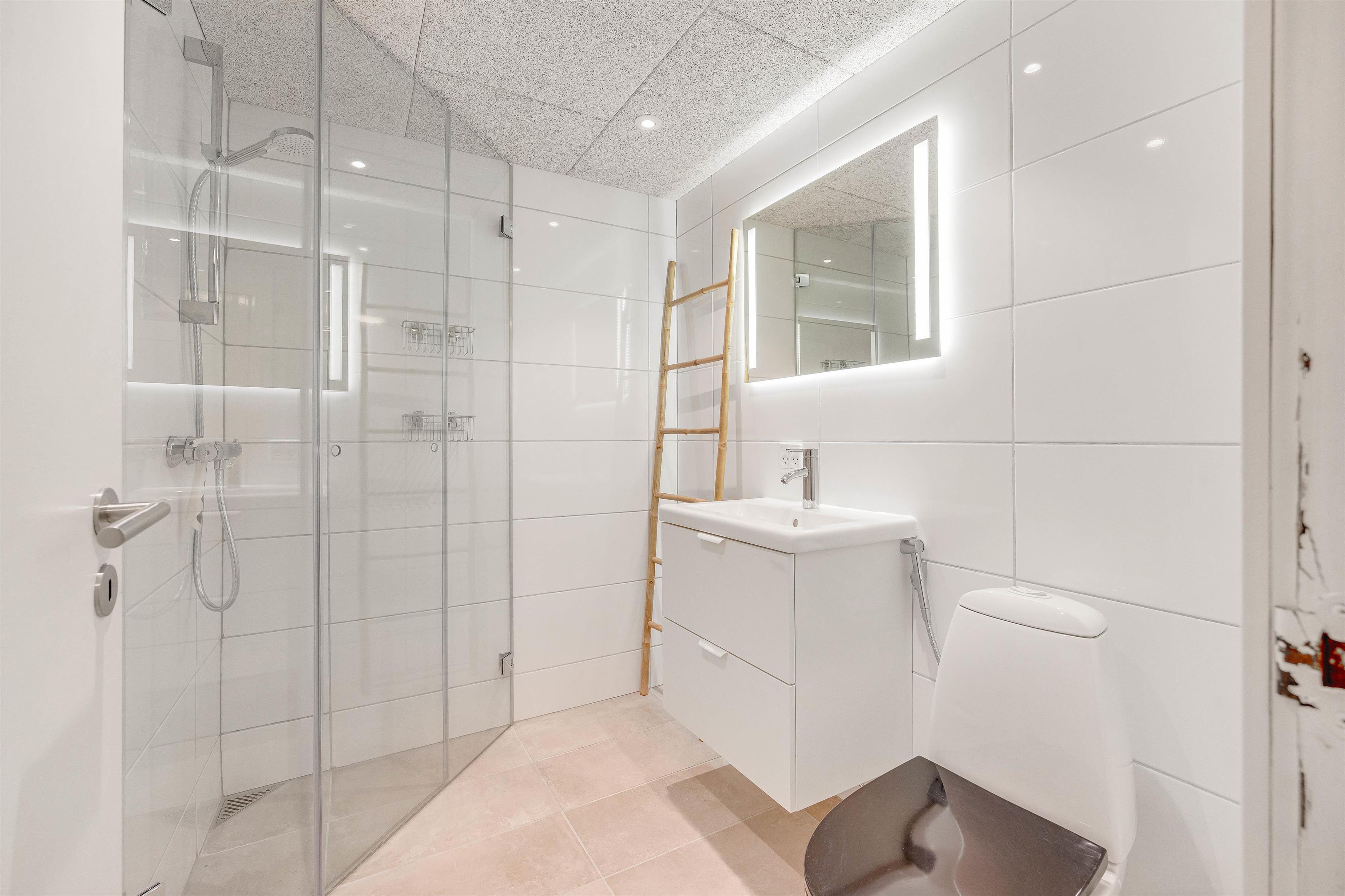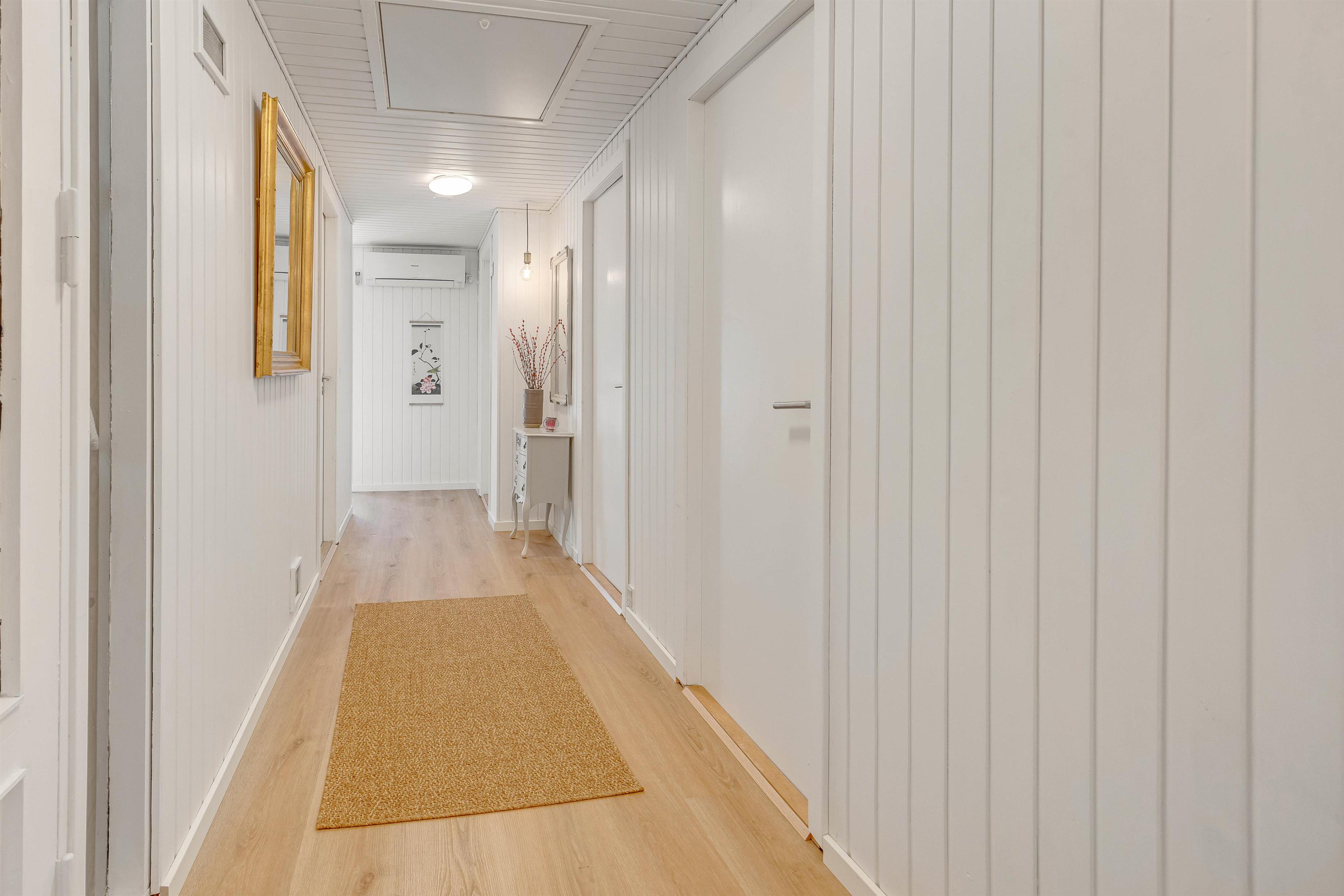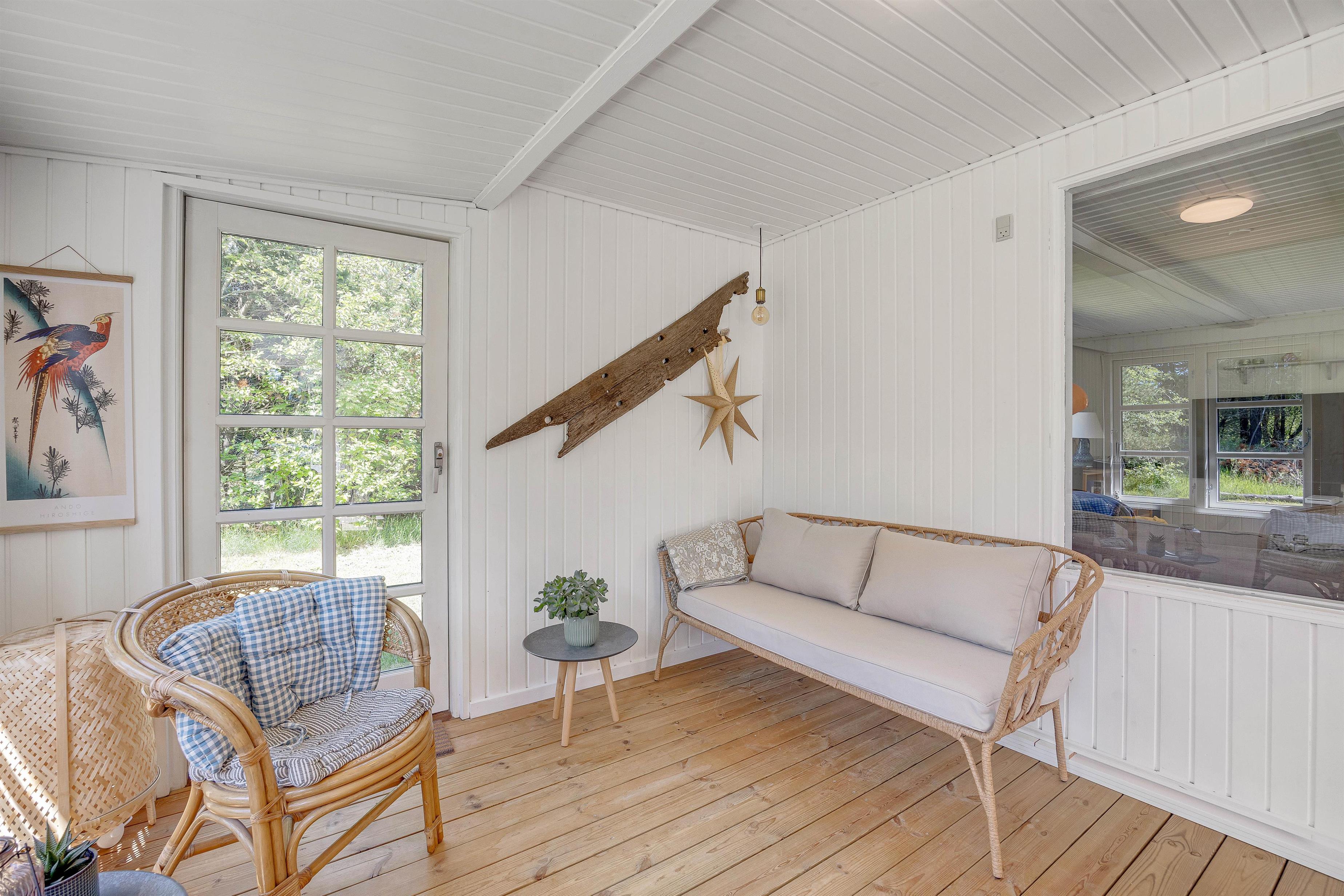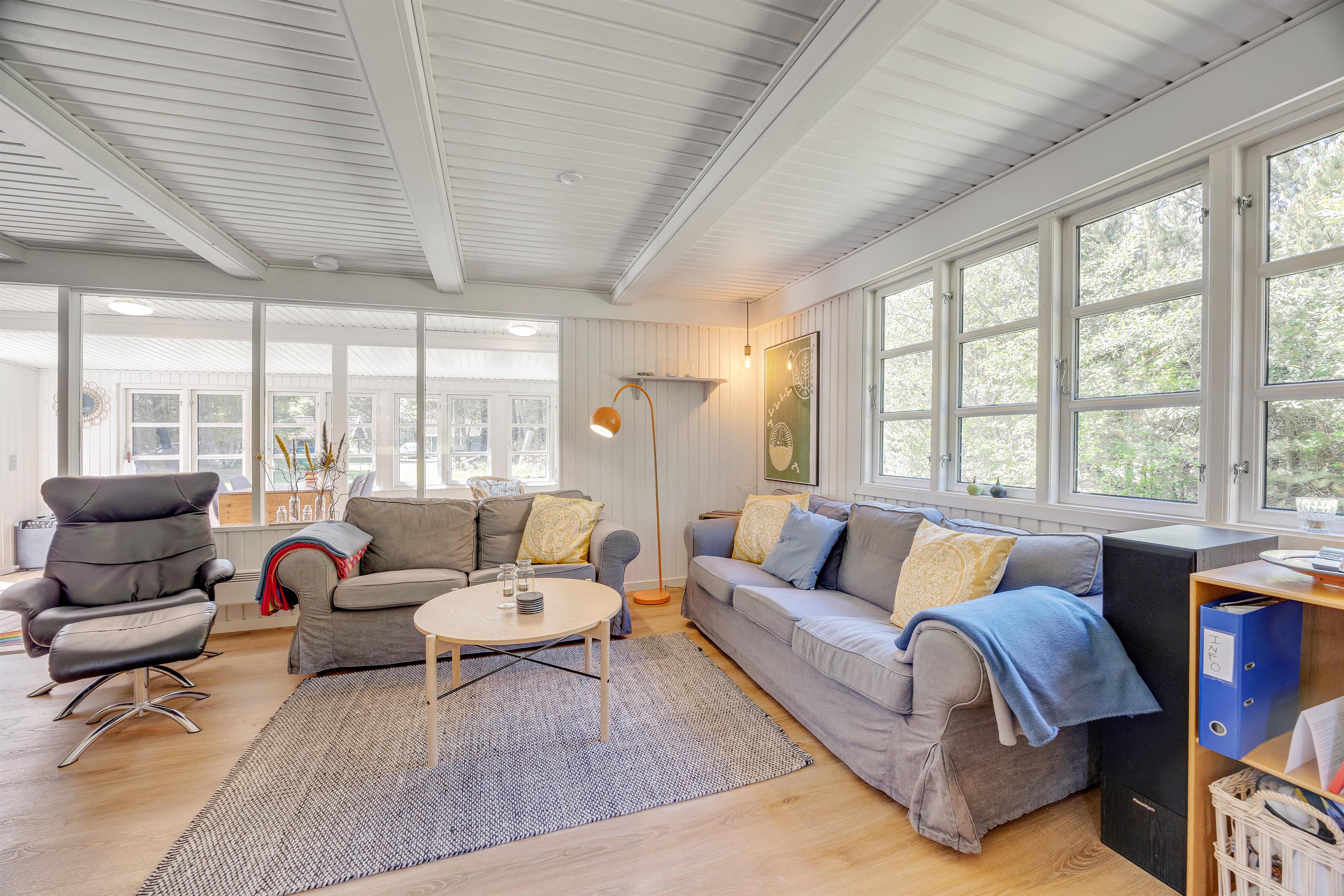 Køkkenet er praktisk indrettet med kig til den hyggelige stue, hvor brændeovnen og de gode siddemuligheder lægger op til mange timer med fællesskab omkring gode måltider, familiespil og snak. For energibesparende varme sørger husets varmepumpe. Især i den kolde årstid, når man ikke kan sidde på terrassen, men alligevel gerne vil nyde naturen og lyset, har man her mulighed for det i husets ”udestue”.