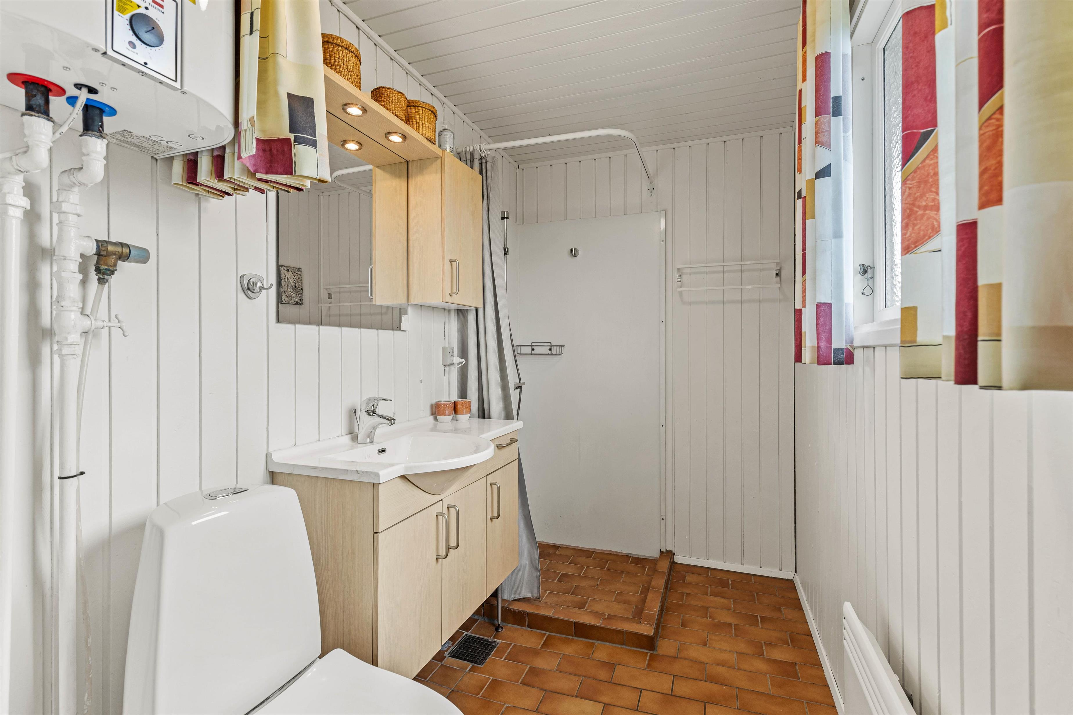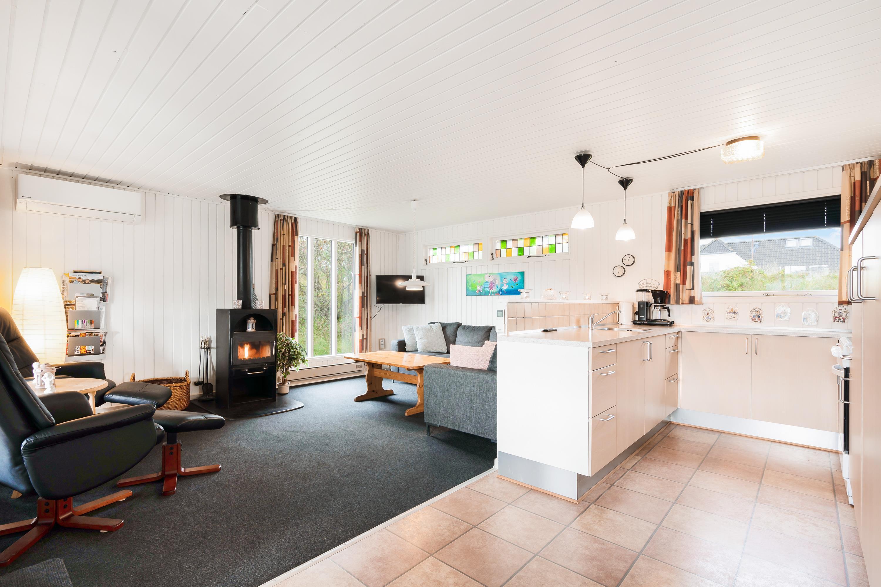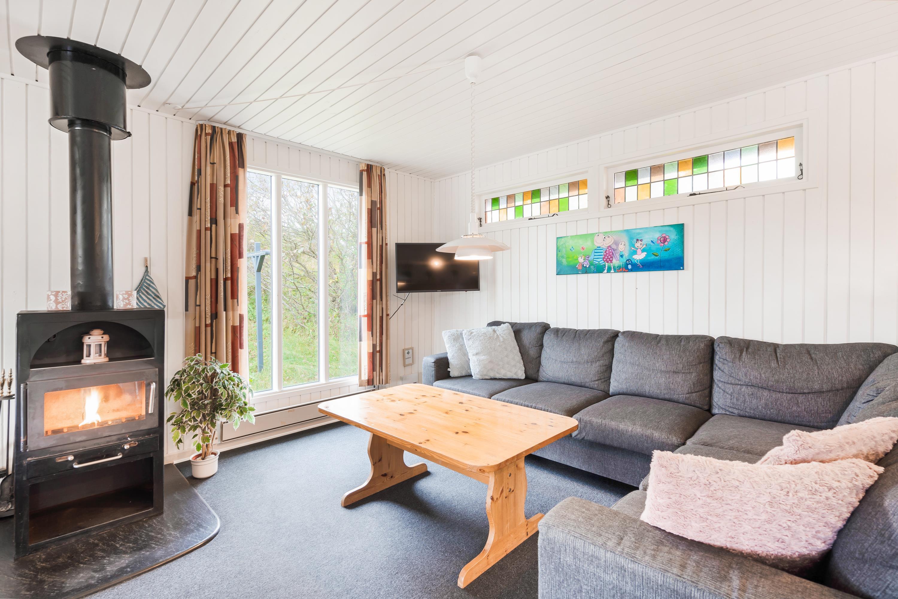 Sommerhuset er hyggeligt indrettet med personlige detaljer, der sørger for, I kan føle jer godt tilpas og hjemme i indretningen. Stuen ligger i åben forbindelse til køkkenet, så I får en følelse af at være sammen, selv om I laver forskellige ting. Måske slapper nogen af på sofaen, mens ilden knitrer i brændeovnen og andre er i gang med at forberede en lækker frokost med lokale råvarer.