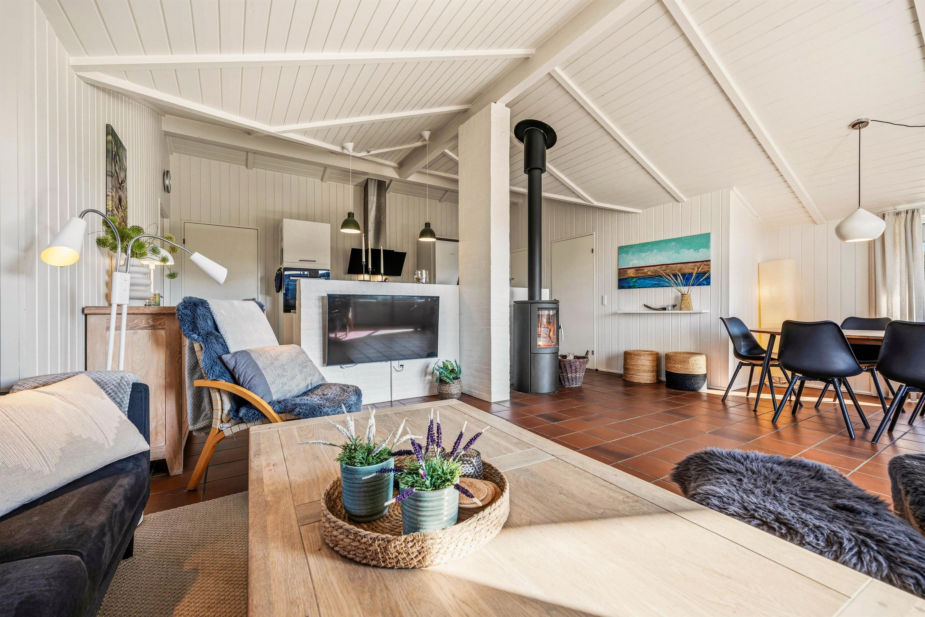 Sommerhuset er indrettet med 4 soverum, så I kan fordele jer godt og få privatliv, når dagen går på hæld. Der er 2 dobbeltsenge og 4 enkeltsenge, hvilket gør det oplagt til både børnefamilier, vennegrupper og flere generationer samlet. Indenfor skaber brændeovnen en ekstra hyggelig stemning på kølige aftener, mens en luft til luft varmepumpe hjælper med en behagelig temperatur året rundt. Når I vender hjem efter en lang dag ved stranden, kan I sænke tempoet og nyde, at huset føles lyst og indbydende med god plads til at være sammen.