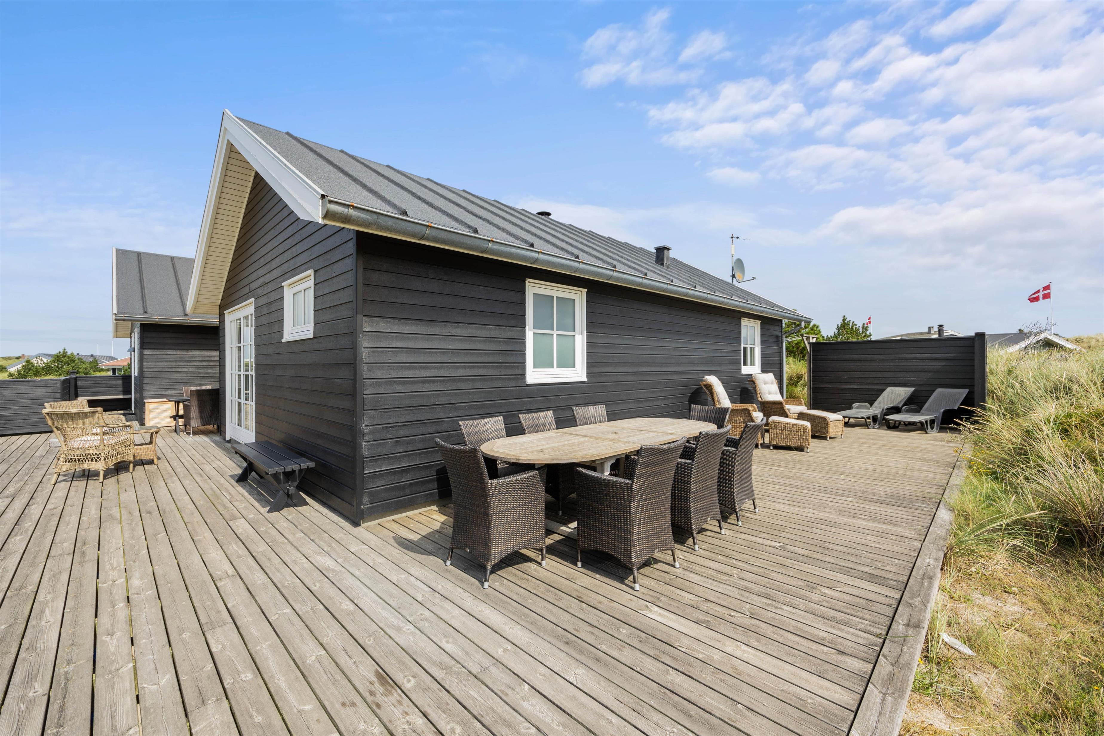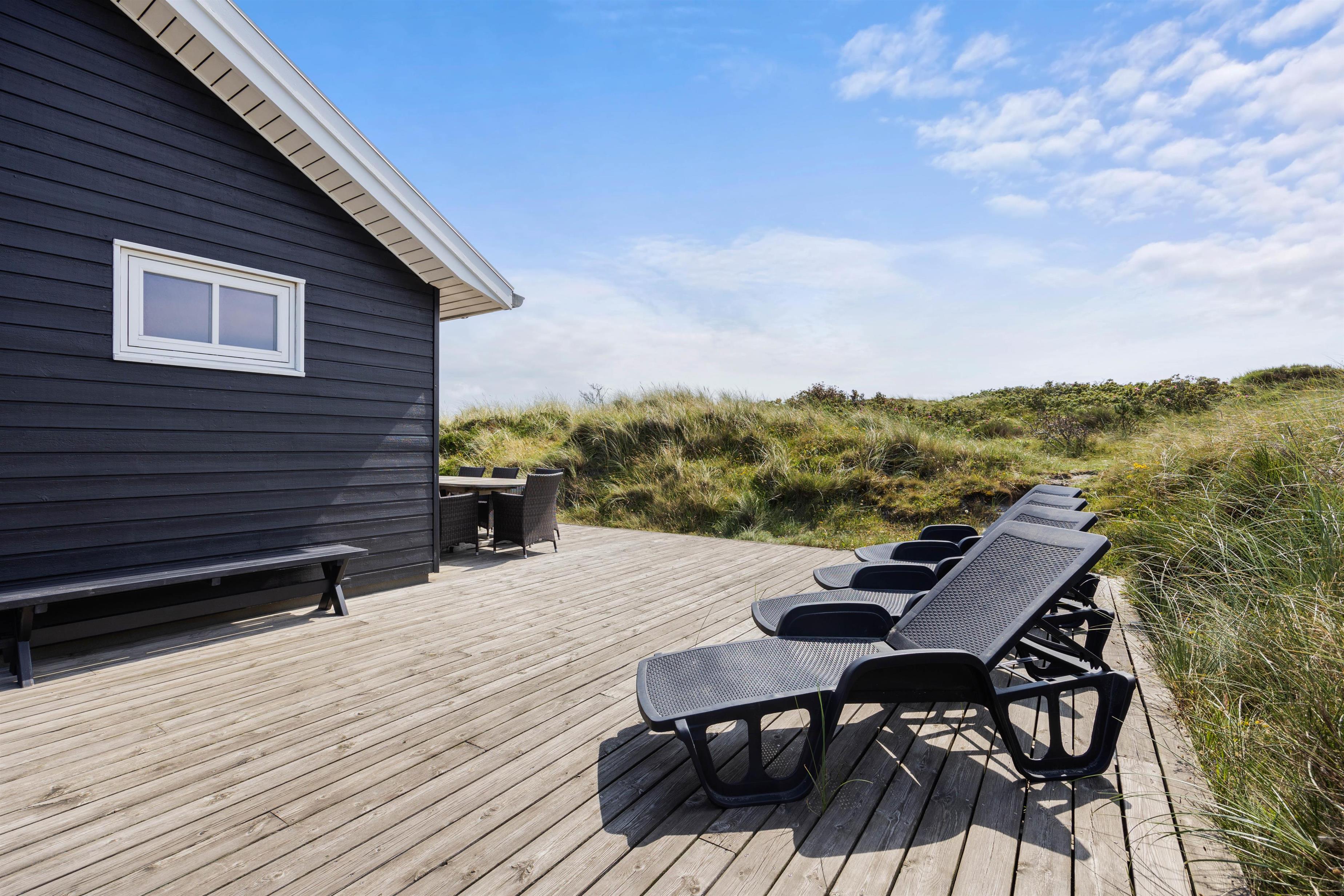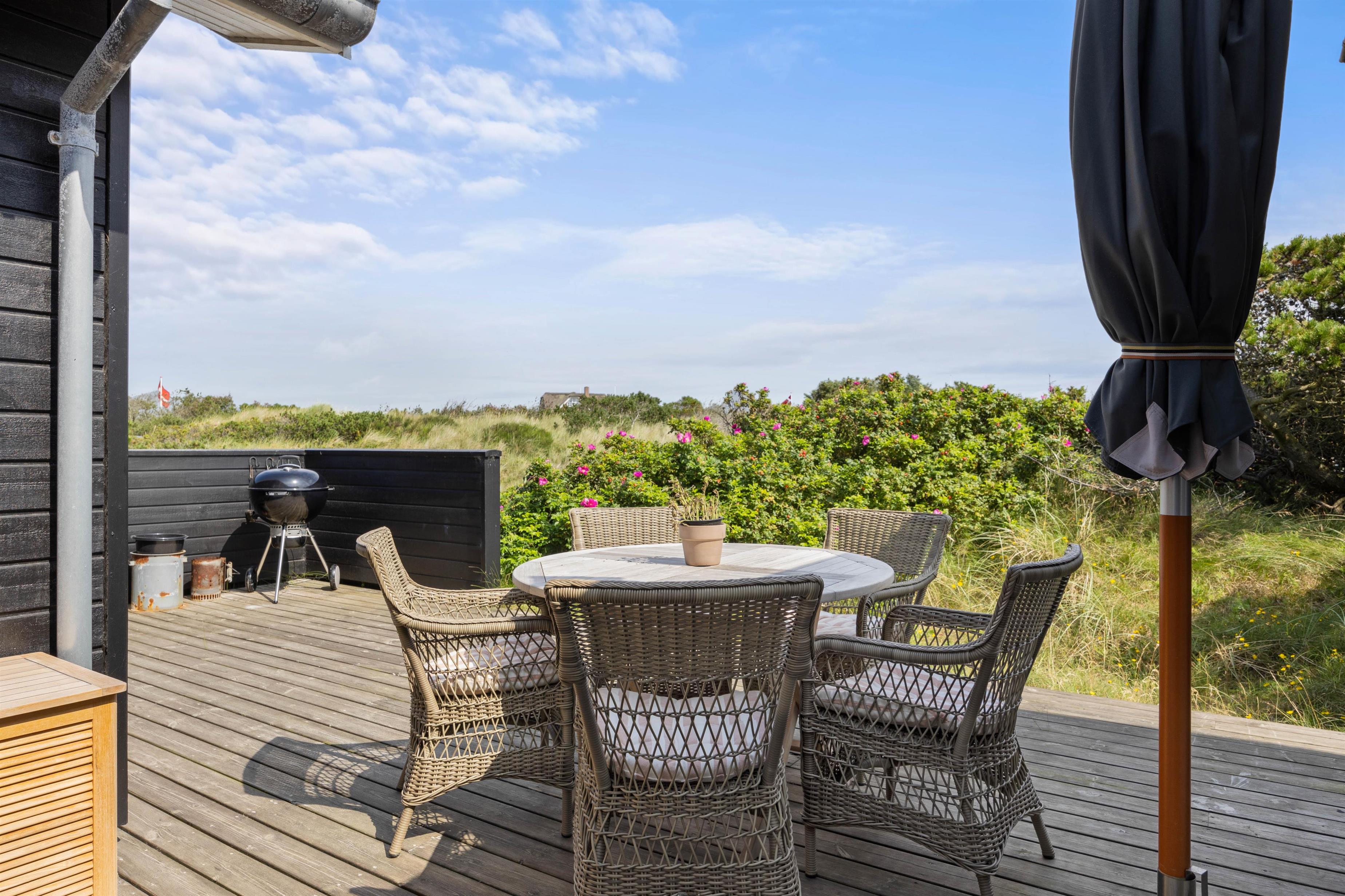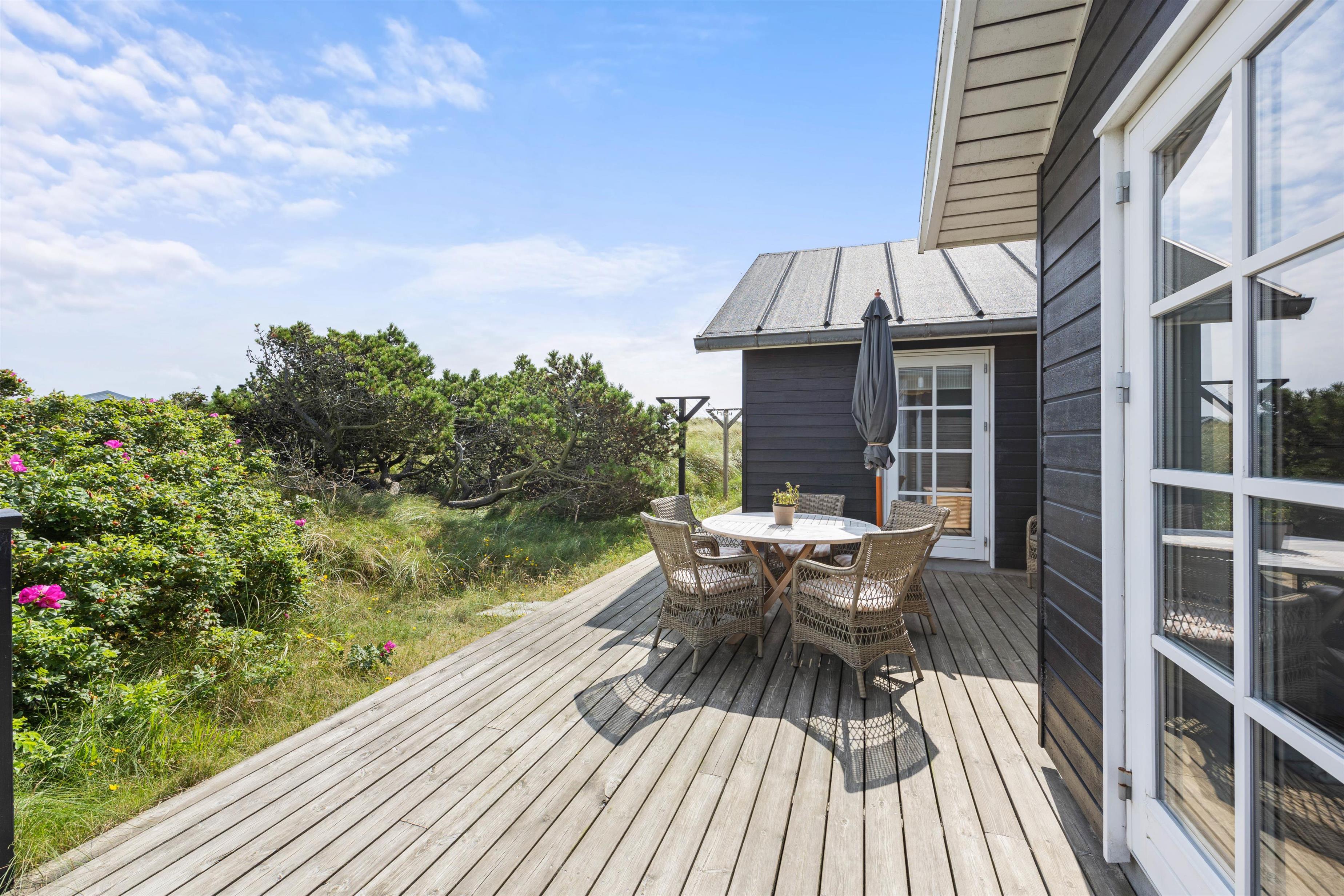 Der er masser af plads til at sole sig på de varme sommerdage. Der er gode træterrasser på begge sider af huset med udgang fra opholdsrummet. På den store sydvestvendte terrasse kan I slænge jer i liggestolene eller nyde en kop kaffe ved havebordet i de vestjyske omgivelser. Om aftenen står grillen klar, så I kan tilberede aftensmaden under åben himmel.