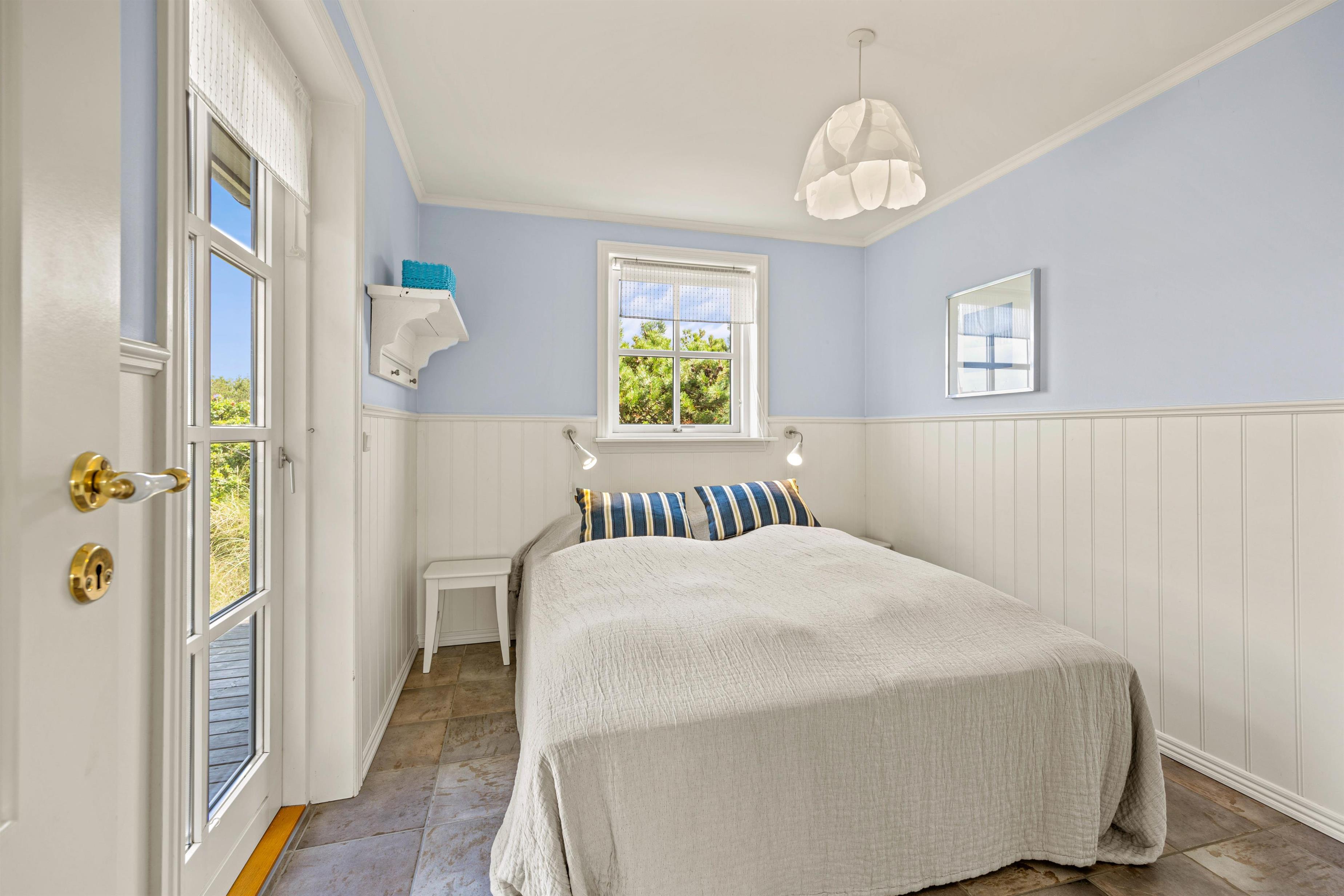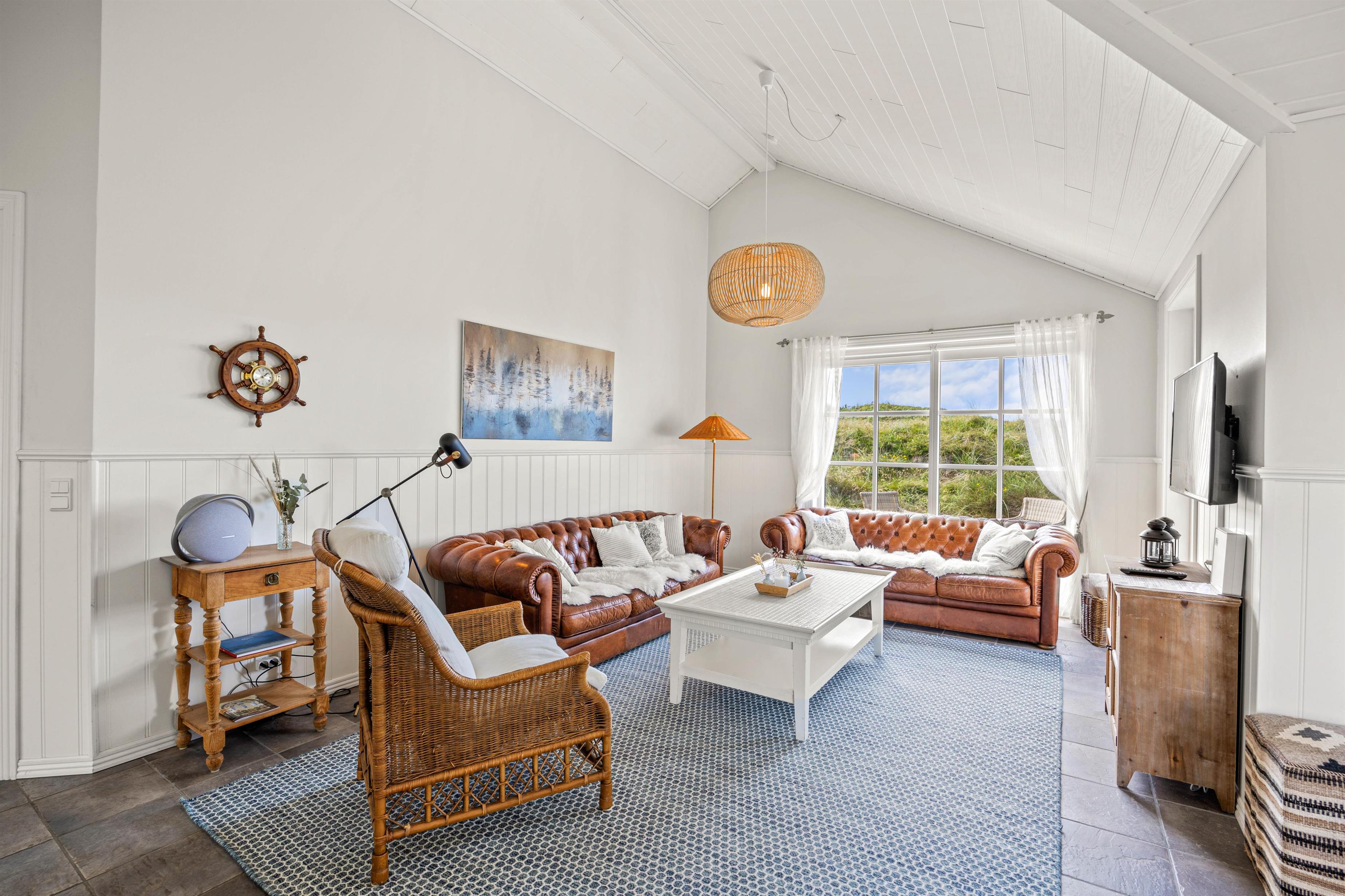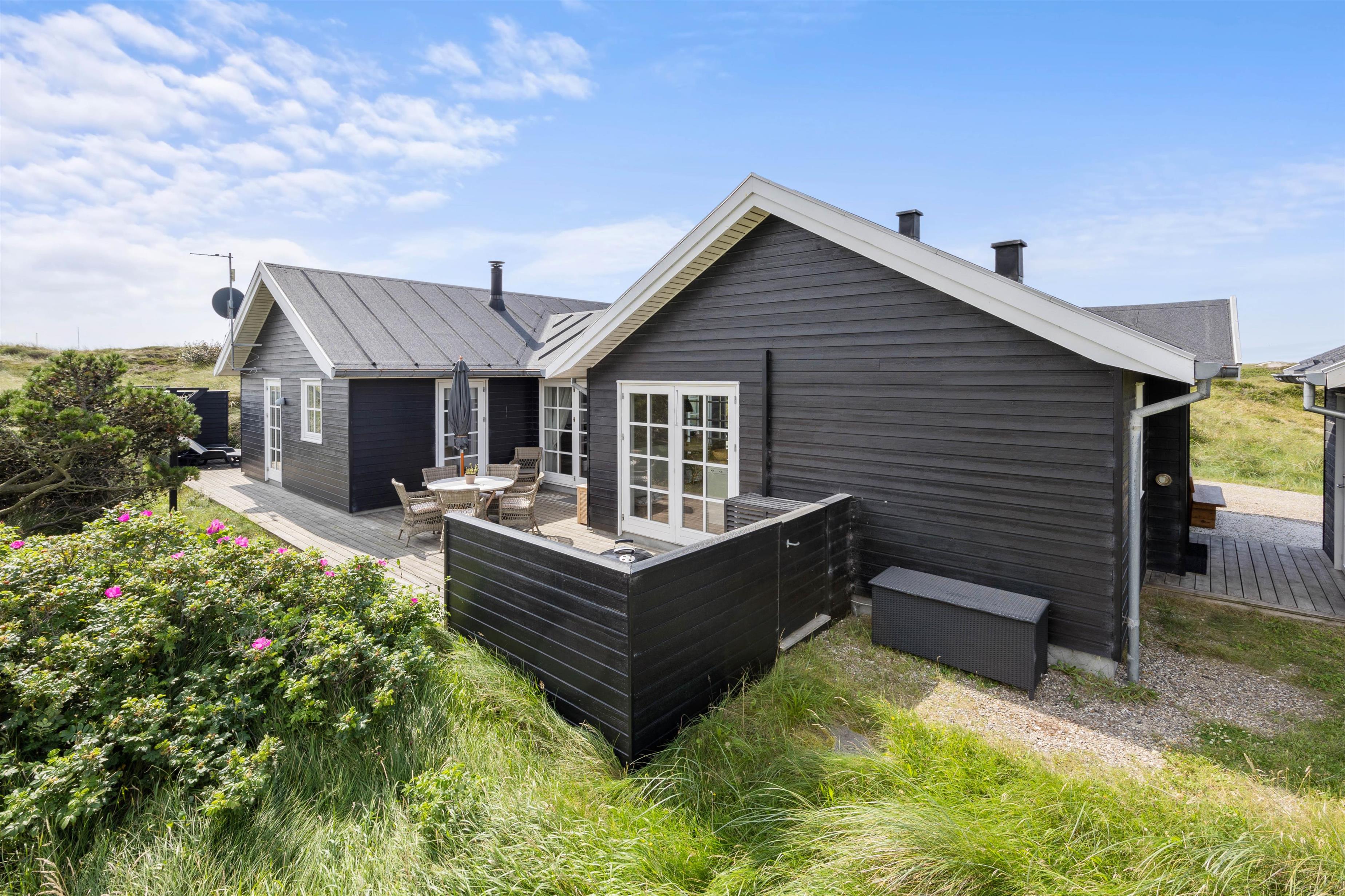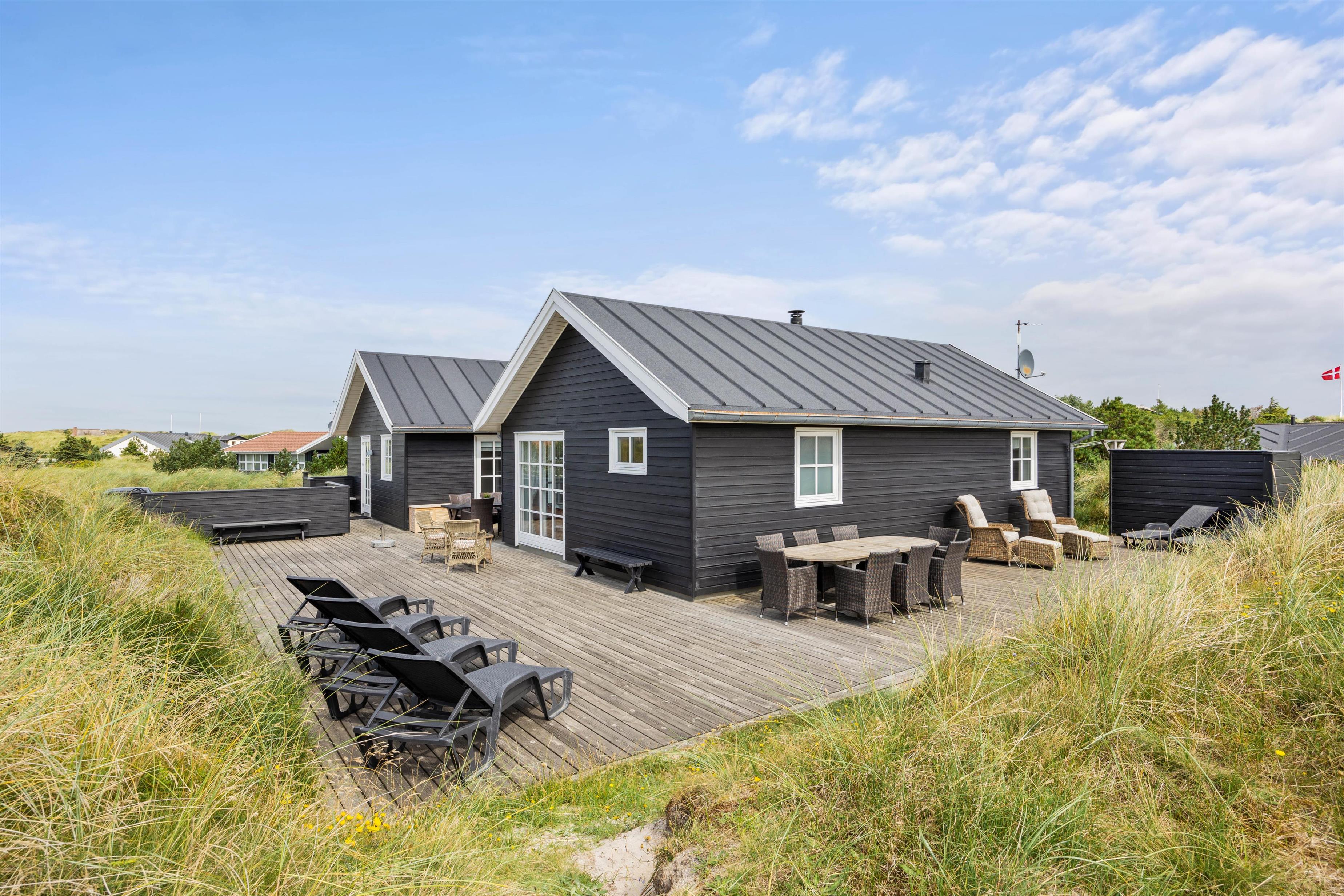 Kun 300 meter fra det brusende Vesterhav finder I dette store sommerhus til 8 personer. I vil hurtigt falde til i den lyse og venlige indretning med højt til loftet og lækre wellnessfaciliteter, og på den store terrasse finder alle feriegæster nemt en plads i solen.