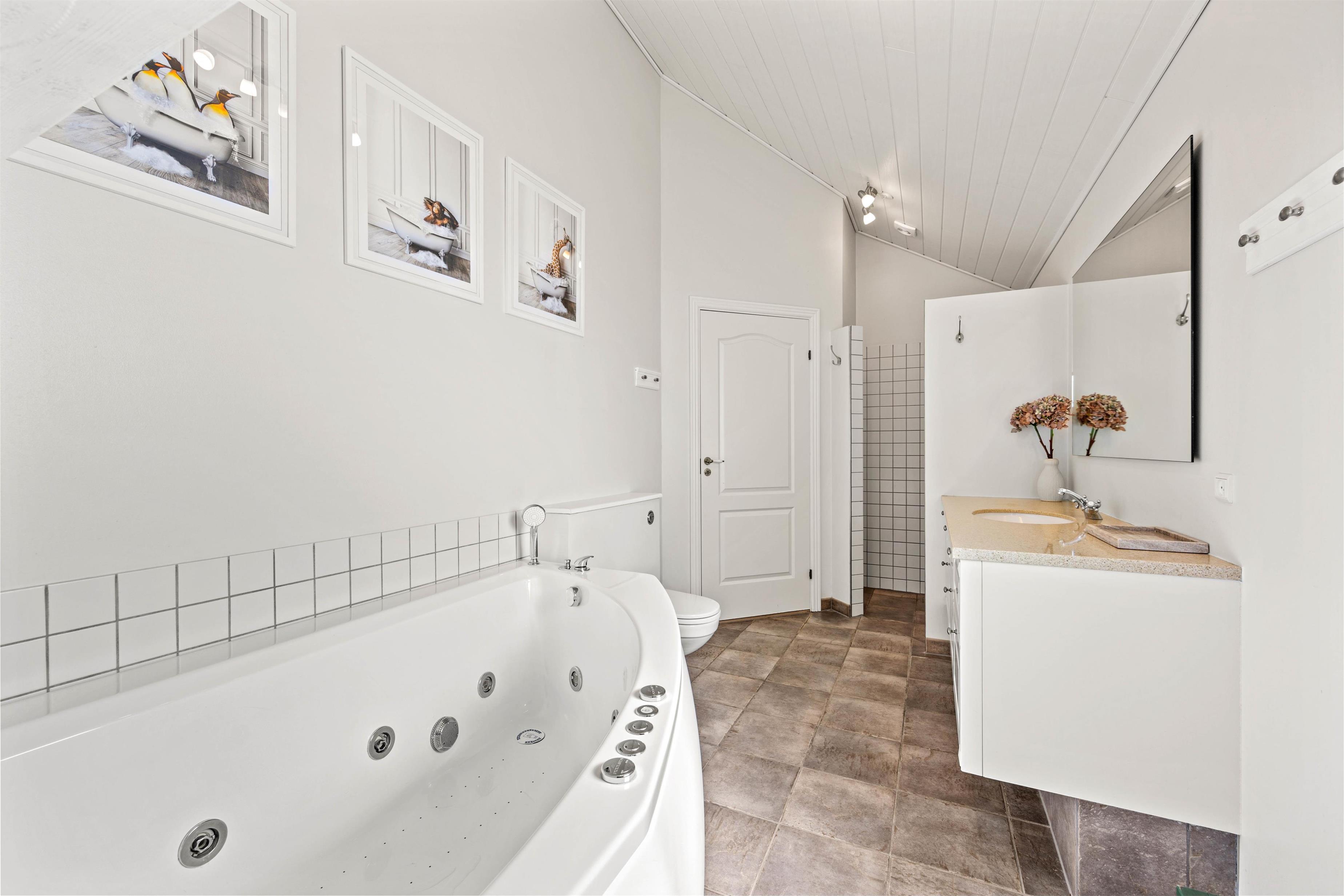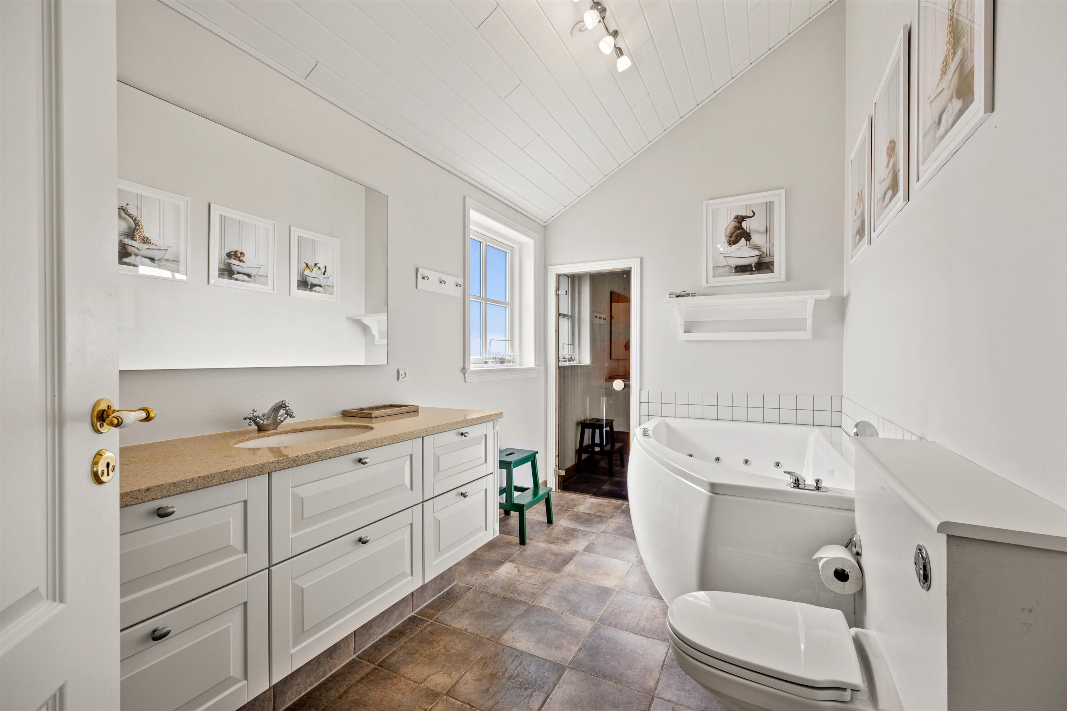 Huset er indrettet med 2 badeværelser (med gulvvarme), og på det største badeværelse får I jeres helt egen lille wellnessoase med sauna og spabad. Få varmen efter en forfriskende gåtur langs vandet eller rund en dejlig feriedag af med en afslappende wellness-session - så bliver det ikke bedre!