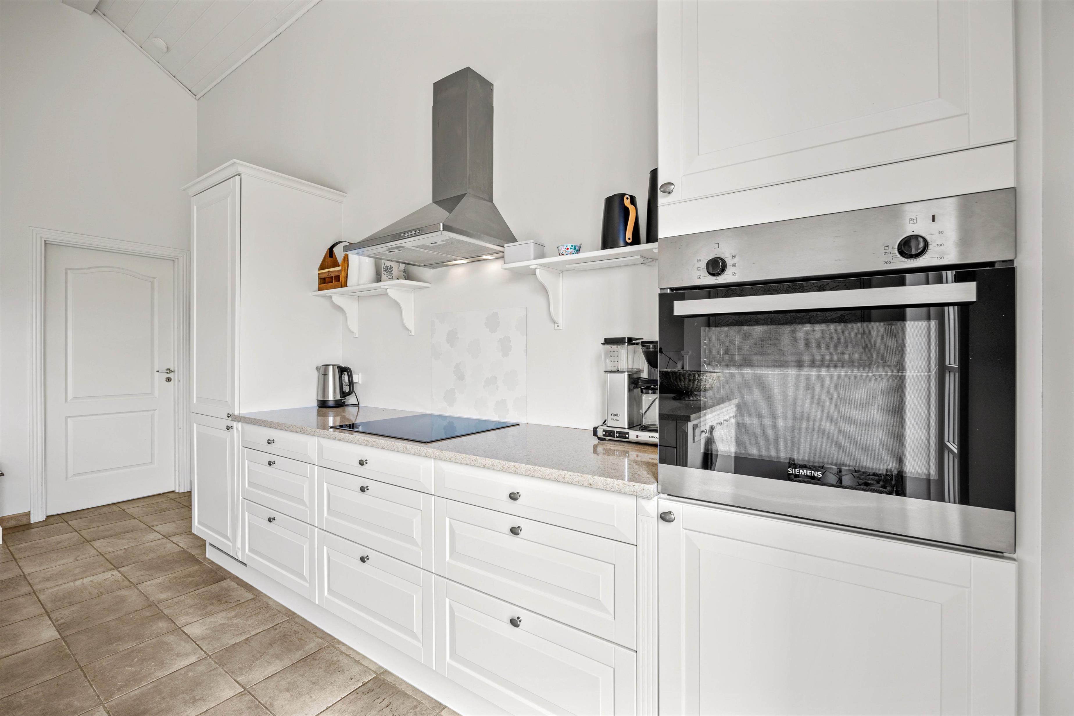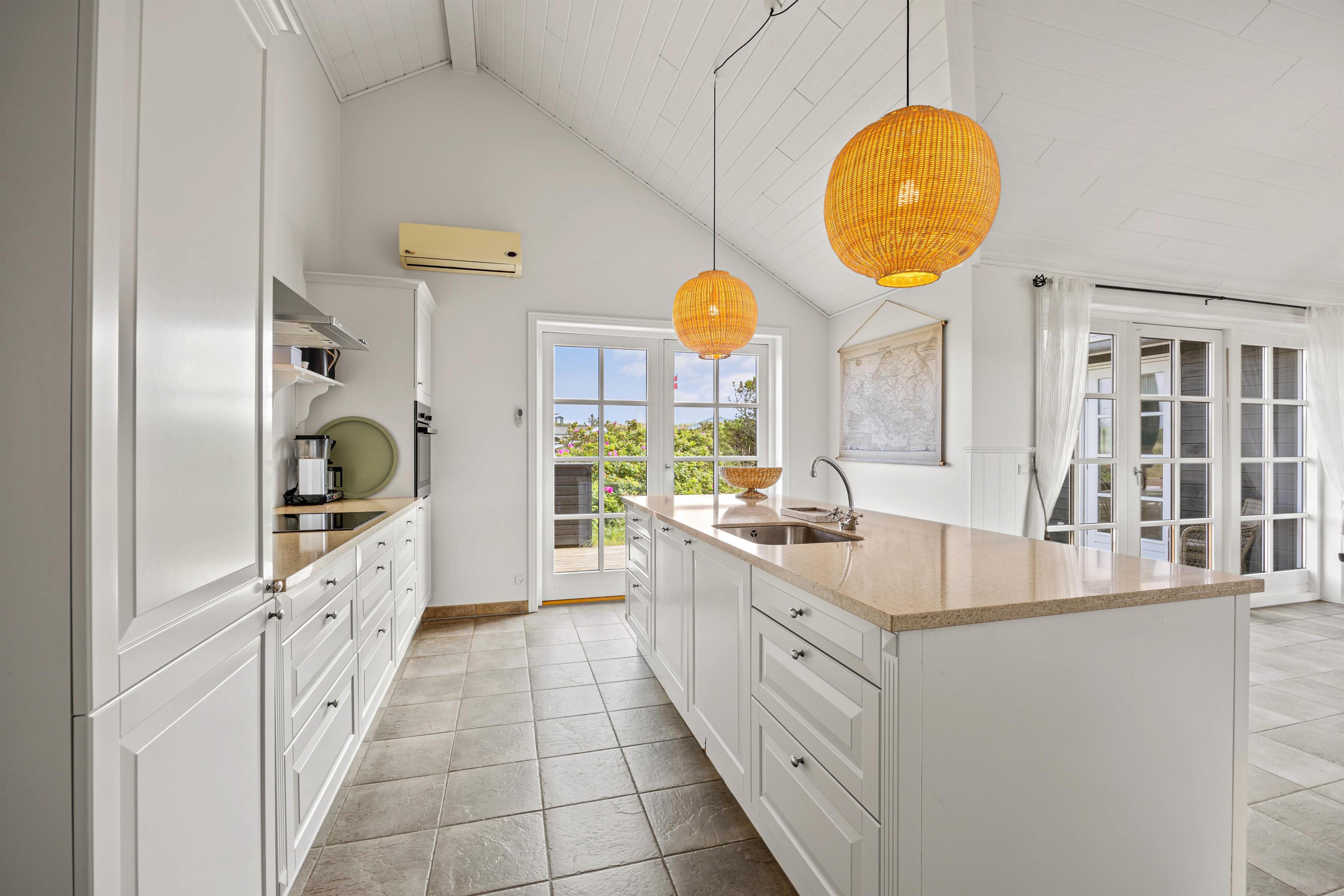I det store opholdsrum står brændeovnen, som sørger for dejlig varme på de kølige årstider, og de knitrende flammer fylder rummet med god ferieatmosfære. Køkkenet er udstyret med opvaskemaskine og godt med service, så I kan slippe jeres indre kok løs og kreere de lækreste feriemåltider.