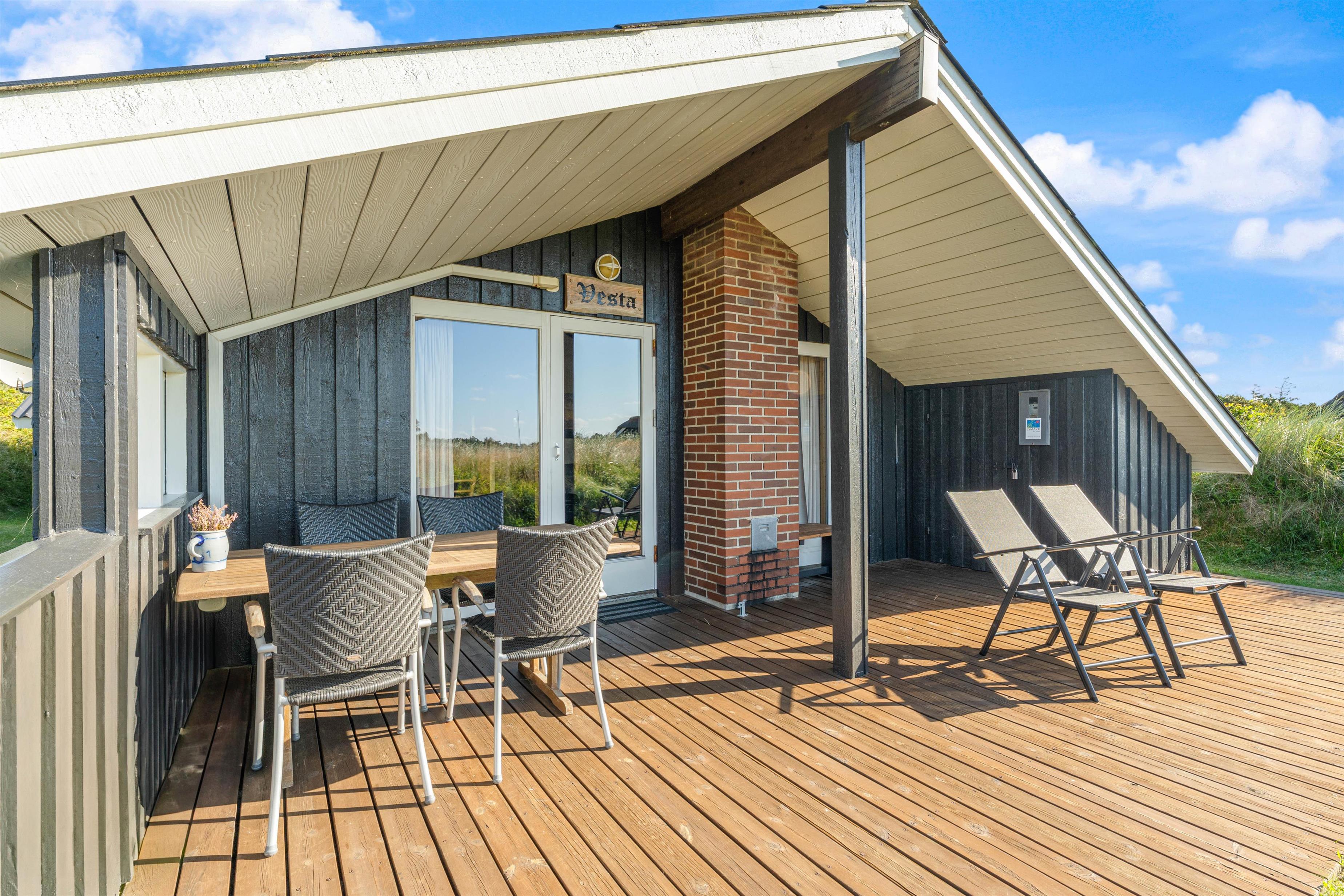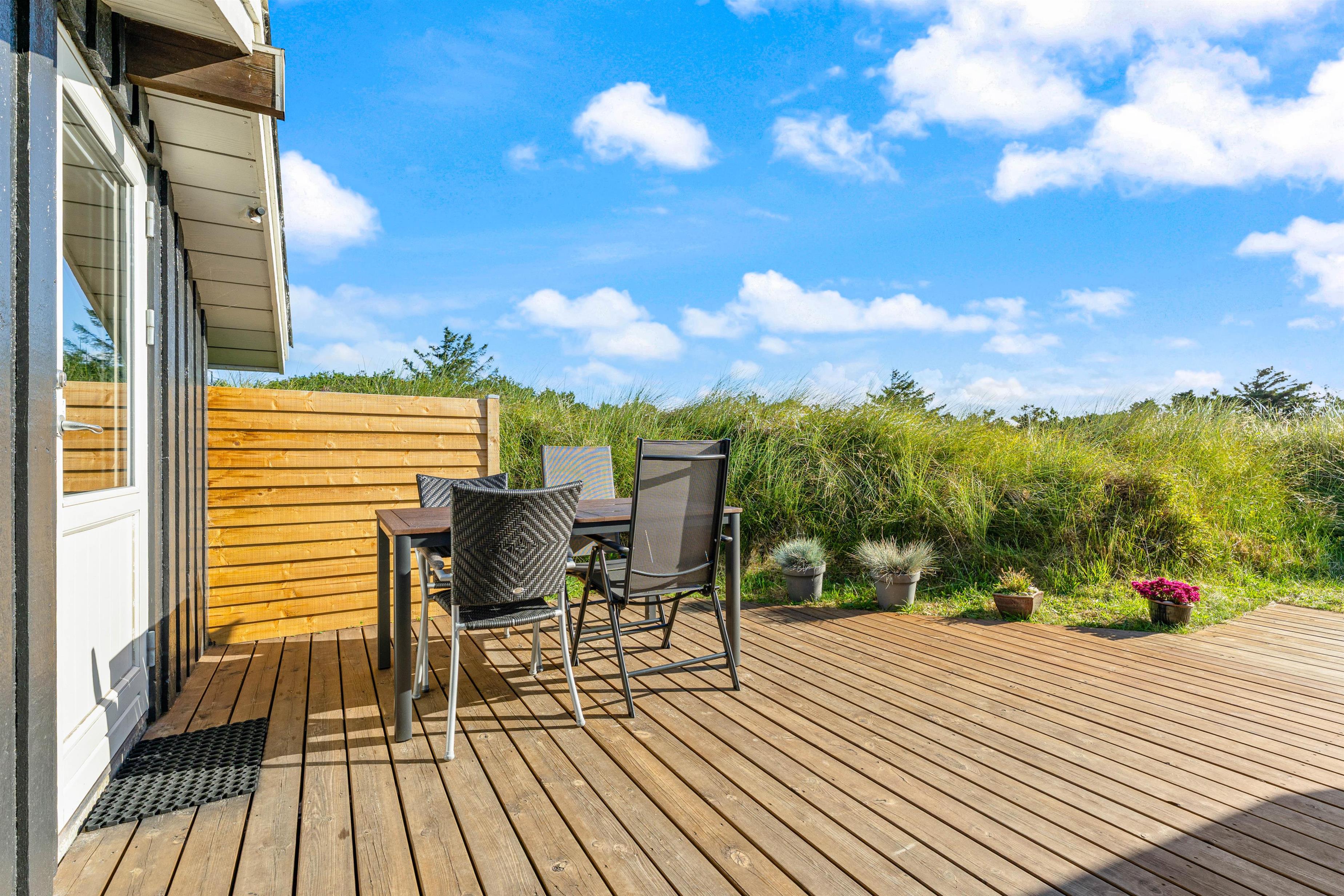 Sommerhuset ligger på en ugeneret grund for enden af en blind vej. Udendørs er I omgivet af naturlige læhegn af buske, træer og marehalm. De passer godt til det omgivende landskab og skaber hele året rundt en hyggelig atmosfære omkring huset. Det betyder, at I får et hus med rolige udeomgivelser, hvor I kan slappe af og nyde ferien. Til sommerhuset hører skønne terrasser, hvor du altid kan finde en krog med læ. Her kan I sidde og nyde de dejlige omgivelser, mens børnene leger i haven.