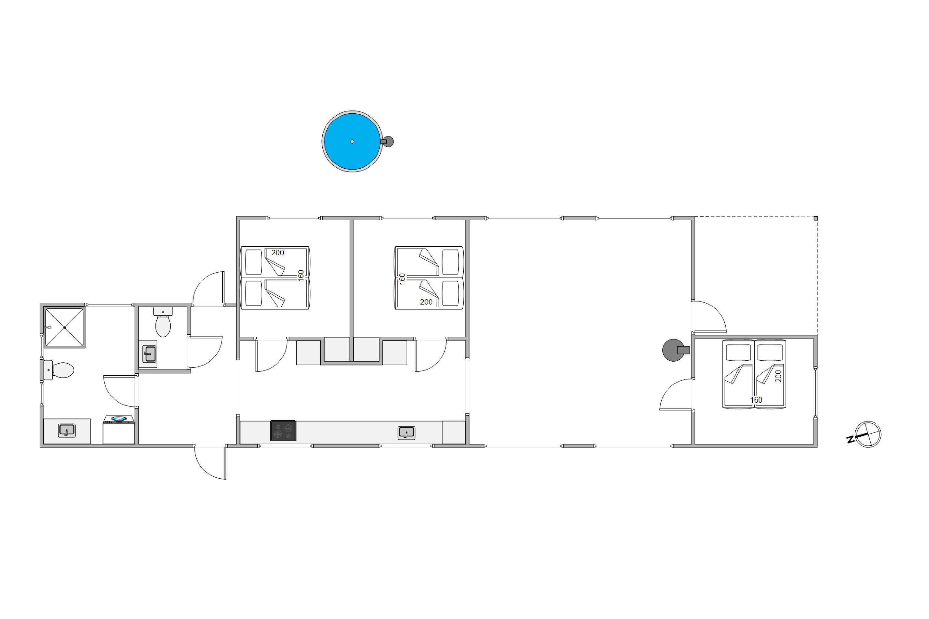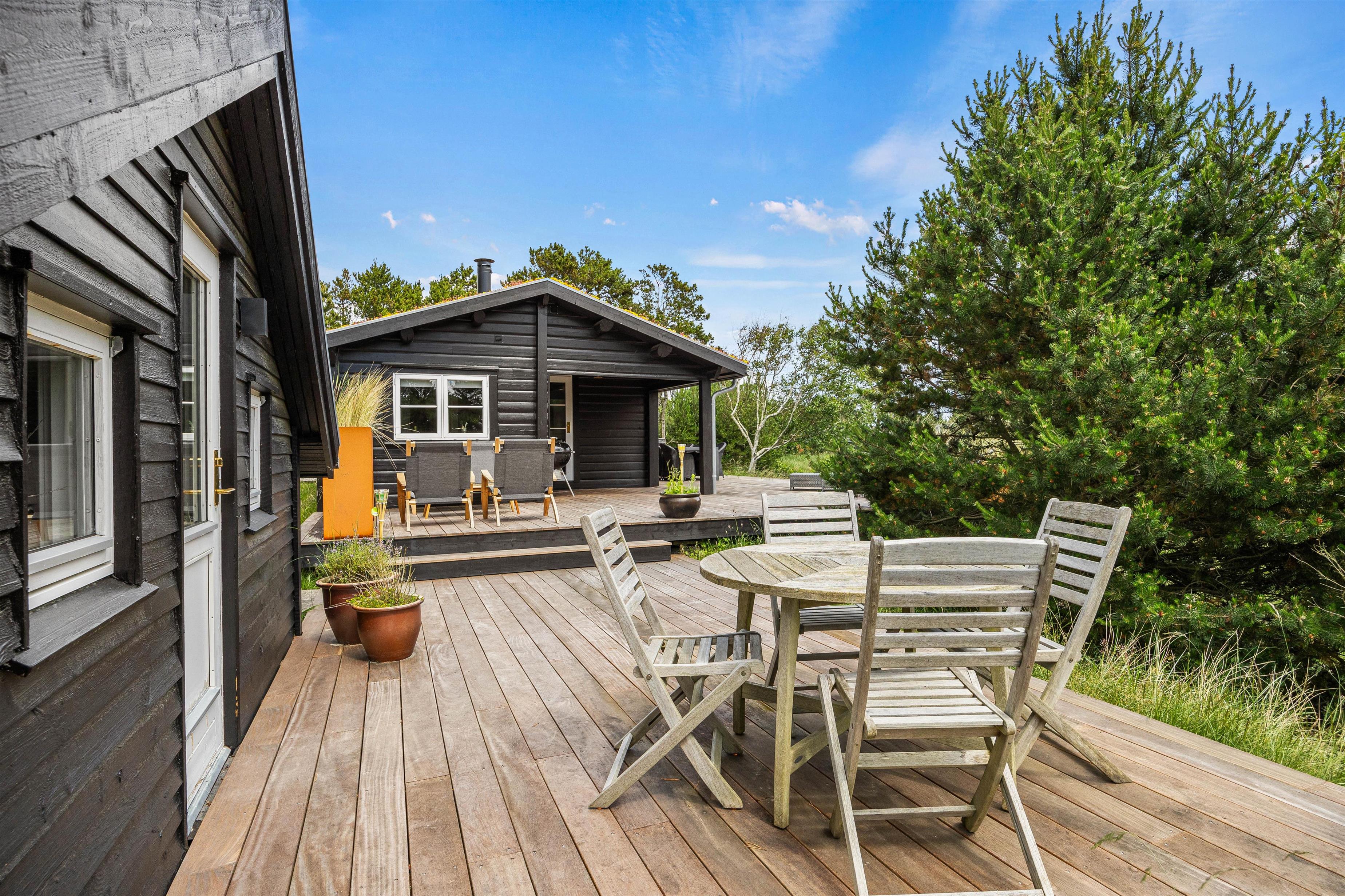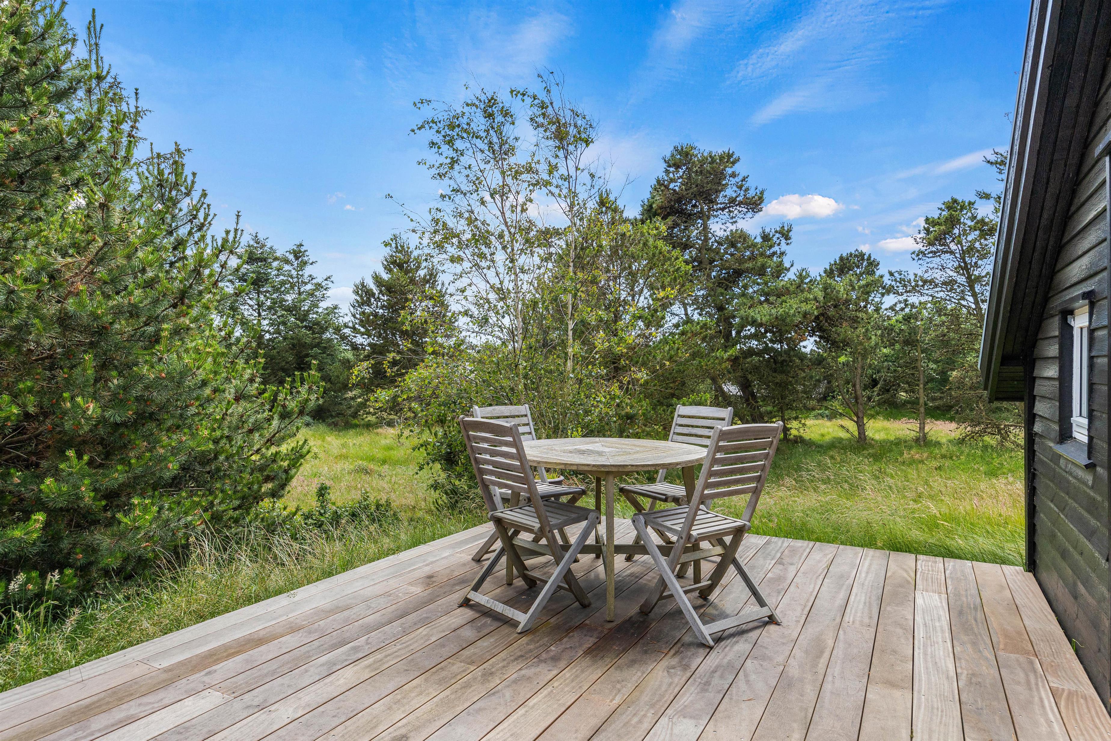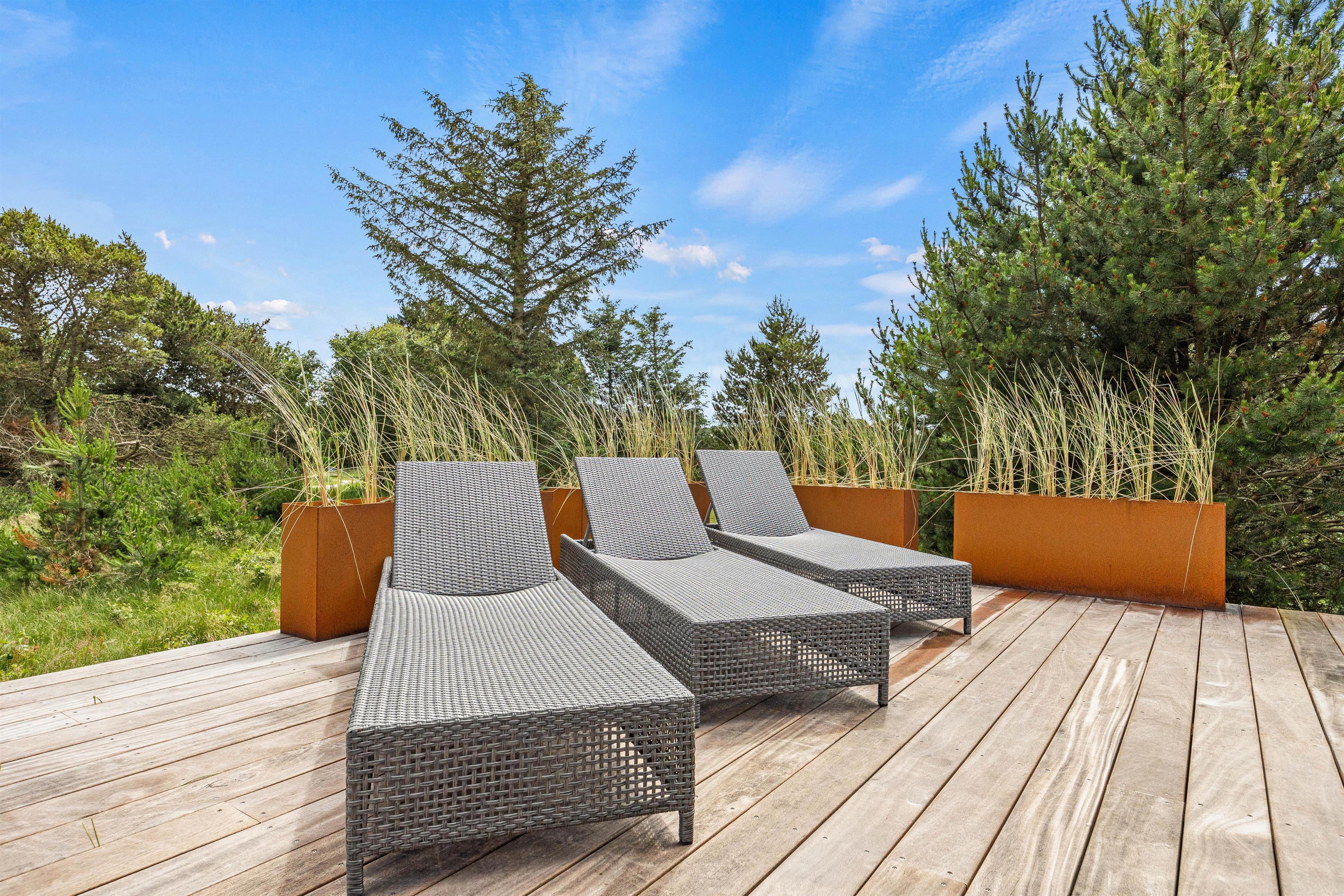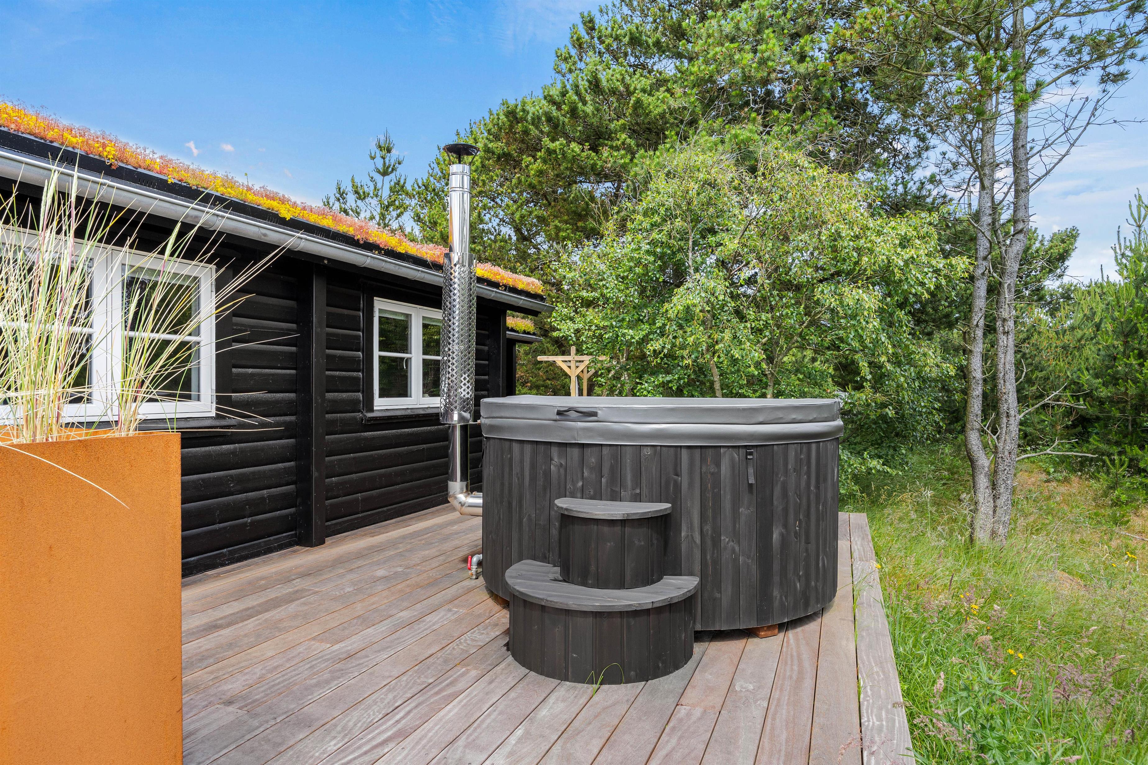 Feriehuset ligger let hævet på en klit. Det betyder, at du kan finde en god plads i solen omkring huset det meste af dagen. Der er skabt flere siddepladser på alle sider. På hovedterrassen er der havemøbler og liggestole, så I kan slappe af i solen. Under den overdækkede del af terrassen, kan du sætte dig godt til rette med en kop kaffe i loungemøblerne. Der er selvfølgelig også en grill, så grillmesteren kan få frit spil. Det udendørs boblebad opvarmes af en brændeovn, og her kan I slappe af i det varme vand under fri himmel hele året rundt.