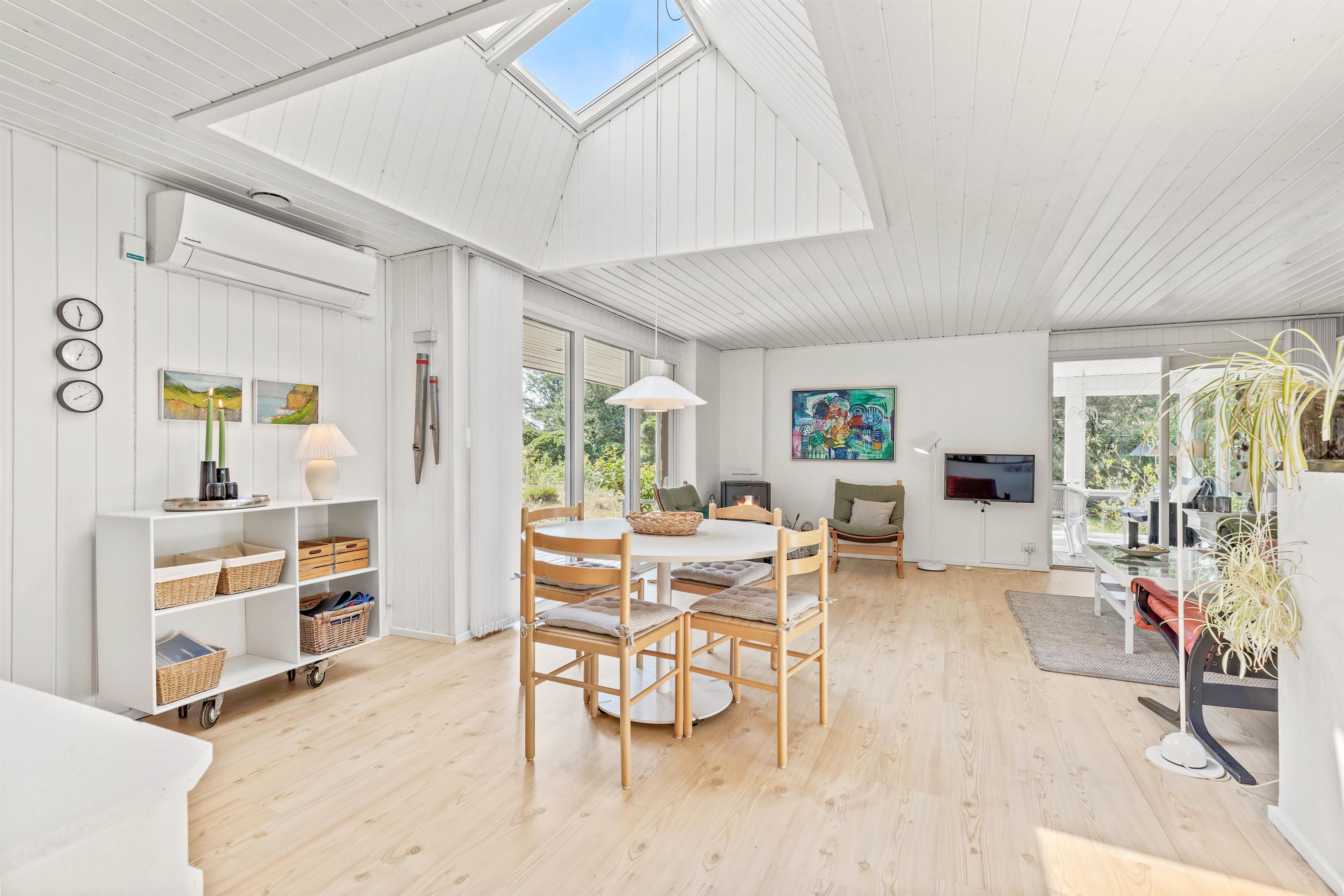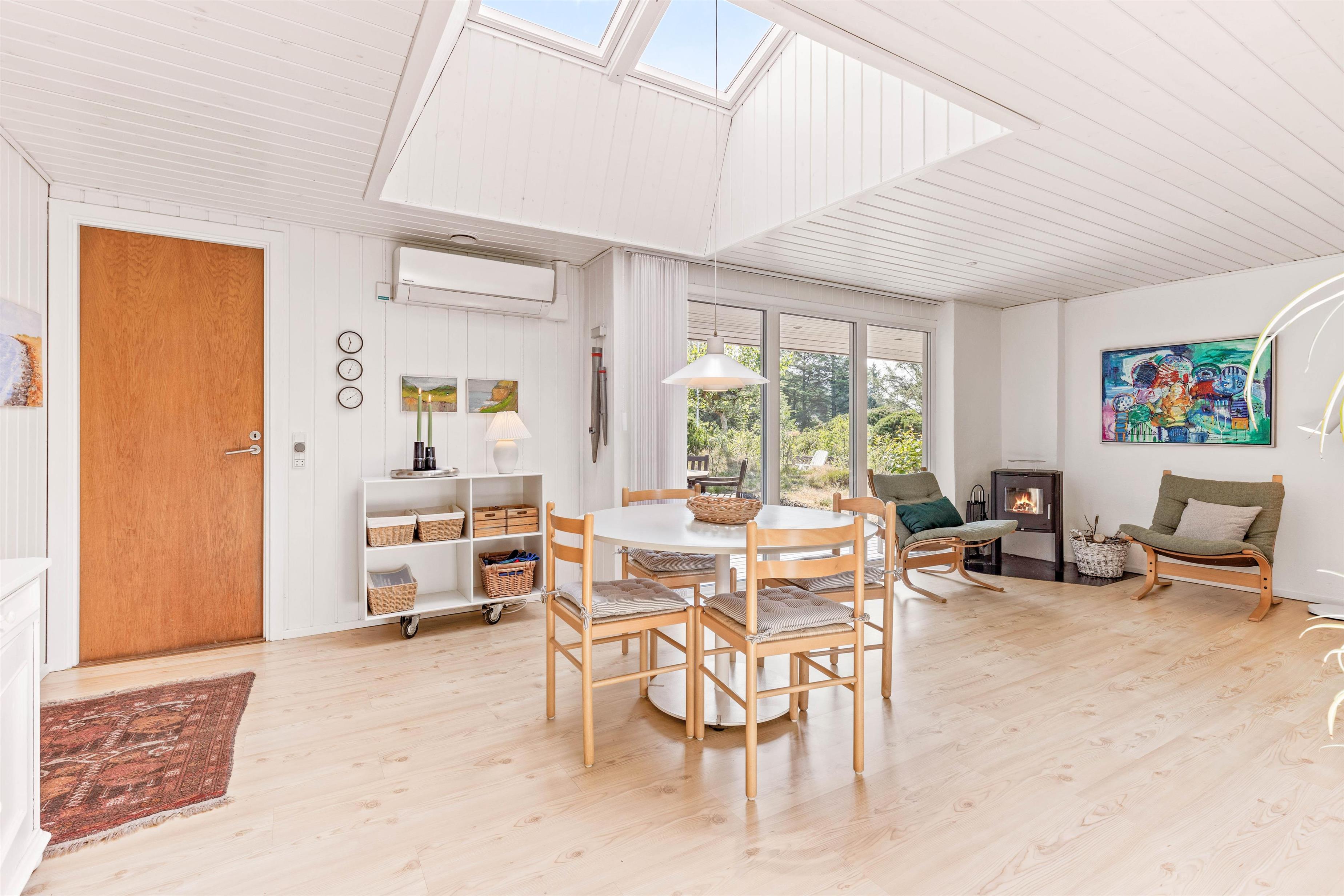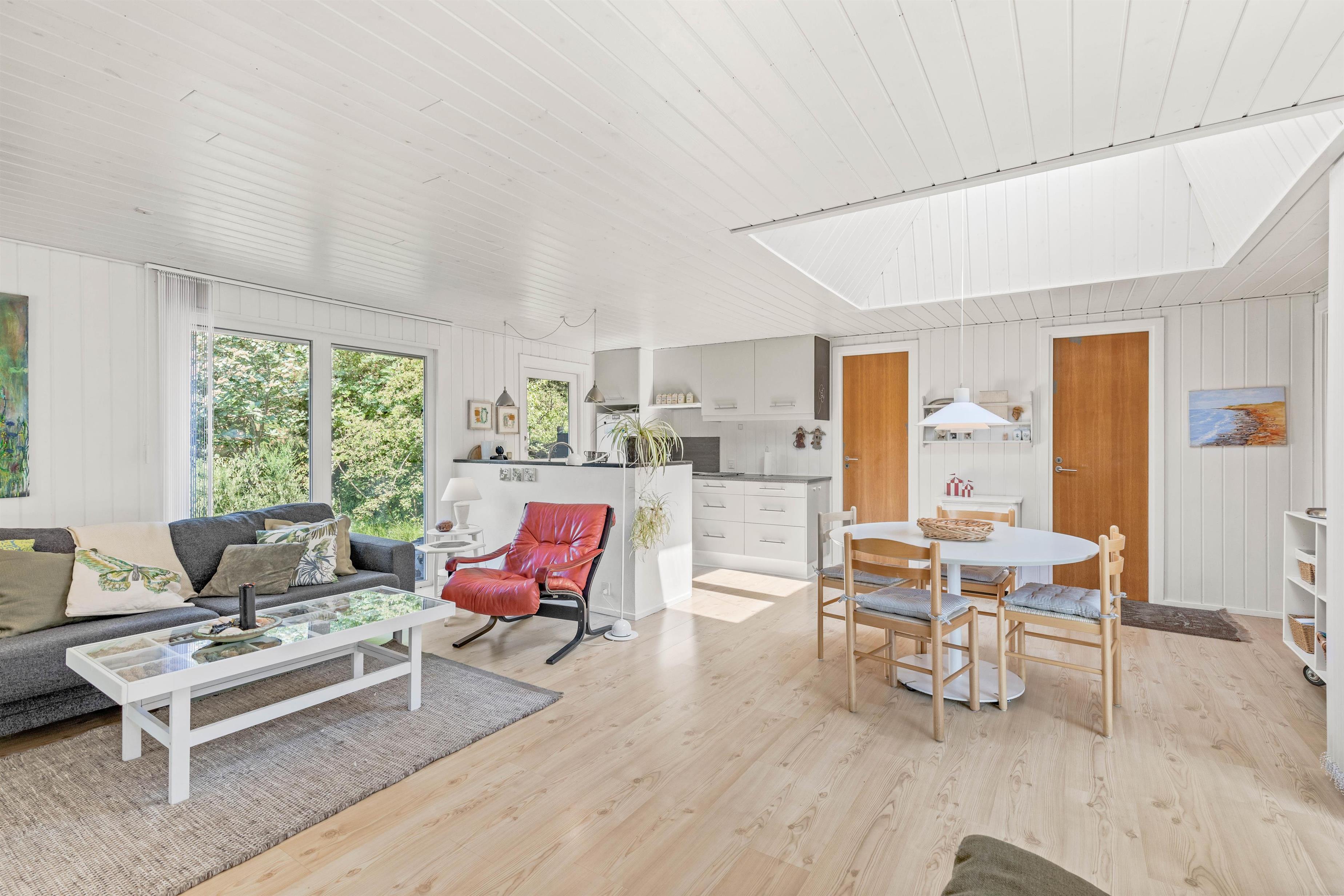 Imens ilden knitrer i brændeovnen og spæder varme og hygge, kan I slappe af i køkken-alrummet, sætte jer til rette i lædersofaen med en god bog eller sammen tilberede et lækkert måltid i det åbne køkken. Fine detaljer som lysskakten over spisebordet giver en dejlig atmosfære.