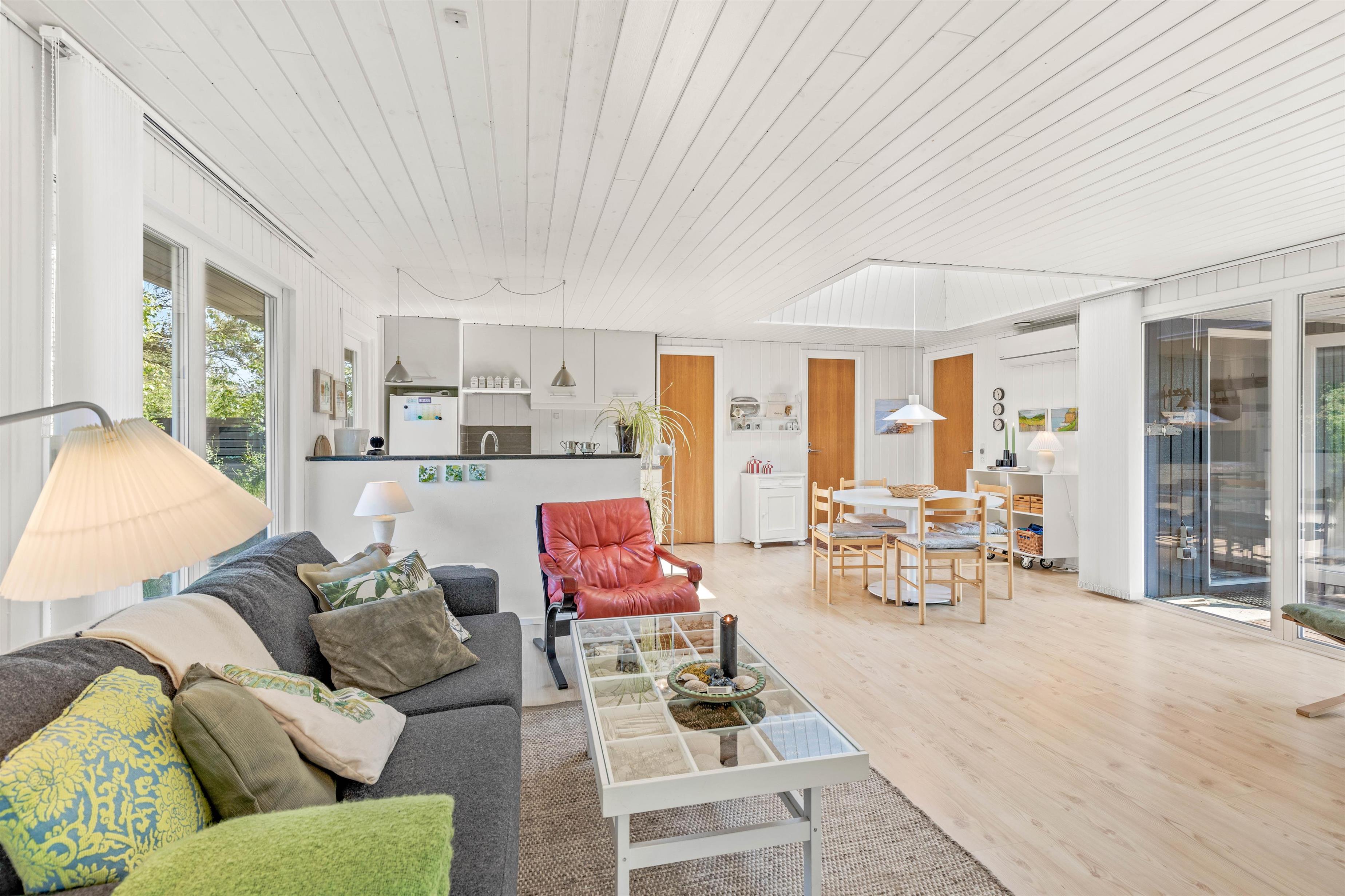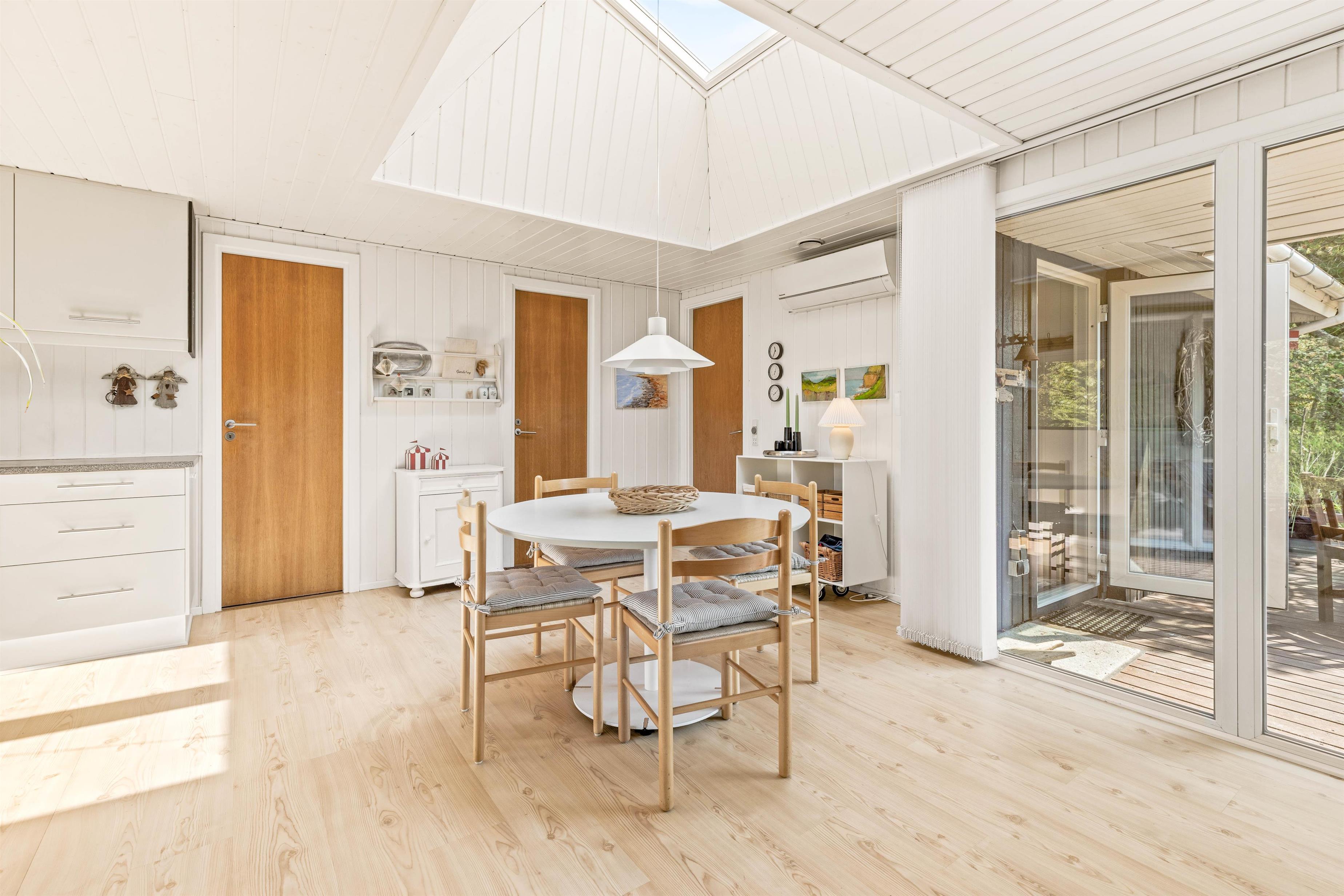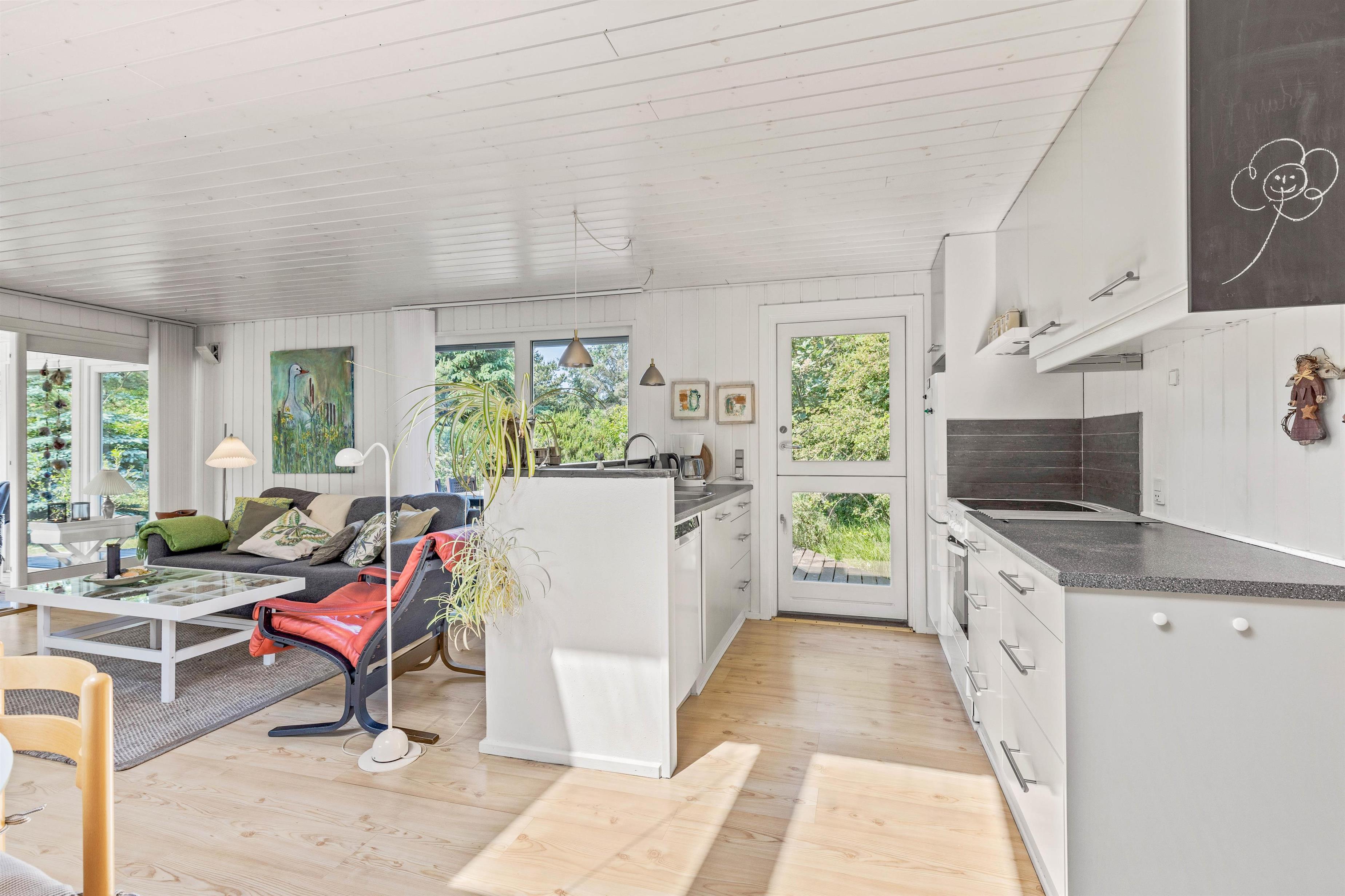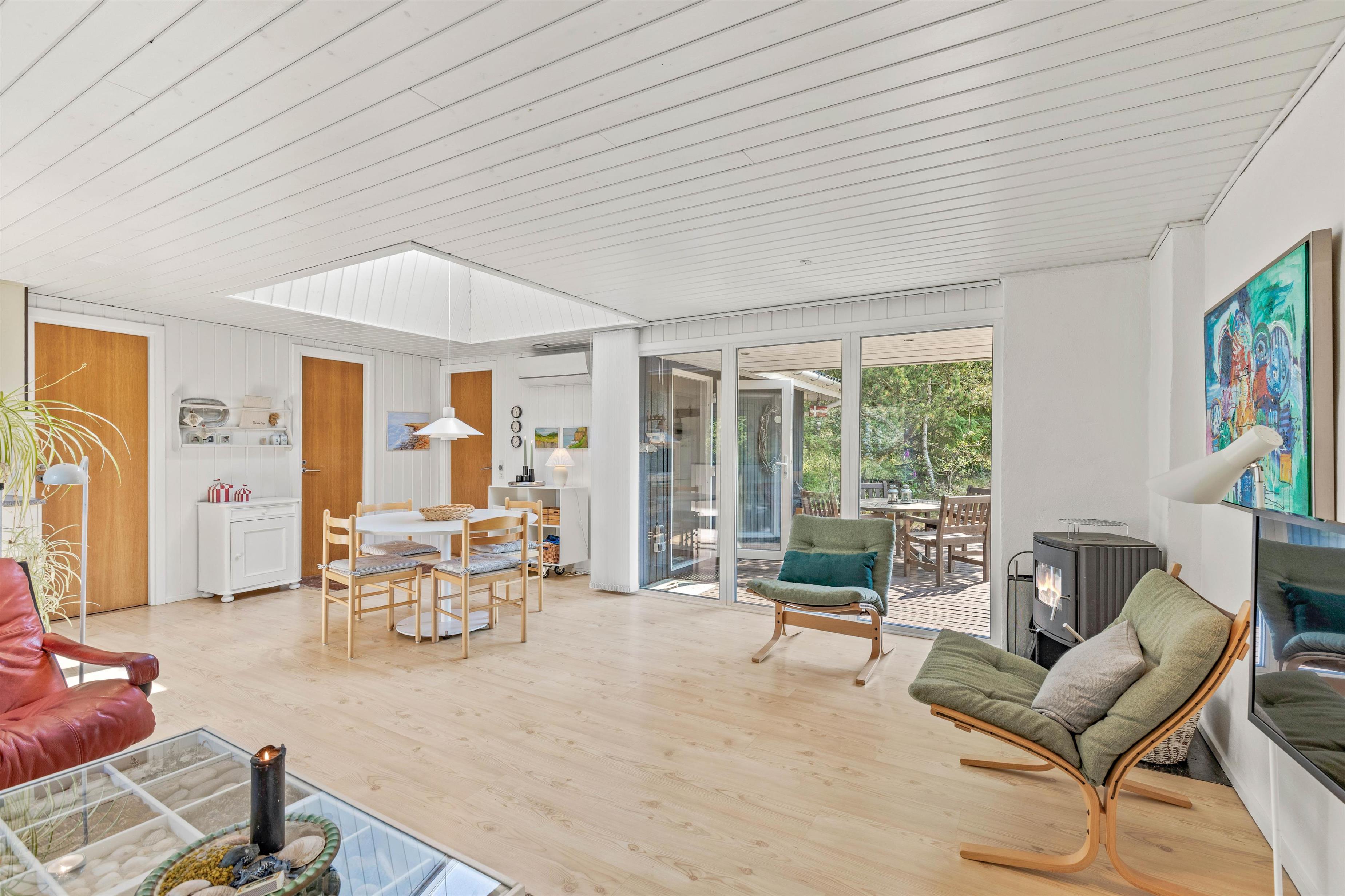 Imens ilden knitrer i brændeovnen og spæder varme og hygge, kan I slappe af i køkken-alrummet, sætte jer til rette i lædersofaen med en god bog eller sammen tilberede et lækkert måltid i det åbne køkken. Fine detaljer som lysskakten over spisebordet giver en dejlig atmosfære.