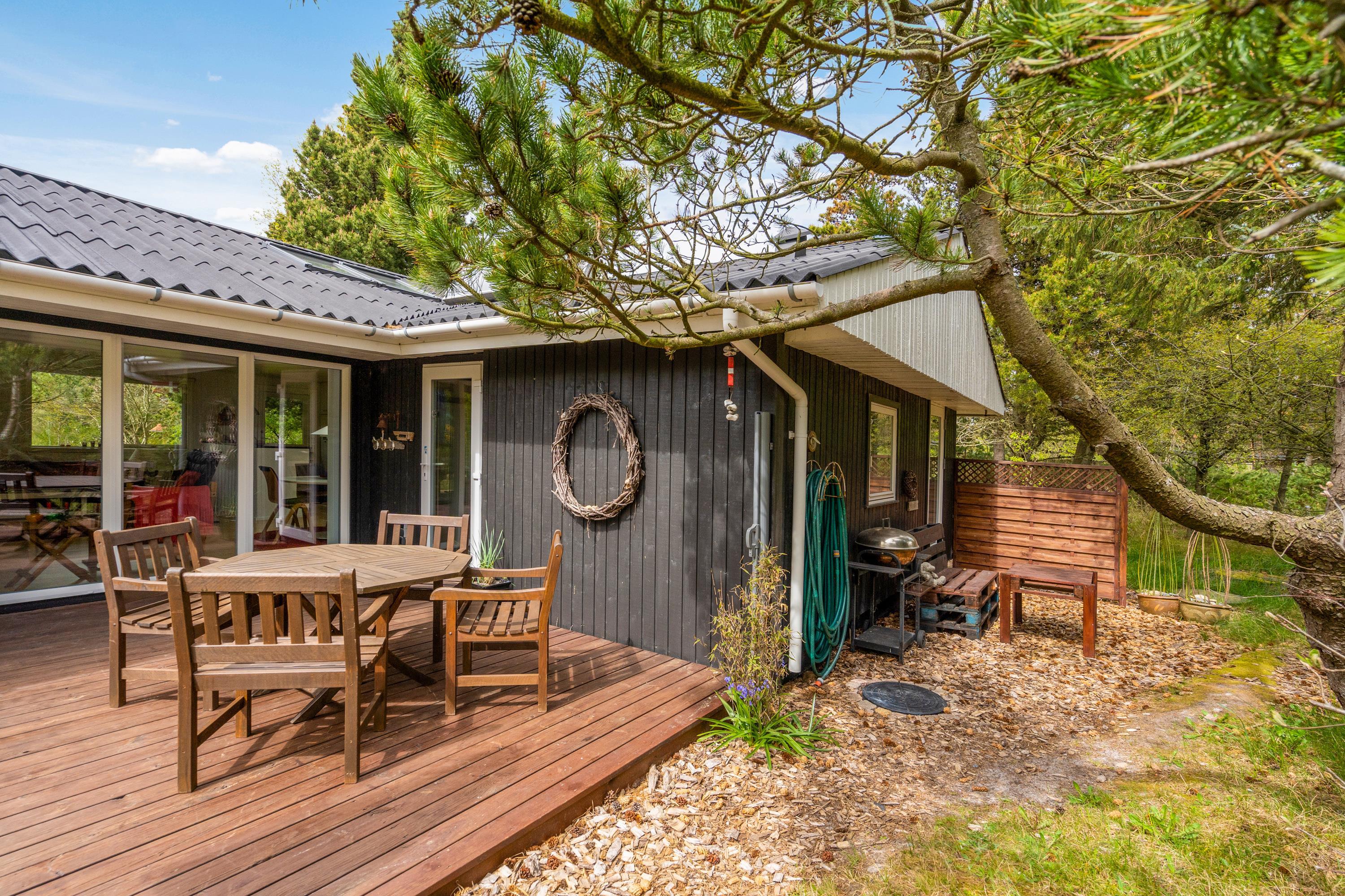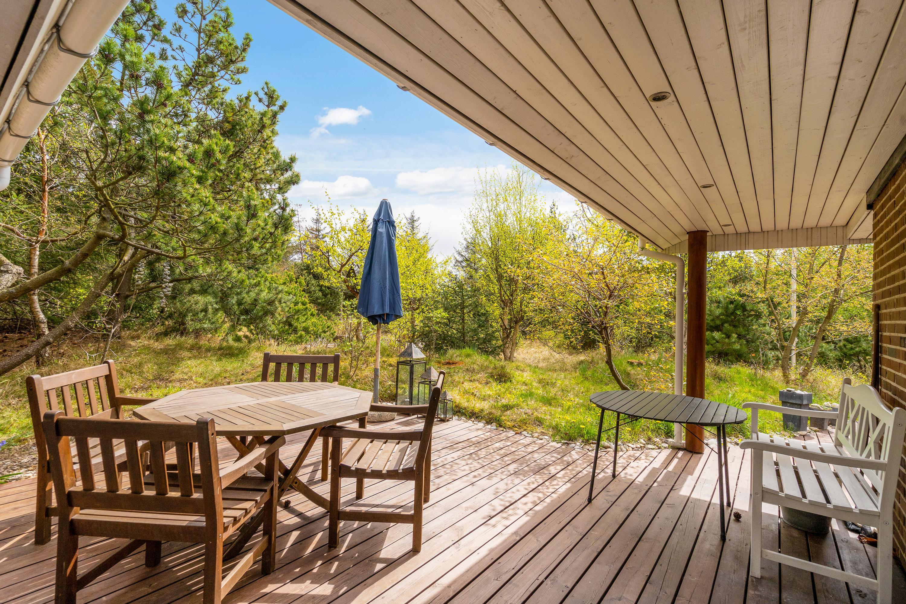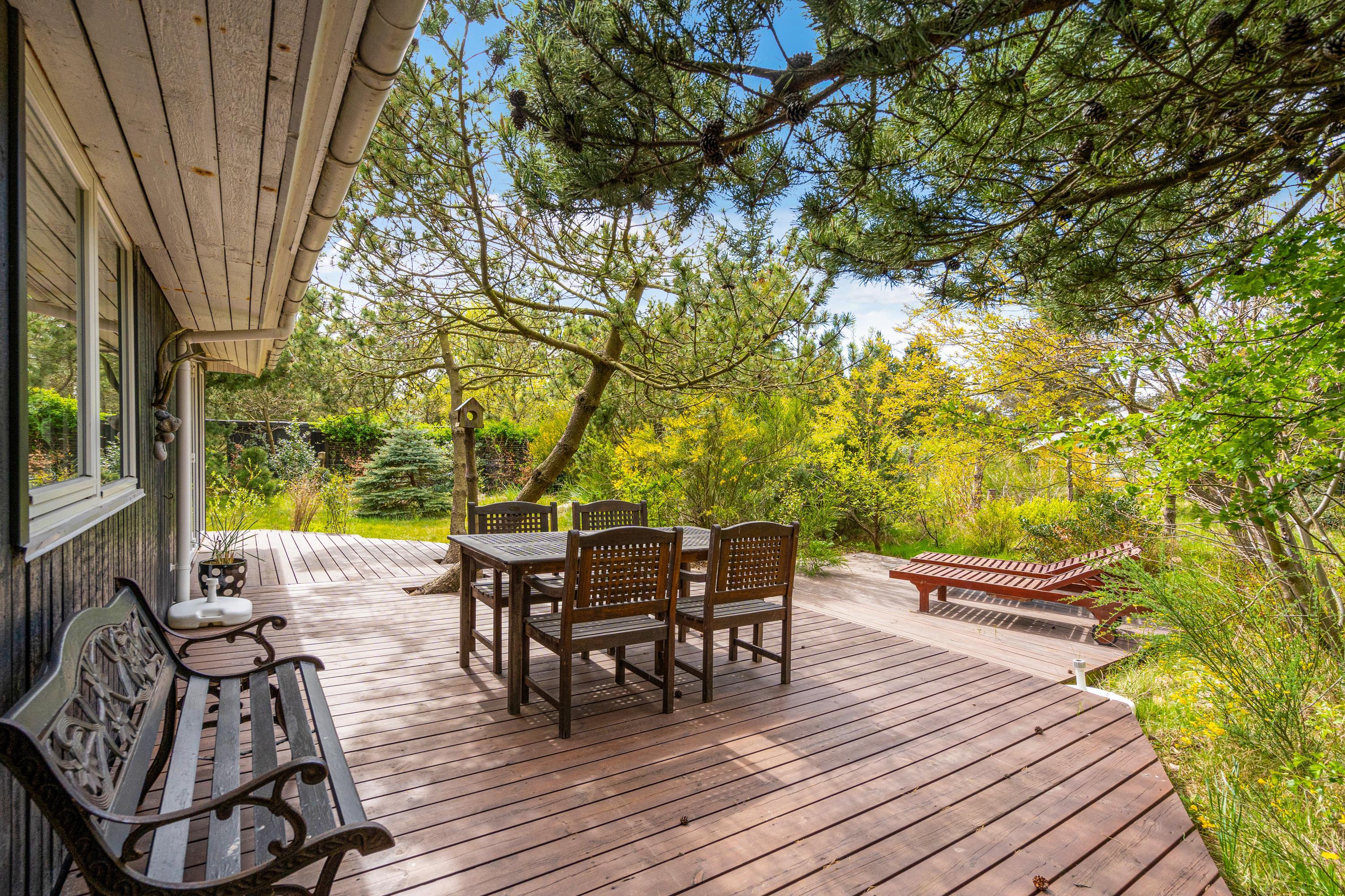 Både morgen og aften, - på Torskevej 22 kan du altid finde et godt sol- og læhjørne da huset har 3 delvist overdækkede terrasser. Lad børnene gå på opdagelse på den 2.400 m2 store naturgrund imens i hygger på terrasse og måske tænder op i grillen til en dejlig grillaften, men rødvin og snak.