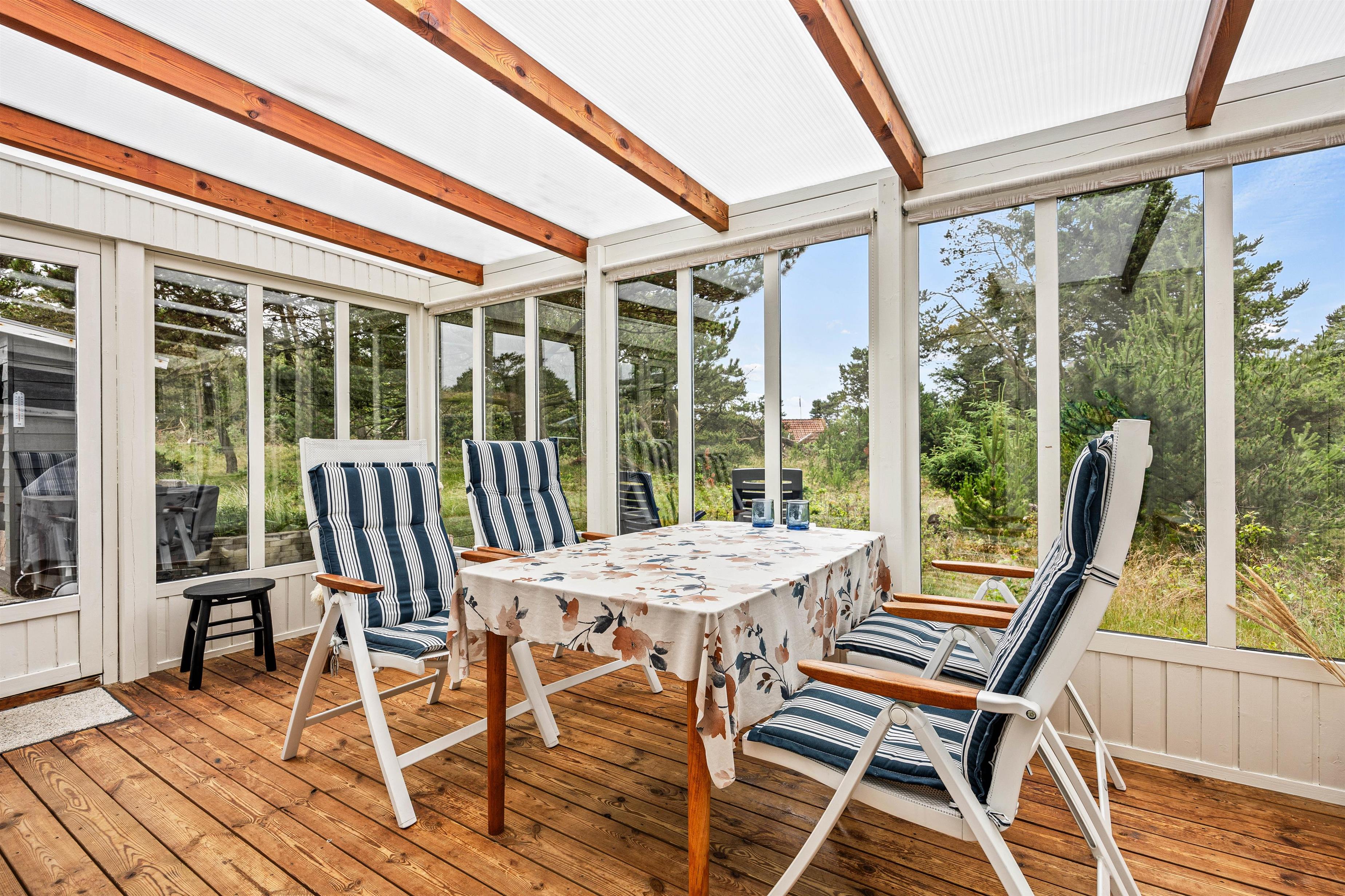 Stuen, som er indrettet i skandinavisk stil, ligger i forbindelse med udestuen. Især i foråret er udestuen et hit - her kan I fange de første solstråler i en behagelig temperatur med kortspil, eftermiddagskaffe og gode grin.