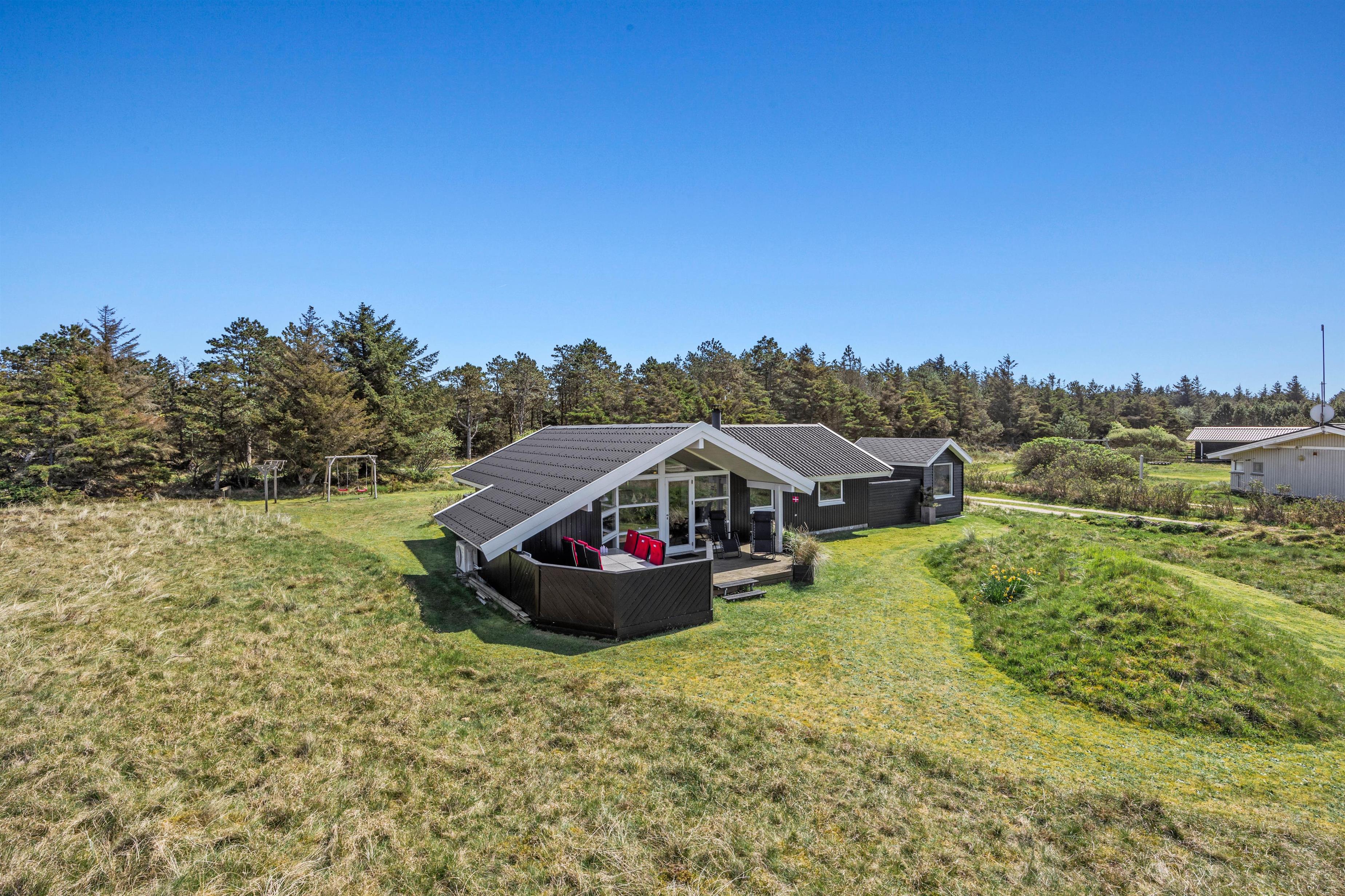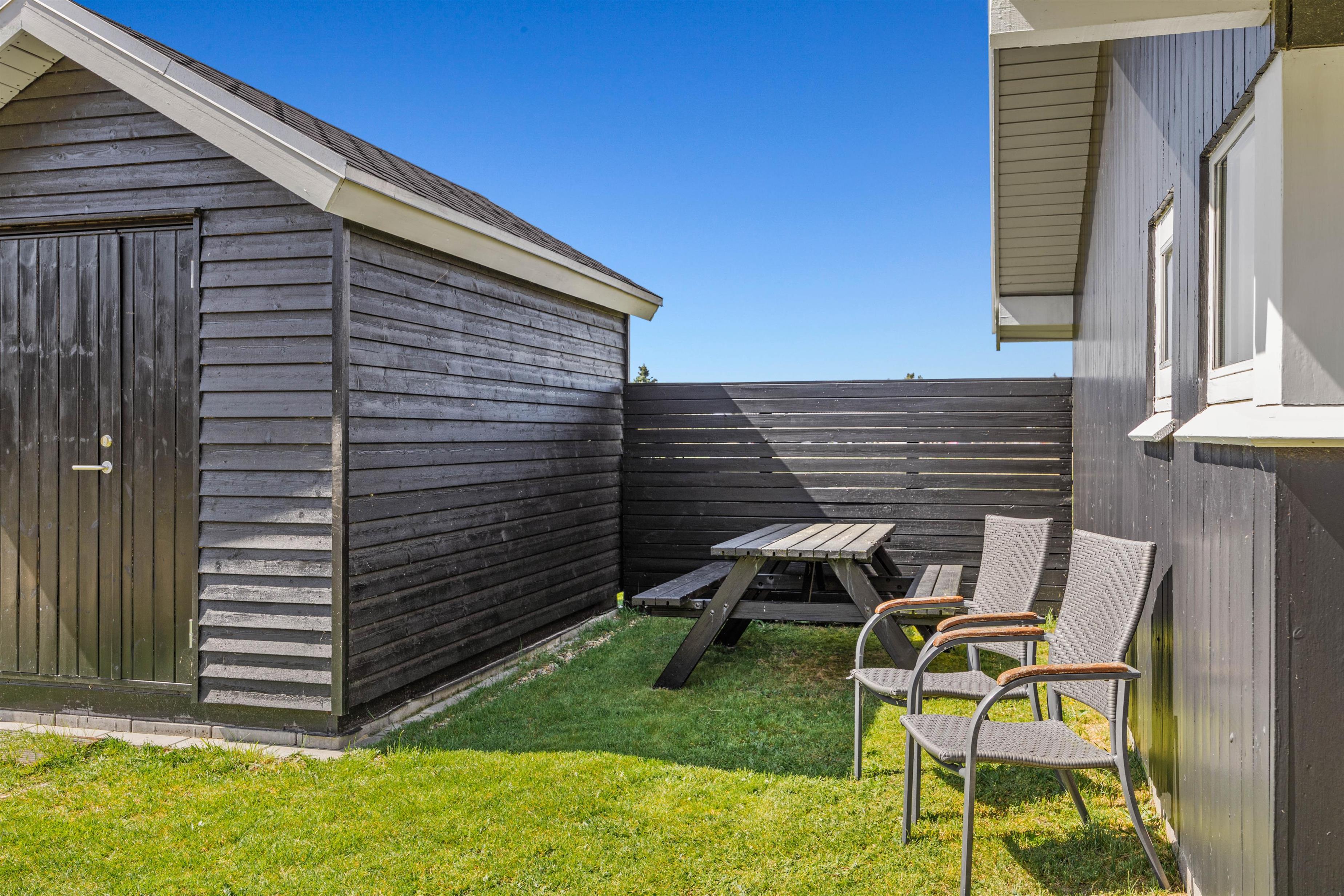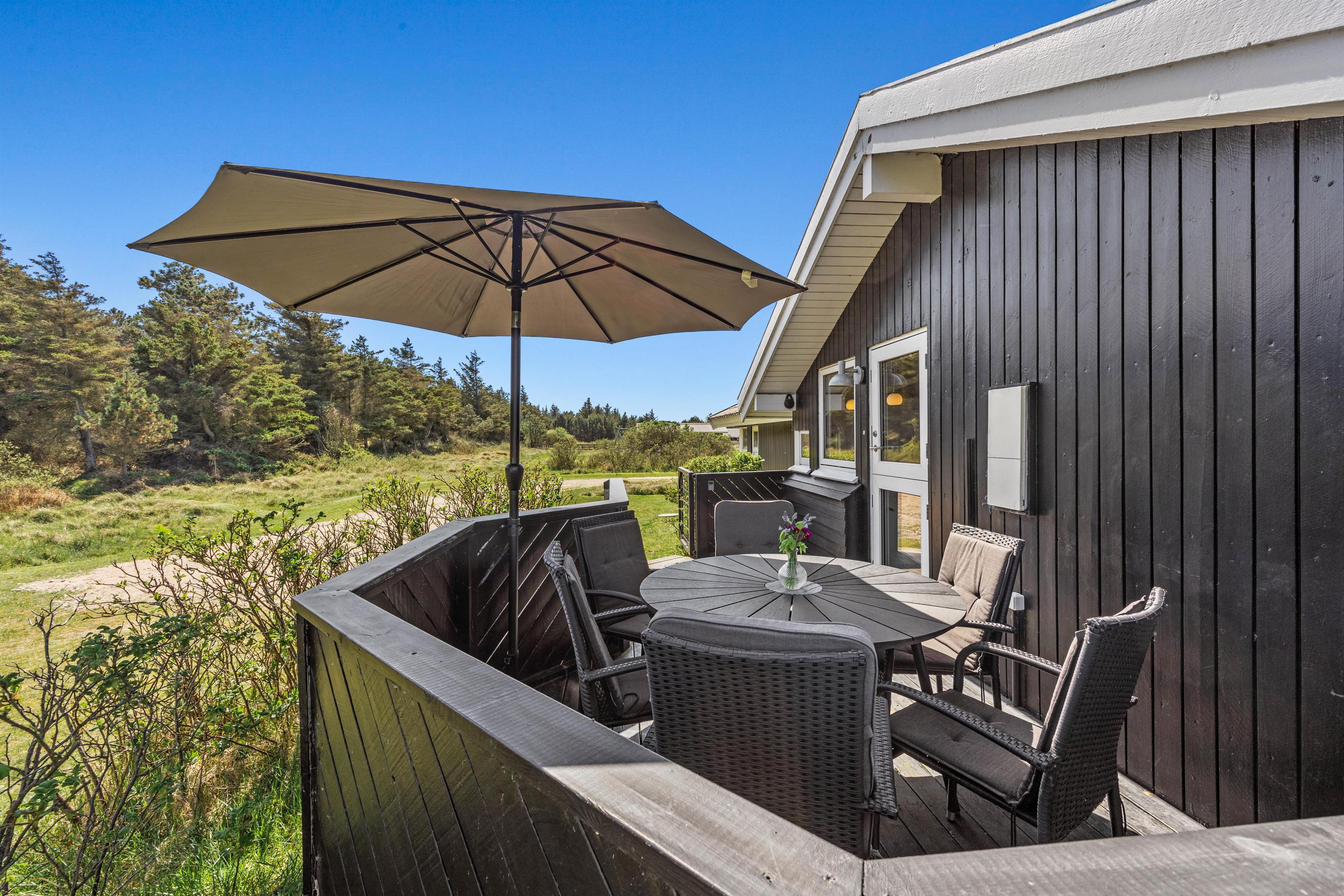Feriehuset er beliggende på en dejlig naturgrund, som grænser op til et stort grønt skovareal. Her har I rig mulighed for at nyde udelivet, uanset om I ønsker at nyde solen på den afskærmede terrasse eller holde en skøn grillaften på den overdækkede terrasse – mulighederne er mange!