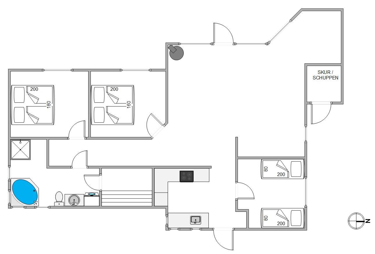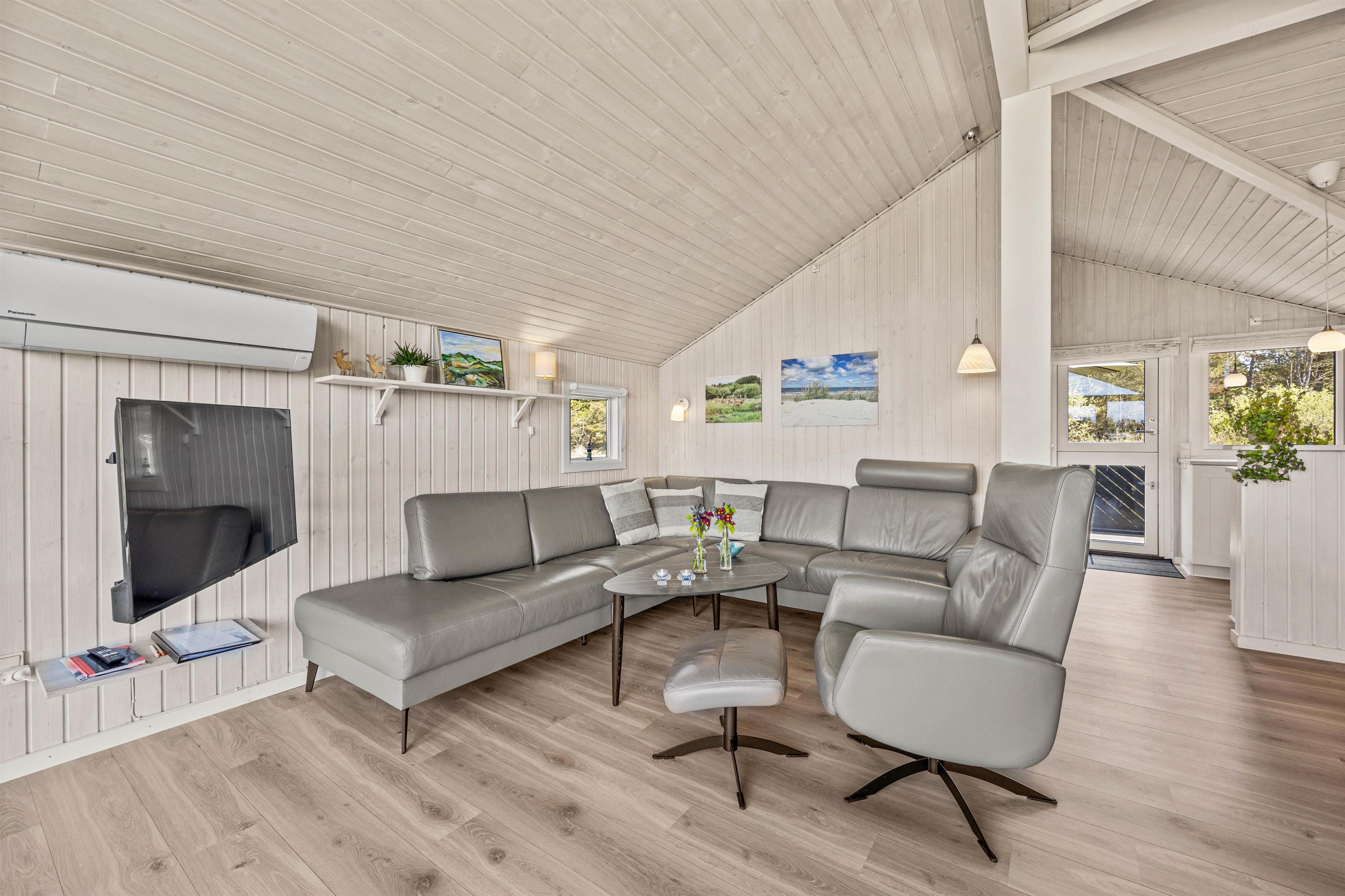 På badeværelset med gulvarme venter jer sauna og spa. Her er der mulighed for afslapning og børnene vil helt sikkert også elske at sidde i det varme vand. Udover badeværelset finder I også tre fine soveværelser – alle med gode senge og opbevaringsmulighed. Feriehuset er udstyret med både varmepumpe, opvaskemaskine og vaskemaskine til at klare de huslige pligter.