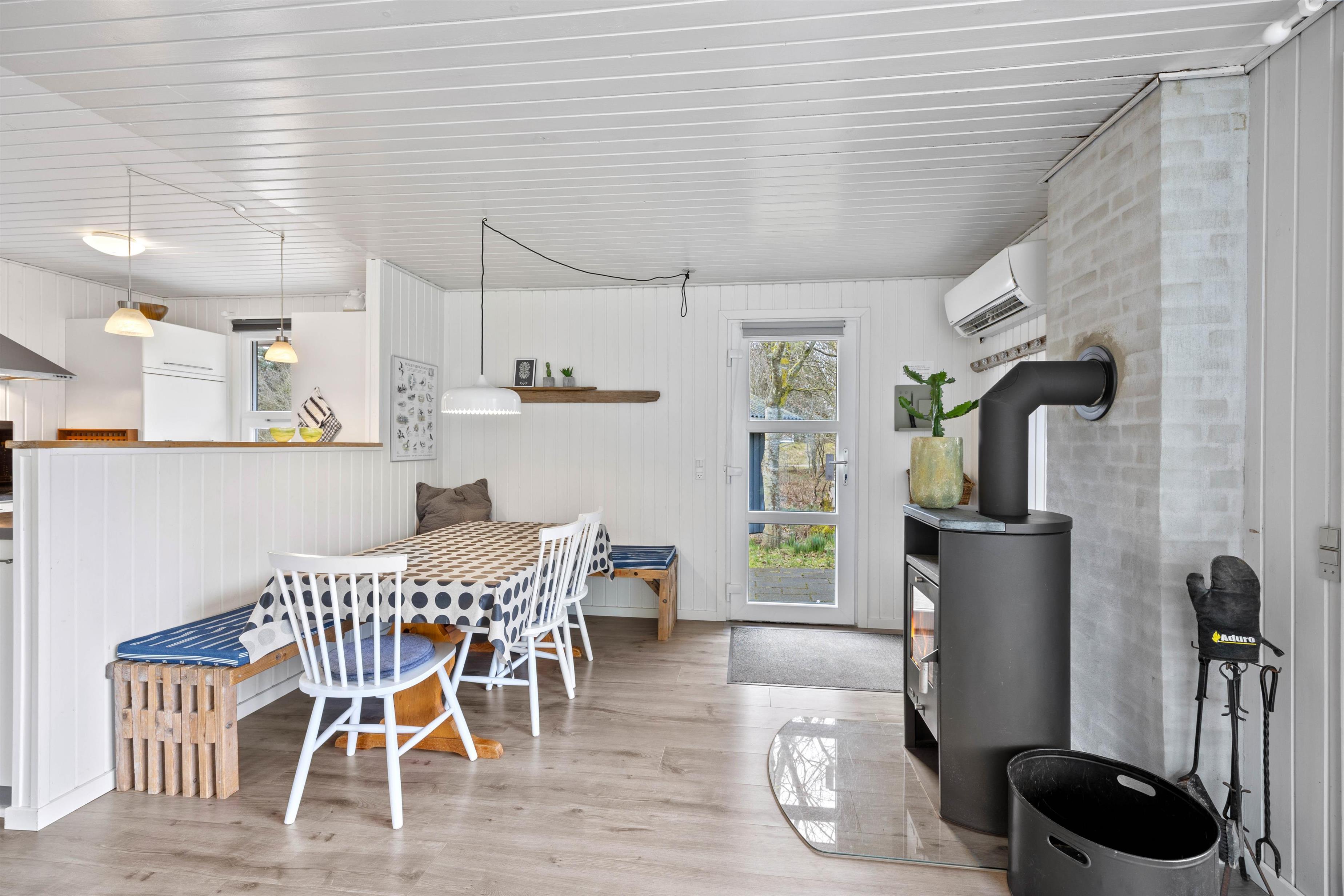 I feriehuset på Engesøvej 64 kan I glemme hverdagens stress. Det åbne køkken-alrum i forbindelse med opholdsstuen er feriehusets naturlige samlingspunkt. I det velassorterede køkken kan I tilberede lækre måltider og eventuelt lave en fælles madlavningsaften. Ved spisebordet kan I dække hyggeligt op til middagen, eller I kan spille brætspil. Senere kan I trække jer tilbage til udestuen, som er indrettet med behagelige siddepladser. Brændeovnen i stuen er placeret således, at varmen derfra kommer både spisepladsen og sofagruppen til gode.