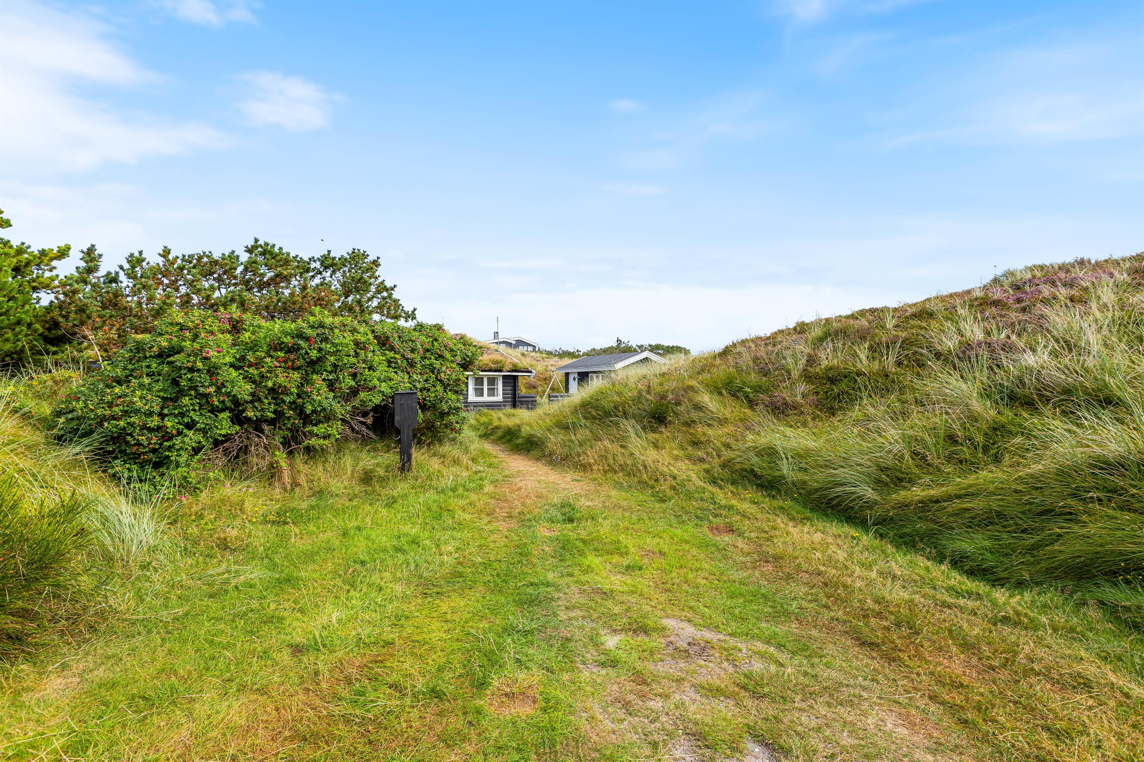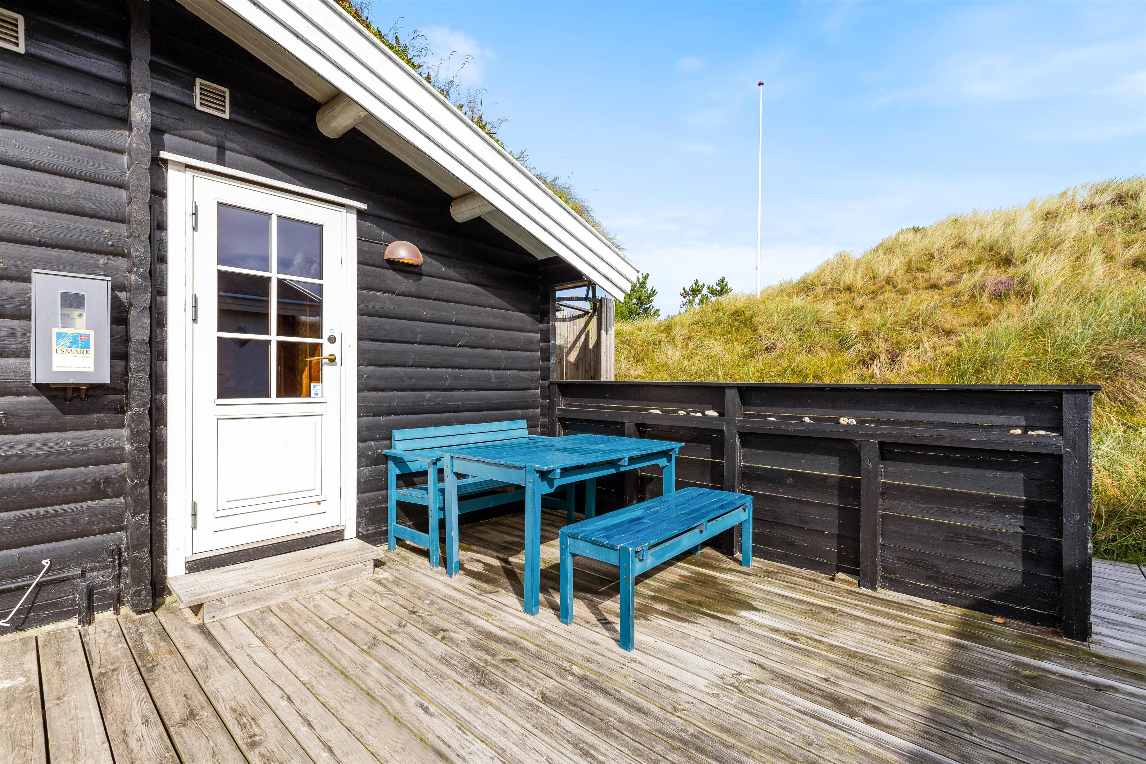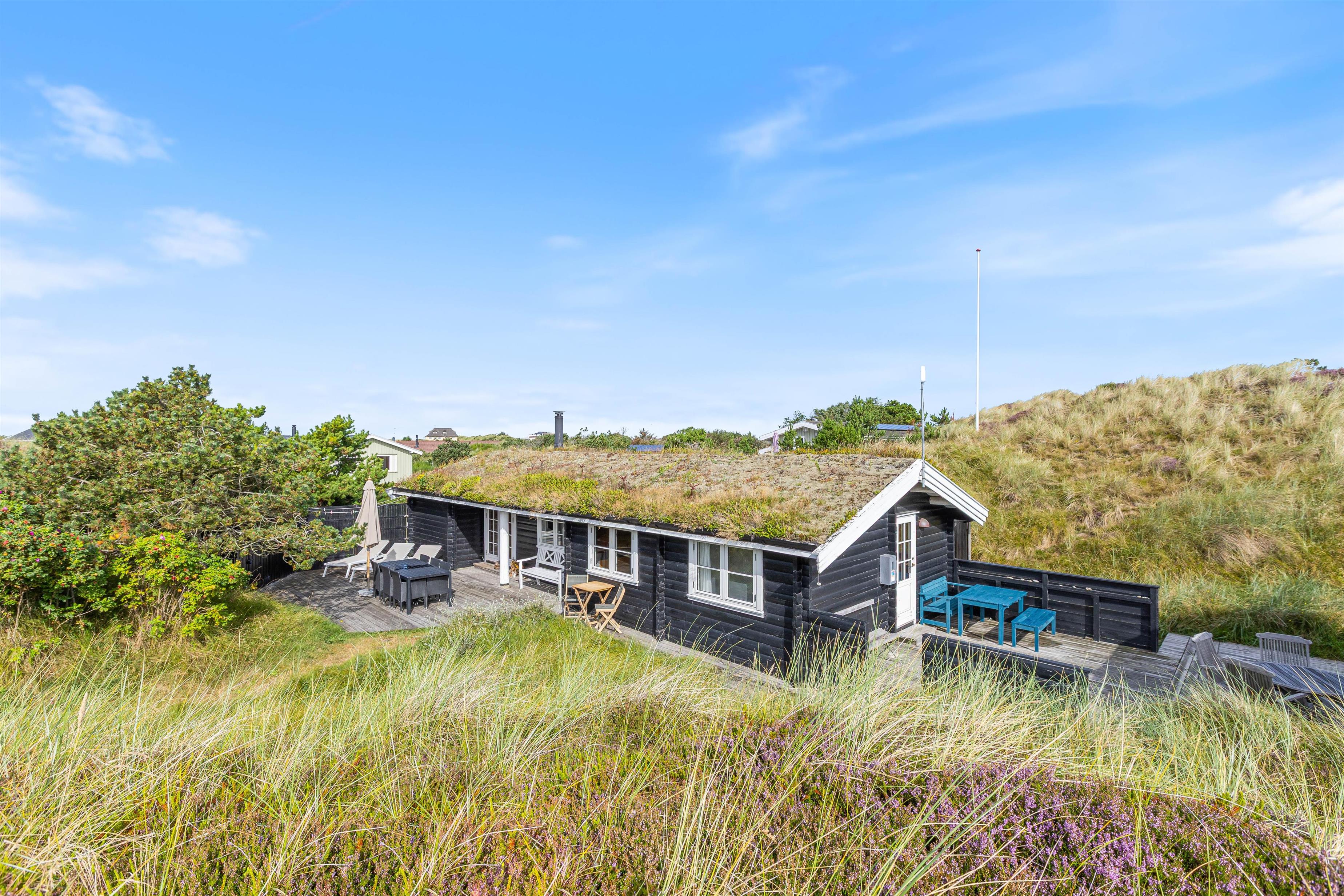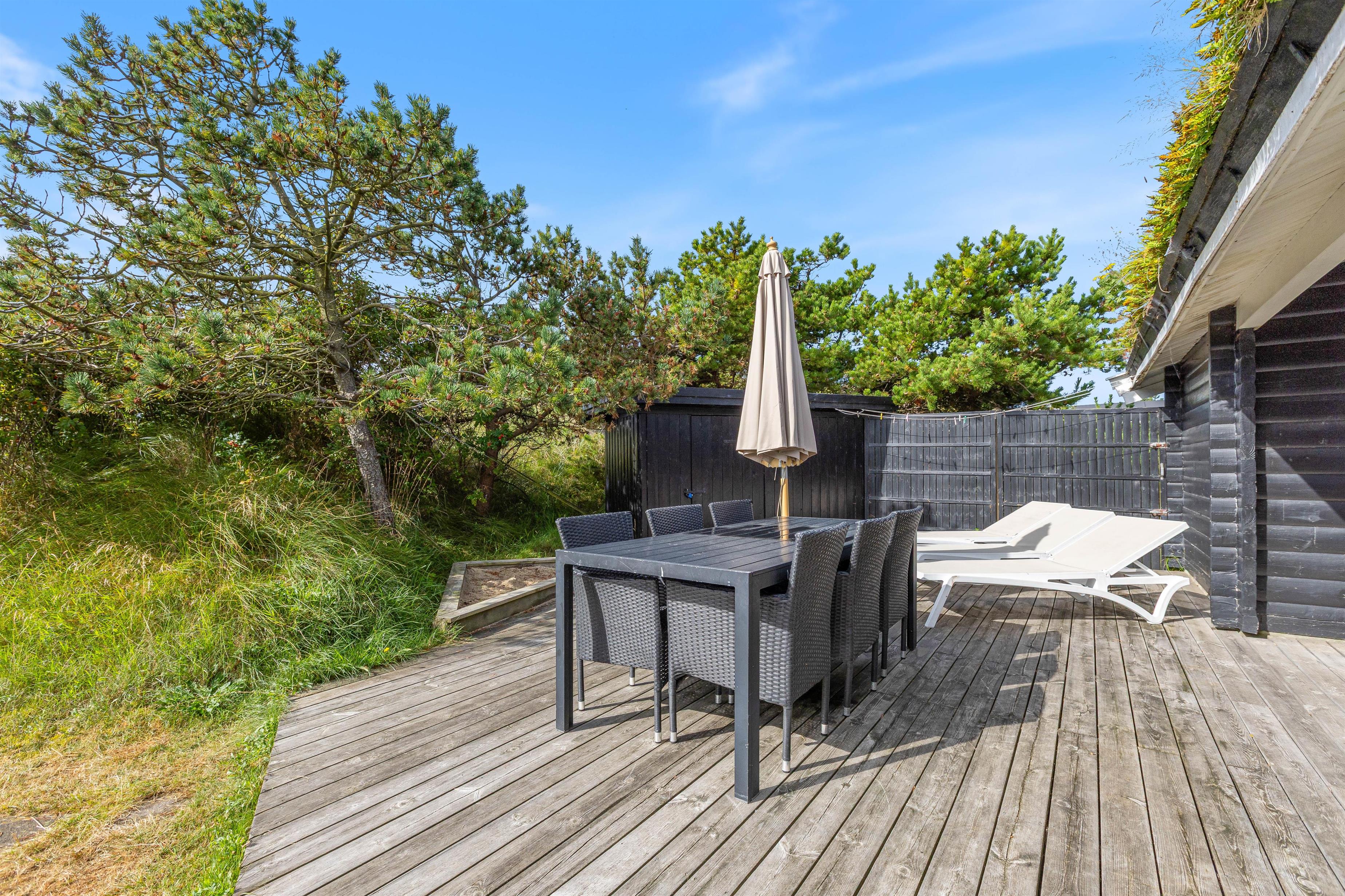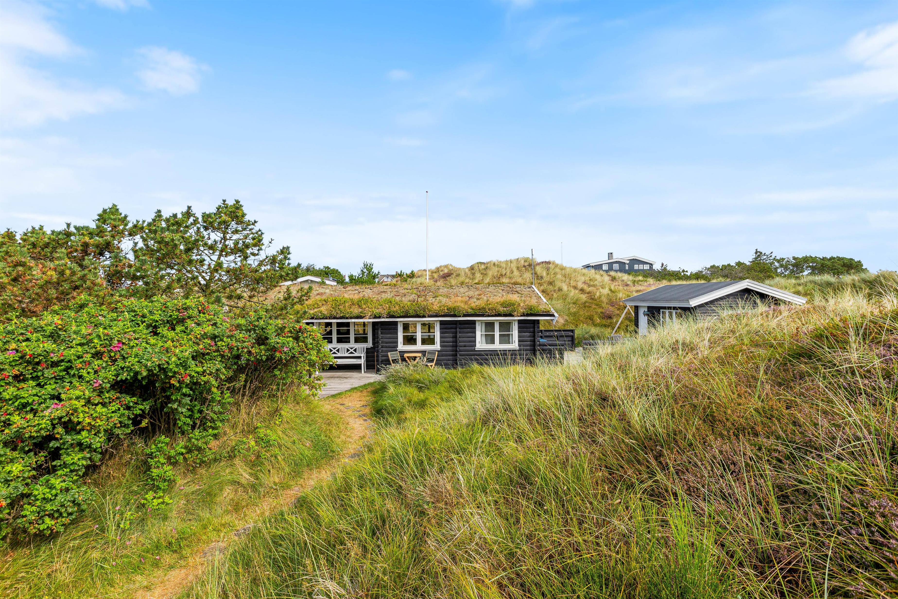 Selvom sommerhuset kun ligger 400 meter fra Vesterhavets bølger, ligger husets terrasser ugeneret og i læ for vinden. Sommerhuset ligger nemlig bag en lille forhøjning i landskabet, som skærmer for vinden.