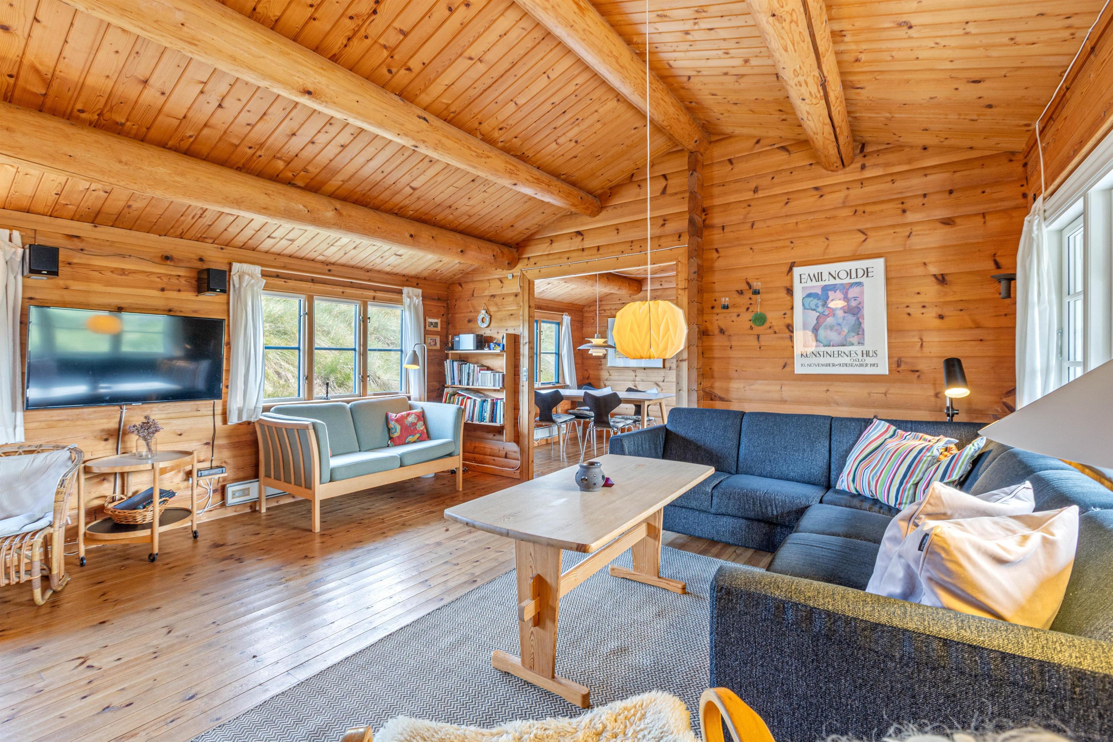 Bjælkehusstemningen fortsætter indenfor i indretningen, hvor de rå og naturfarvede bjælker skaber en varm og hyggelig atmosfære. Huset er indrettet med gode møbler, der forstærker den hjemlige sommerhusstemning.